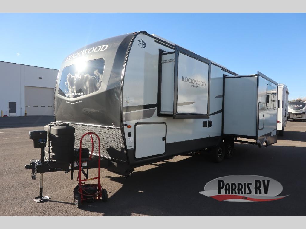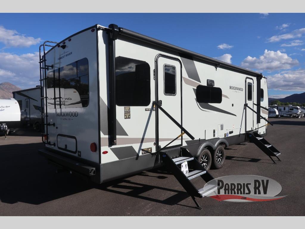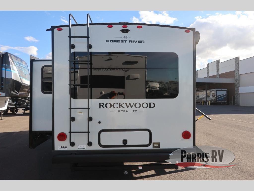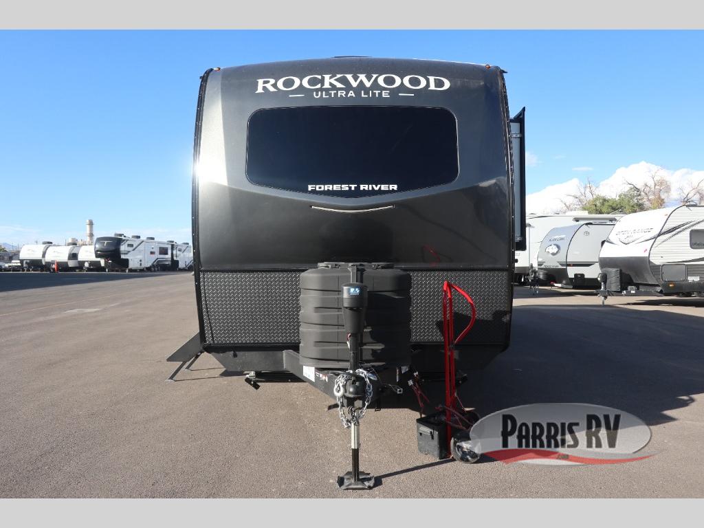 Each Rockwood Ultra Lite travel trailer by Forest River includes superior construction with a high gloss fiberglass cap, aluminum cage construction, and a power awning with LED lighting for a cozy and functional outdoor space. The torsion axle, power tongue jack will make towing smooth and hassle-free, along with the nitrogen filled, Goodyear Endurance tires and the tire pressure monitor system. Interior comforts include  kitchen sink with high rise faucet, hidden hinge cabinet doors, and roller shades to name a few. Choose a Rockwood Ultra Lite travel trailer today!