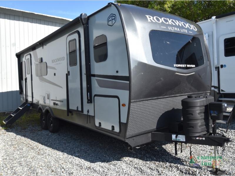 Each Rockwood Ultra Lite travel trailer by Forest River includes superior construction with a high gloss fiberglass cap, aluminum cage construction, and a power awning with LED lighting for a cozy and functional outdoor space. The torsion axle, power tongue jack will make towing smooth and hassle-free, along with the nitrogen filled, Goodyear Endurance tires and the tire pressure monitor system. Interior comforts include kitchen sink with high rise faucet, hidden hinge cabinet doors, and roller shades to name a few. Choose a Rockwood Ultra Lite travel trailer today!