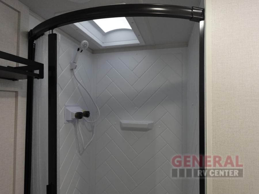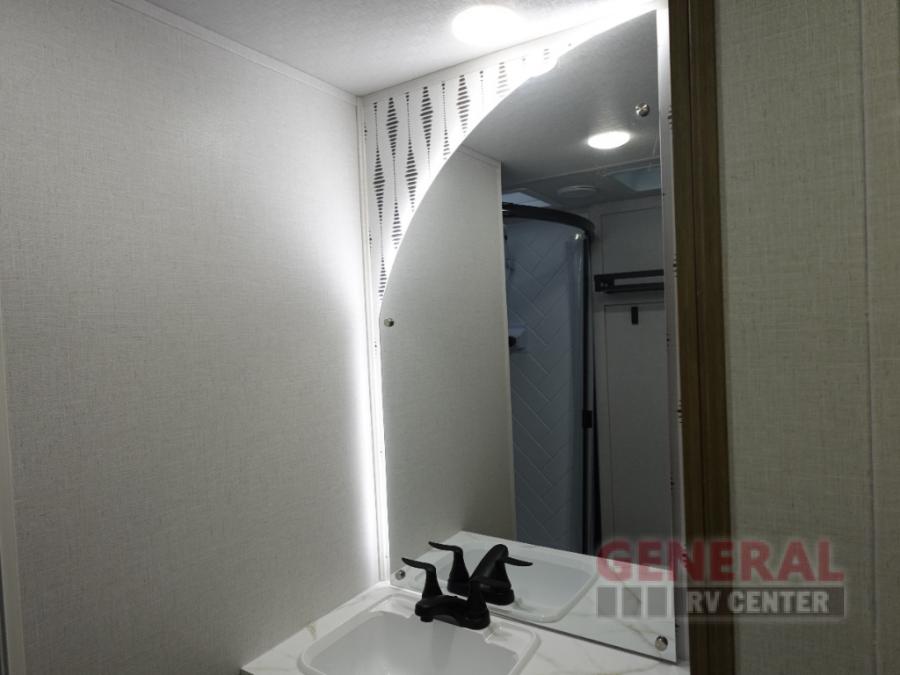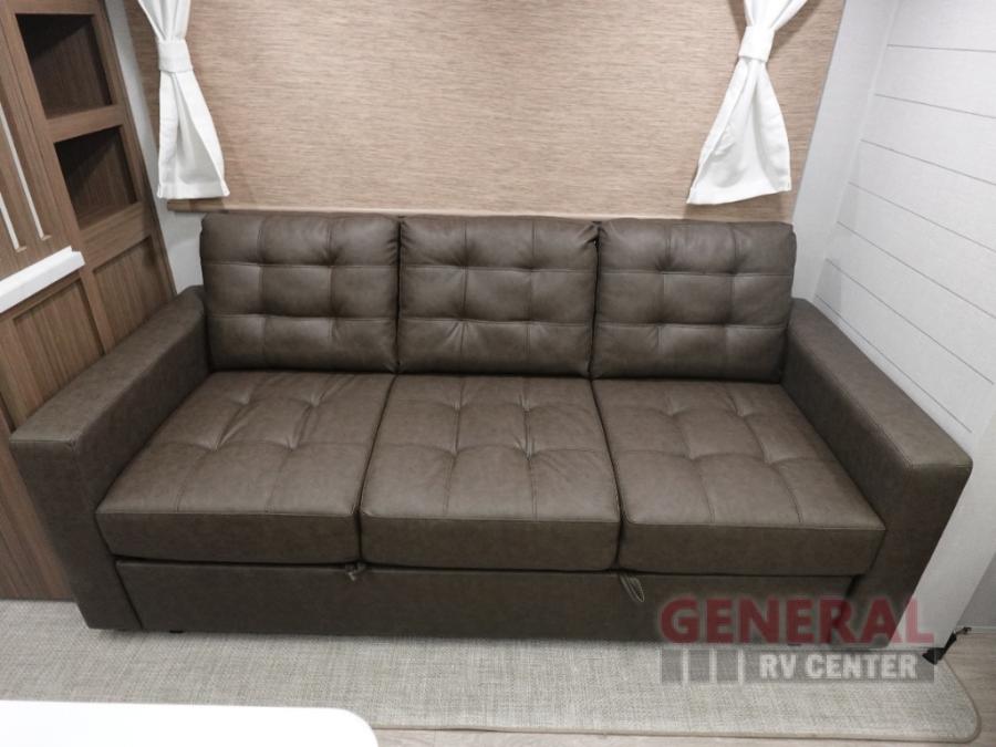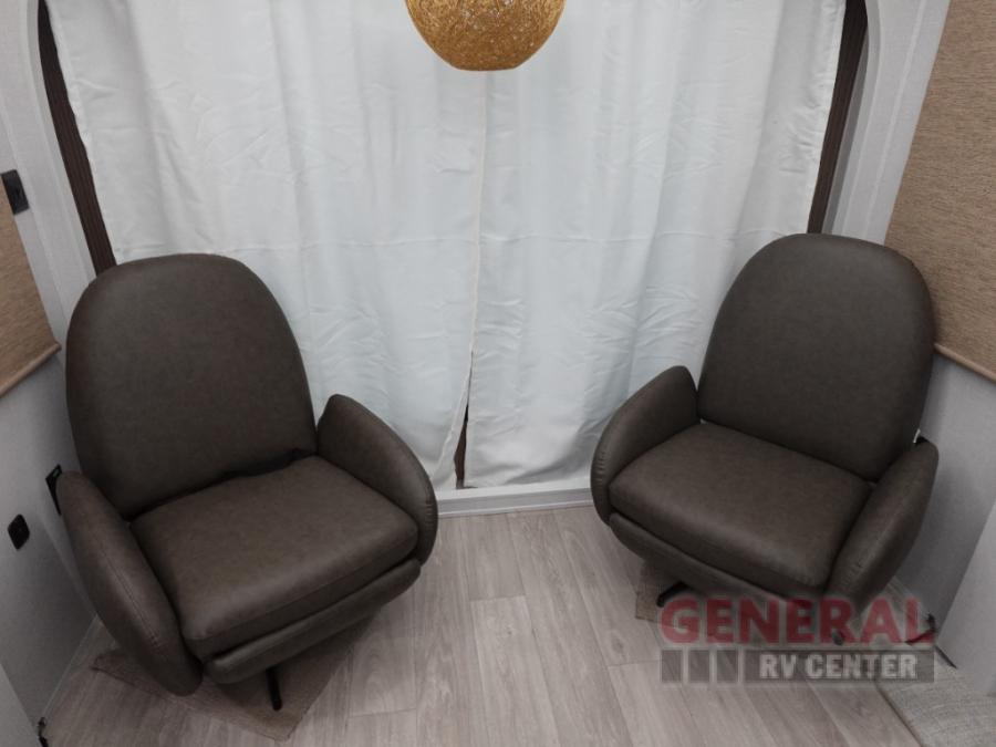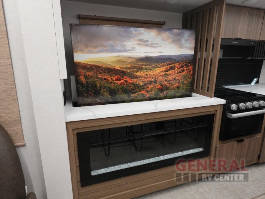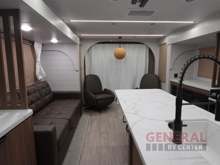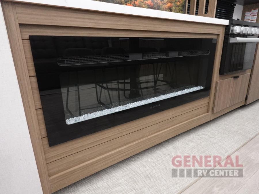 Find your zen int this spacious travel trailer for four! Once you've unloaded your gear, you can head inside to make lunch at the kitchen island with four chairs. An 80" trundle sofa provides additional seating space plus sleeping space for guests. You will love the rear custom recliners that are conveniently located next to the fireplace. The full bath is located towards the front next to the private bedroom so you can easily use the restroom at night, and you're sure to get a great night's rest on the custom king bed with Versa Tilt. This unit also includes washer and dryer prep, giving you the option to add these appliances.