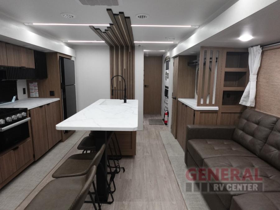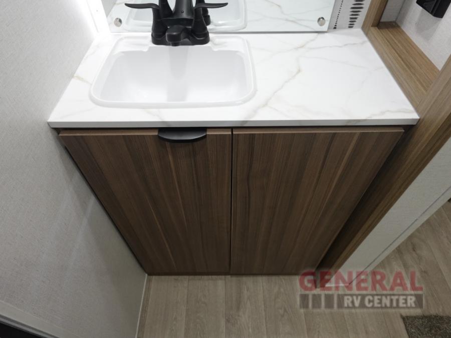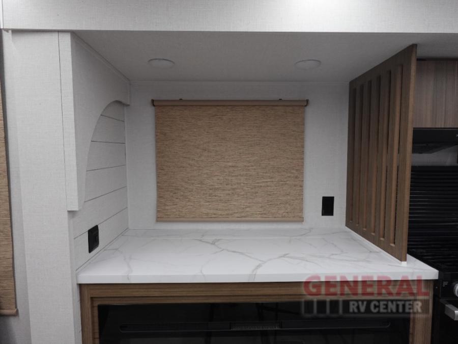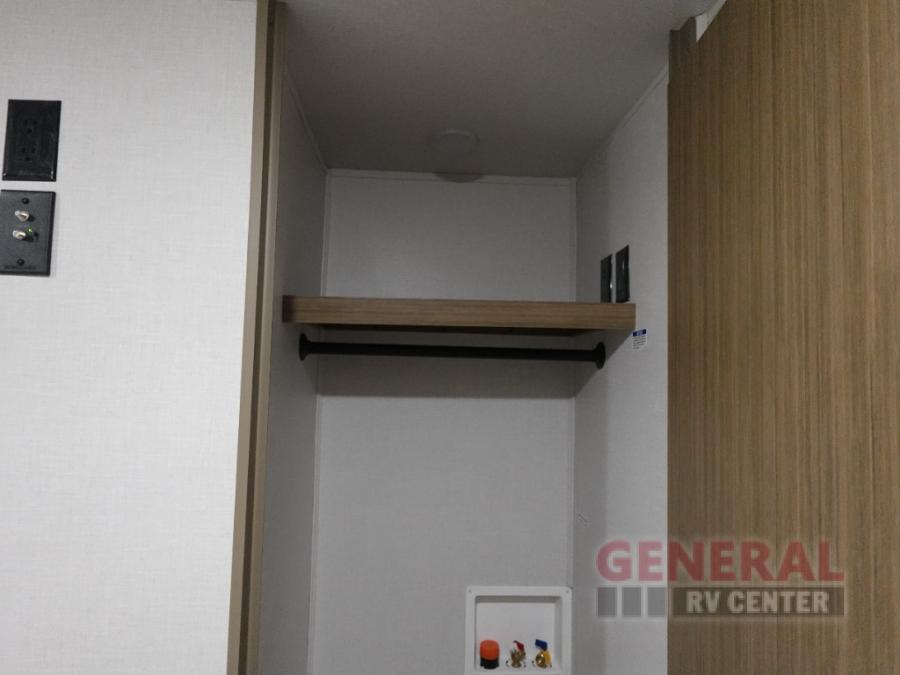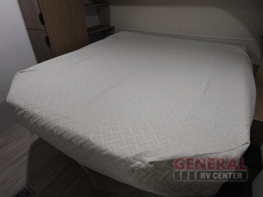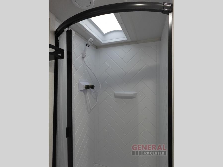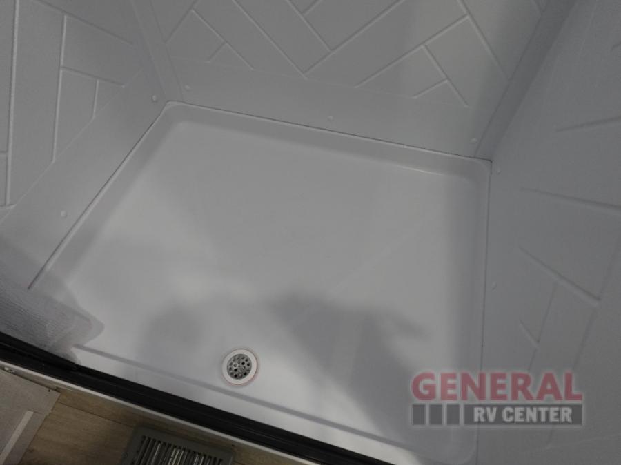 Find your zen int this spacious travel trailer for four! Once you've unloaded your gear, you can head inside to make lunch at the kitchen island with four chairs. An 80" trundle sofa provides additional seating space plus sleeping space for guests. You will love the rear custom recliners that are conveniently located next to the fireplace. The full bath is located towards the front next to the private bedroom so you can easily use the restroom at night, and you're sure to get a great night's rest on the custom king bed with Versa Tilt. This unit also includes washer and dryer prep, giving you the option to add these appliances.
