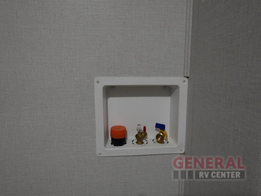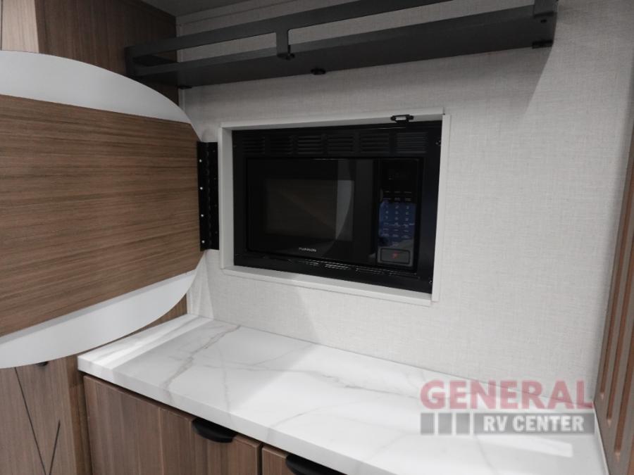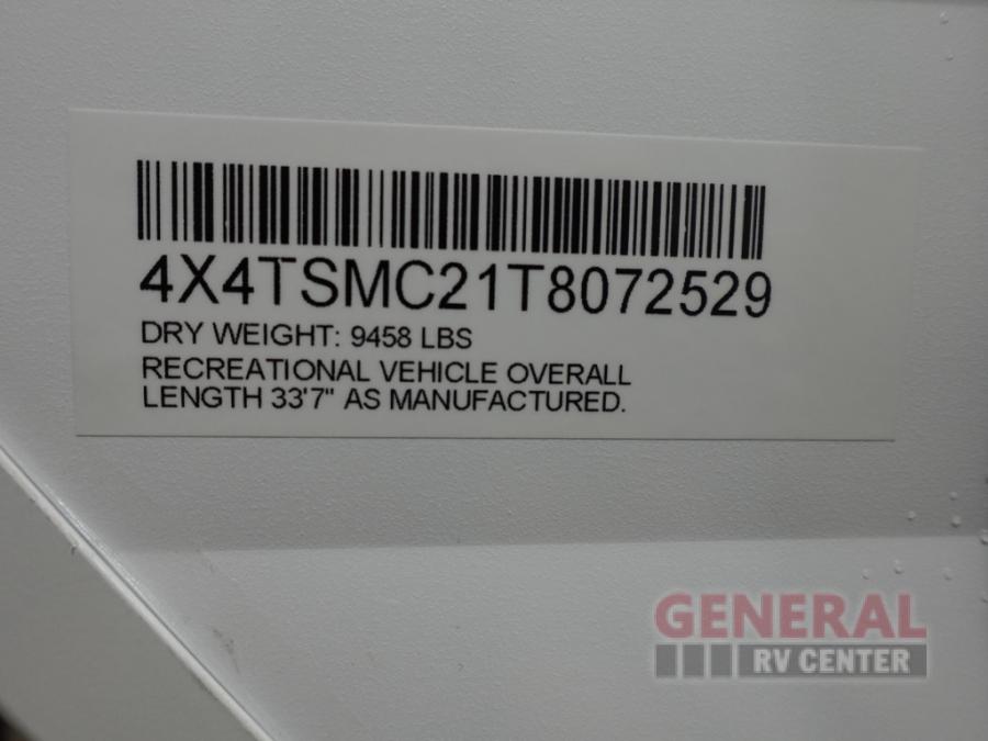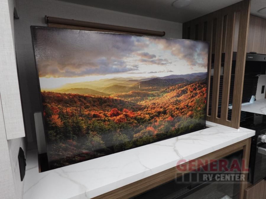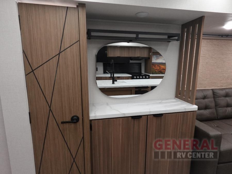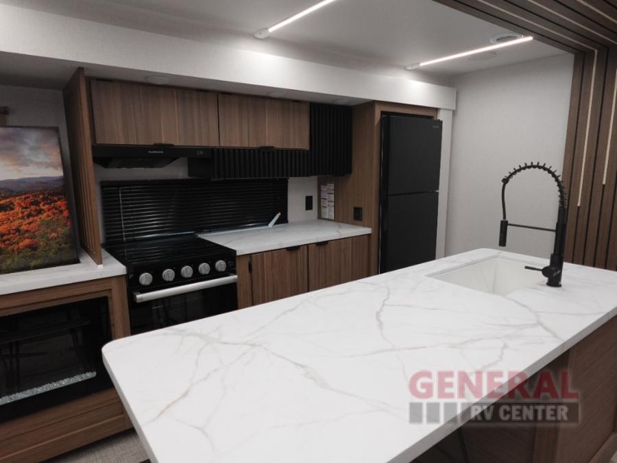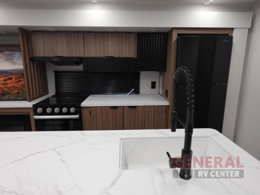 Find your zen int this spacious travel trailer for four! Once you've unloaded your gear, you can head inside to make lunch at the kitchen island with four chairs. An 80" trundle sofa provides additional seating space plus sleeping space for guests. You will love the rear custom recliners that are conveniently located next to the fireplace. The full bath is located towards the front next to the private bedroom so you can easily use the restroom at night, and you're sure to get a great night's rest on the custom king bed with Versa Tilt. This unit also includes washer and dryer prep, giving you the option to add these appliances.