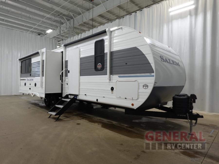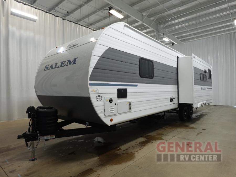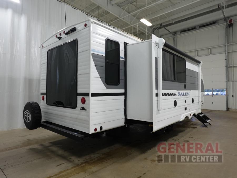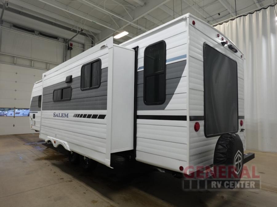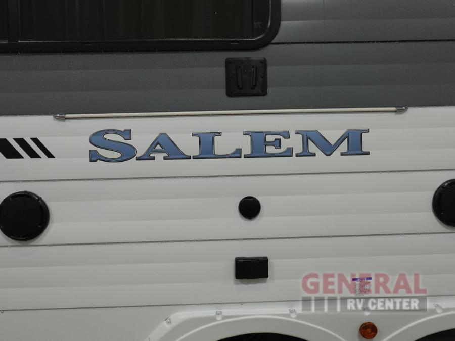 The Salem travel trailers are packed with hassle-free camping amenities and there are a variety of floorplans to choose from. The heated and enclosed Accessibelly will help protect against the elements and debris during transport, and the exterior retro/metal redesign is sure to be eye-catching! There are stylish roller shades inside, along with updated backsplash, elegant curtain rods and curtains, plus many more interior comforts! Choose a Salem travel trailer today for quality and value!