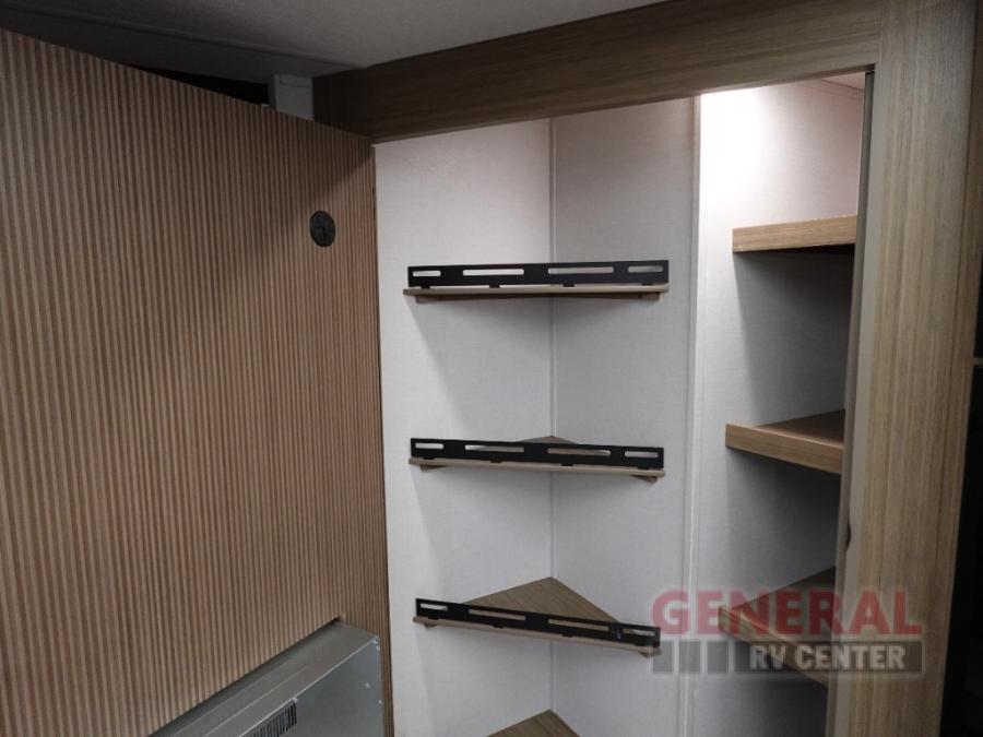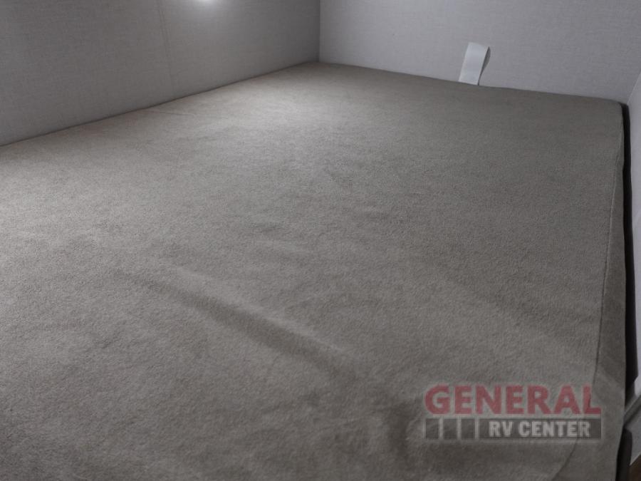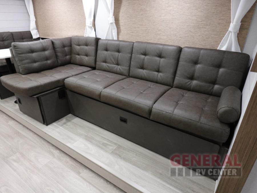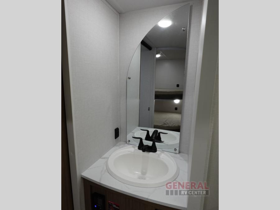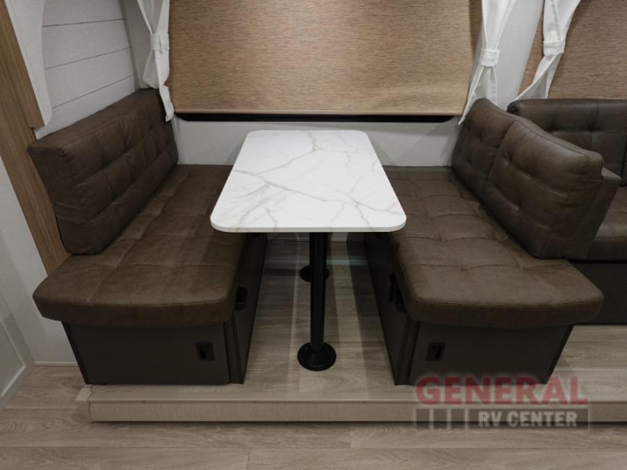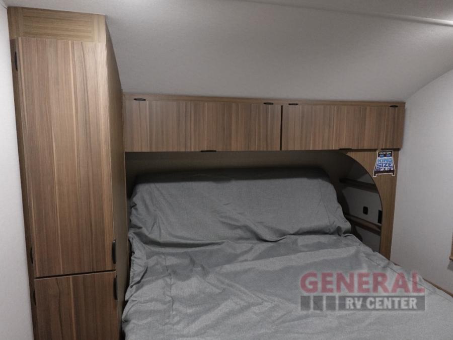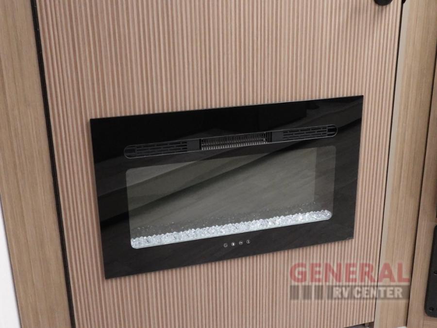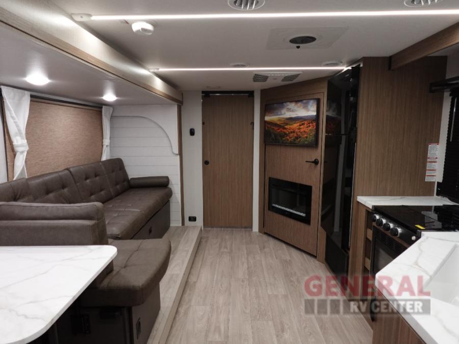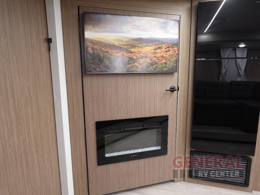 You're sure to make camping memories in this spacious travel trailer! You can easily sleep eight people each night thanks to the double-size bunks, the custom king bed with Versa Tilt in the front bedroom plus the Versa-Lounge within the large slide out! The cooktop and microwave oven will let you make meals each day, and you'll appreciate the hidden pantry with shelves behind the fireplace. There is also a booth dinette where you can dine together or play a game of cards after dinner is cleaned up, or you may just find yourselves outdoors under the 18' awning with 4K blade lighting. And don't overlook the full bath, complete with a tub/shower that will make bath time easier if you have little ones.