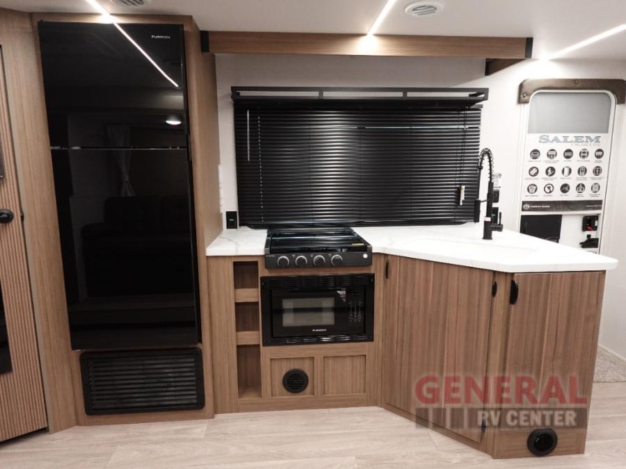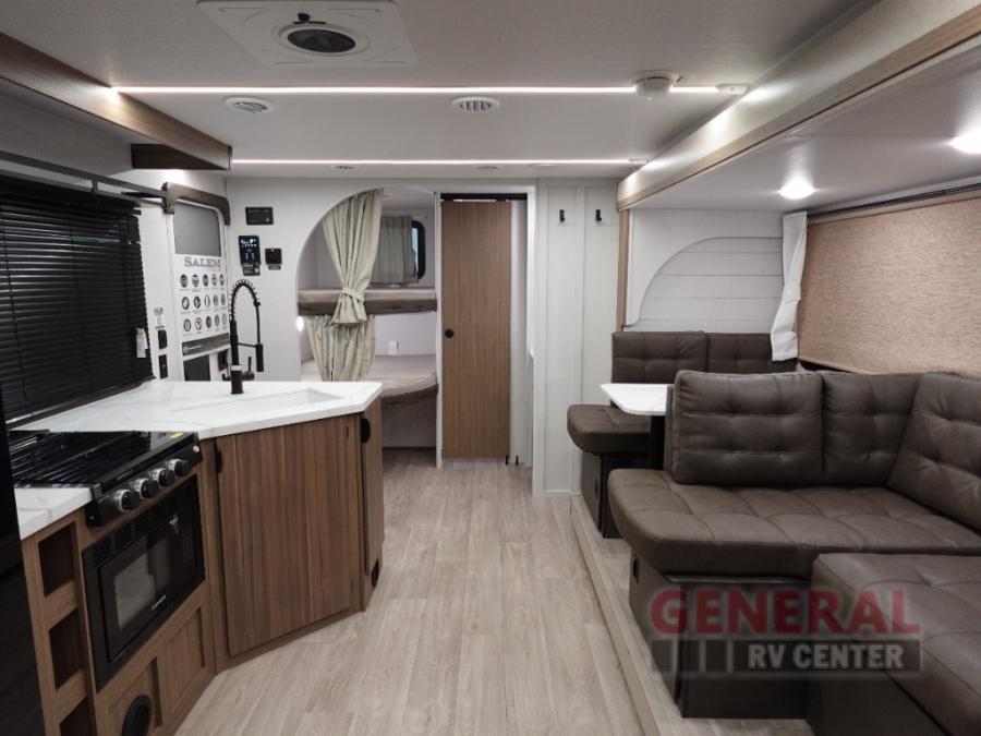 The Salem Cruise Lite travel trailers and toy haulers are value-minded units packed with great camping features! There are a variety of floorplans to choose from between two different regions. The enclosed Accessibelly will help protect against the elements and debris during transport, and the exterior retro/metal redesign is sure to be eye-catching! There are stylish roller shades inside, along with updated backsplash, elegant curtain rods and curtains, plus many more interior comforts! Choose a Salem Cruise Lite today for quality and value!