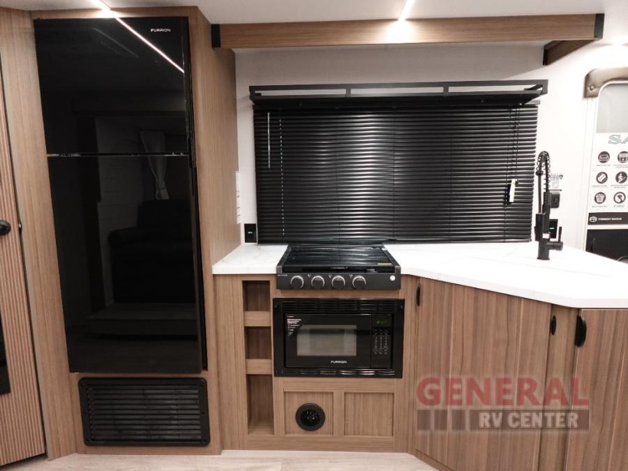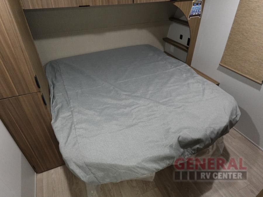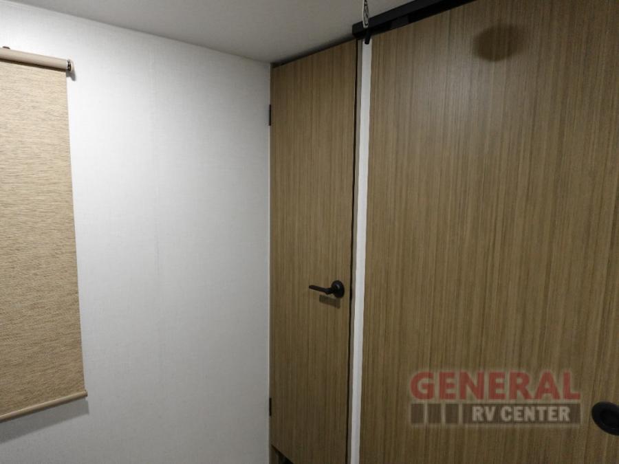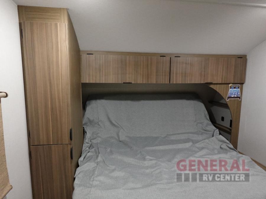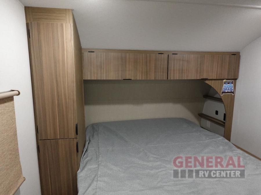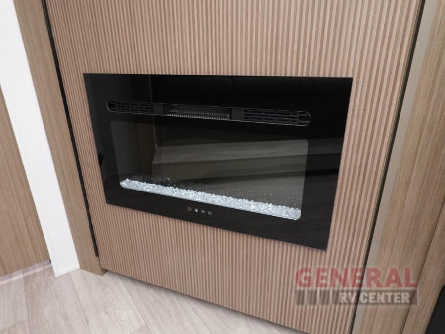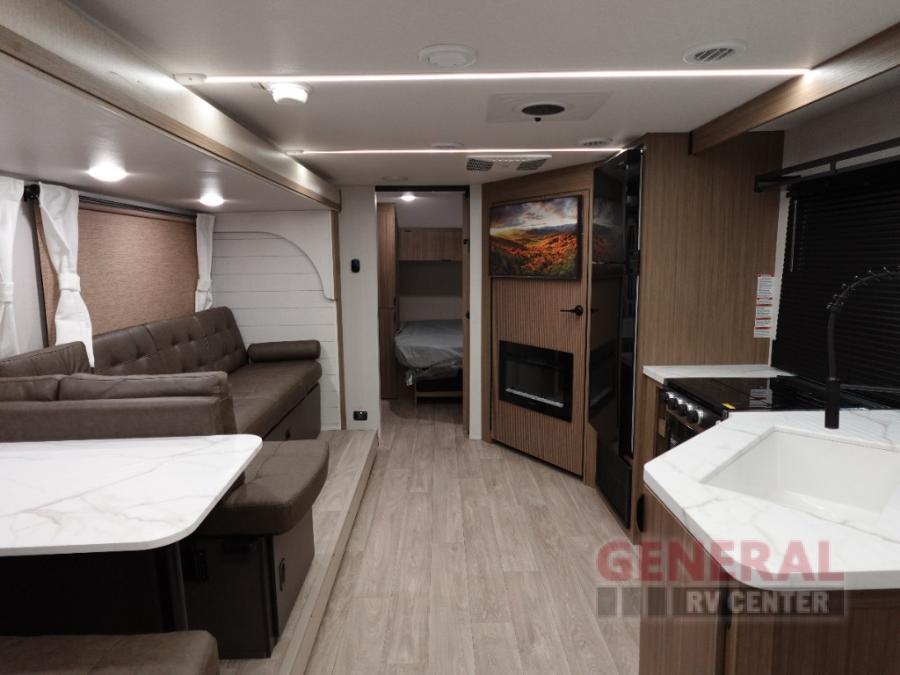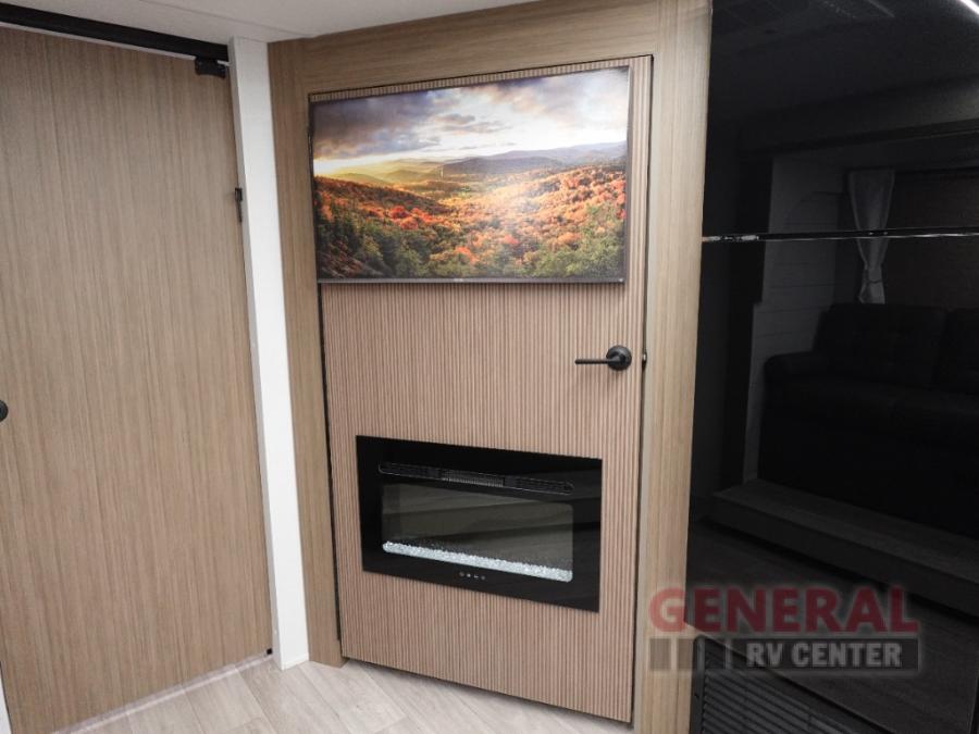 You're sure to make camping memories in this spacious travel trailer! You can easily sleep eight people each night thanks to the double-size bunks, the custom king bed with Versa Tilt in the front bedroom plus the Versa-Lounge within the large slide out! The cooktop and microwave oven will let you make meals each day, and you'll appreciate the hidden pantry with shelves behind the fireplace. There is also a booth dinette where you can dine together or play a game of cards after dinner is cleaned up, or you may just find yourselves outdoors under the 18' awning with 4K blade lighting. And don't overlook the full bath, complete with a tub/shower that will make bath time easier if you have little ones.