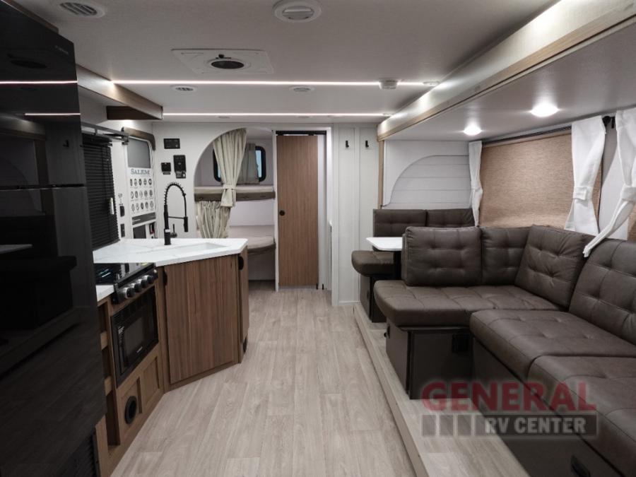 The Salem Cruise Lite travel trailers and toy haulers are value-minded units packed with great camping features! There are a variety of floorplans to choose from between two different regions. The enclosed Accessibelly will help protect against the elements and debris during transport, and the exterior retro/metal redesign is sure to be eye-catching! There are stylish roller shades inside, along with updated backsplash, elegant curtain rods and curtains, plus many more interior comforts! Choose a Salem Cruise Lite today for quality and value!