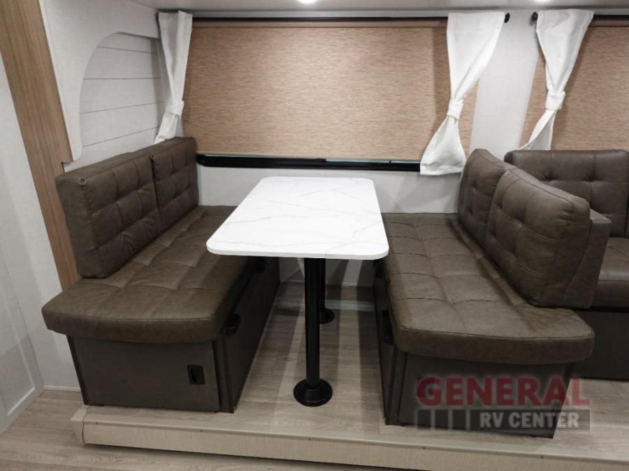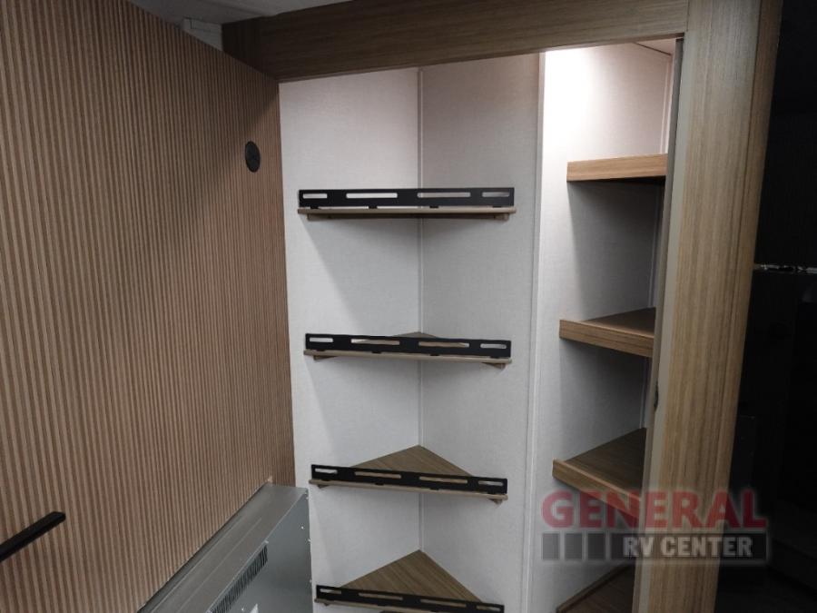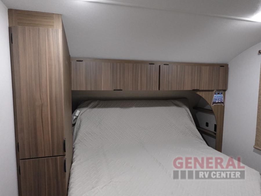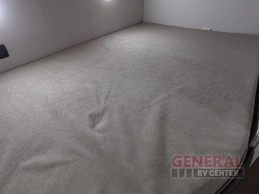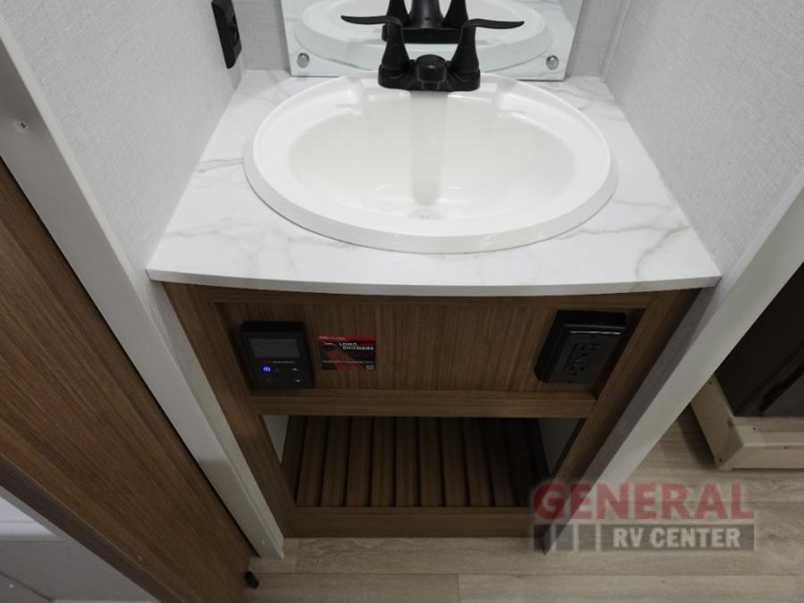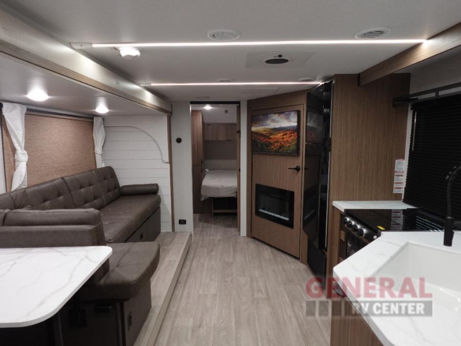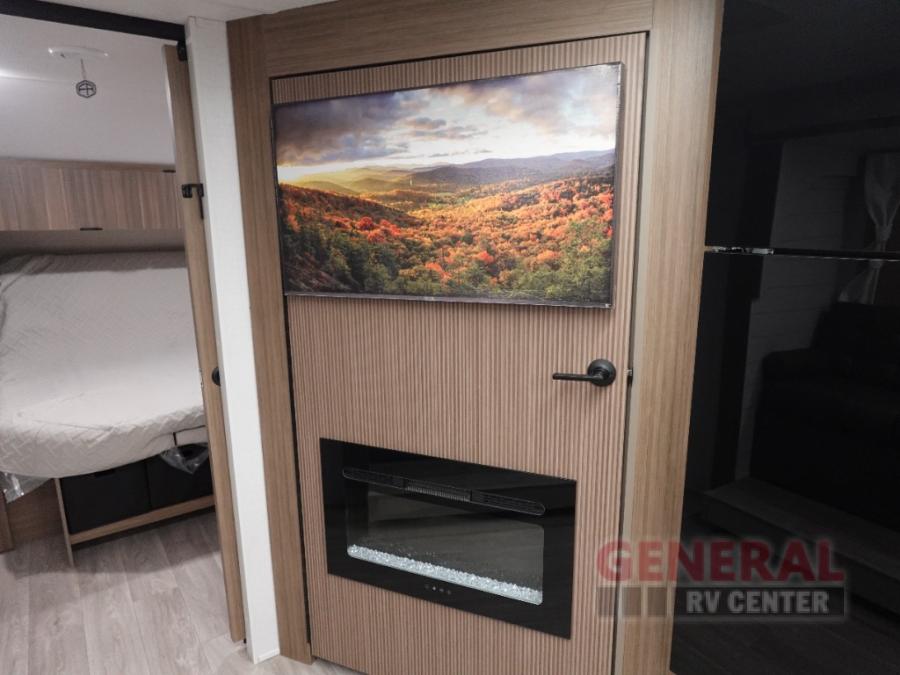 You're sure to make camping memories in this spacious travel trailer! You can easily sleep eight people each night thanks to the double-size bunks, the custom king bed with Versa Tilt in the front bedroom plus the Versa-Lounge within the large slide out! The cooktop and microwave oven will let you make meals each day, and you'll appreciate the hidden pantry with shelves behind the fireplace. There is also a booth dinette where you can dine together or play a game of cards after dinner is cleaned up, or you may just find yourselves outdoors under the 18' awning with 4K blade lighting. And don't overlook the full bath, complete with a tub/shower that will make bath time easier if you have little ones.