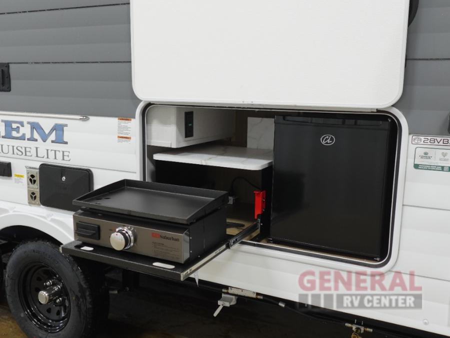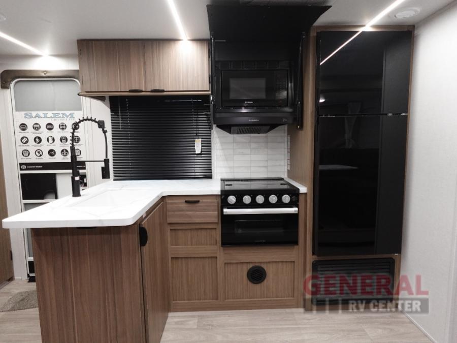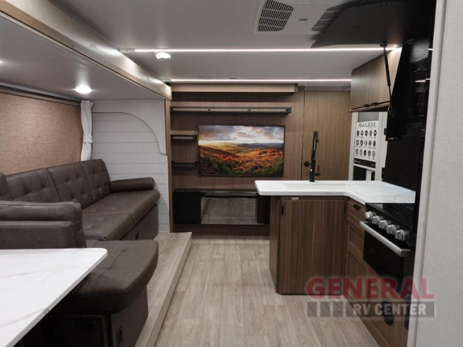 The Salem Cruise Lite travel trailers and toy haulers are value-minded units packed with great camping features! The enclosed Accessibelly will help protect against the elements and debris during transport, and the exterior retro/metal redesign is sure to be eye-catching! There are stylish roller shades inside, along with updated backsplash, elegant curtain rods and curtains, plus many more interior comforts! Choose a Salem Cruise Lite today for quality and value!