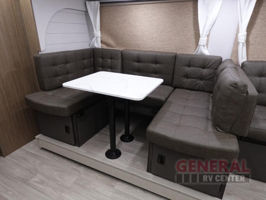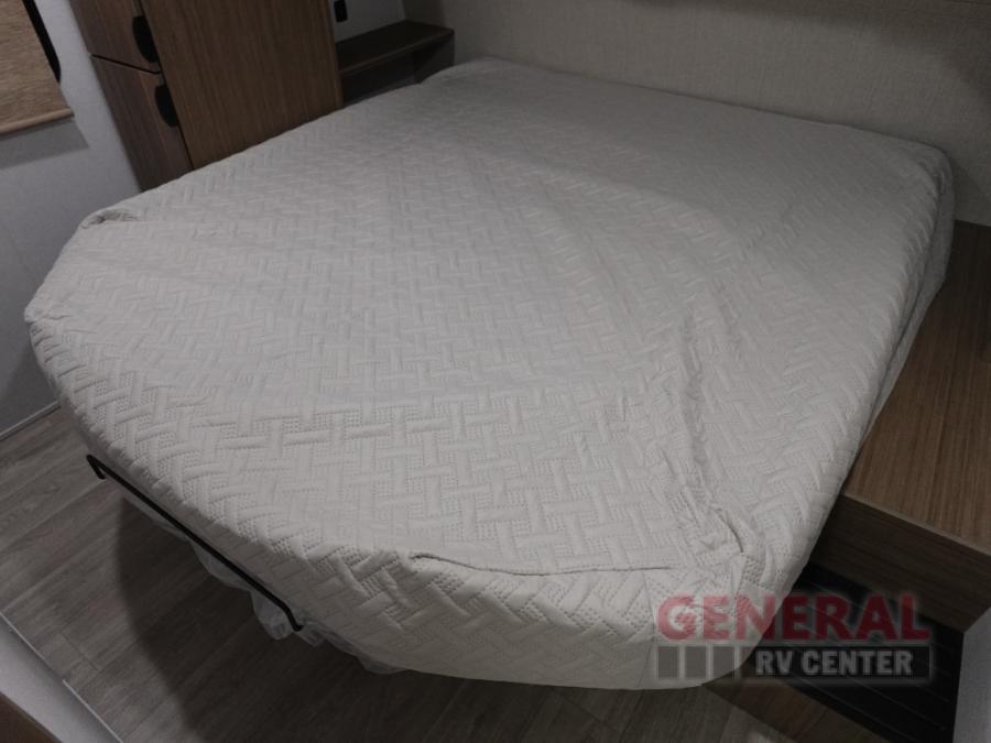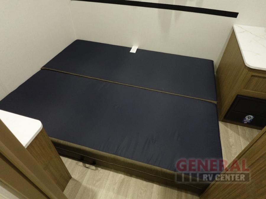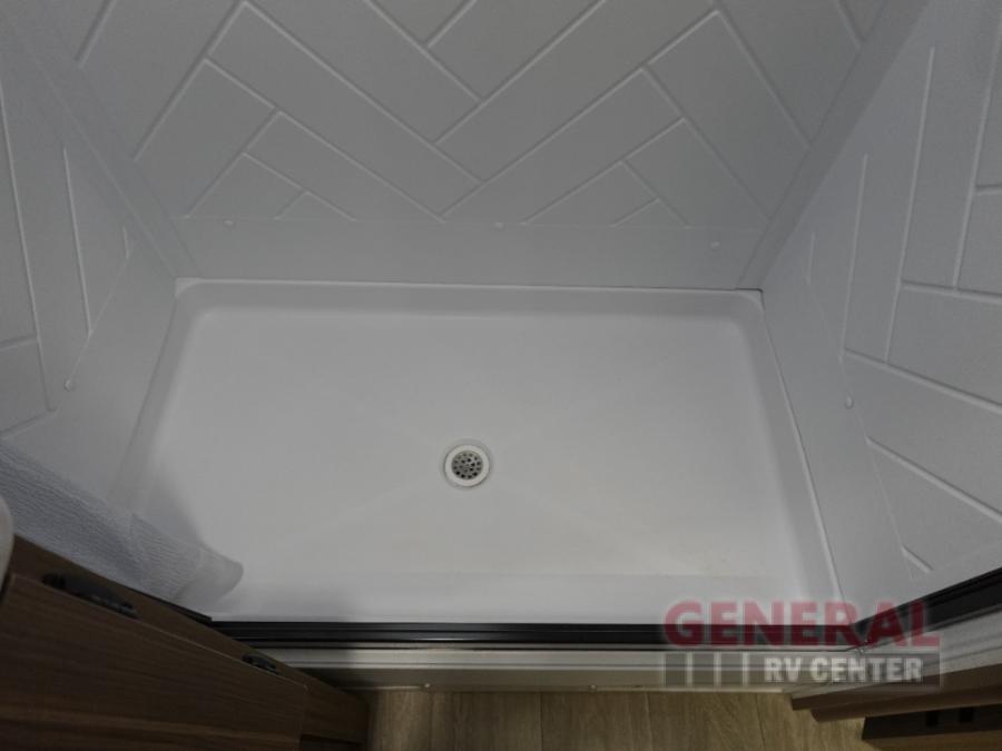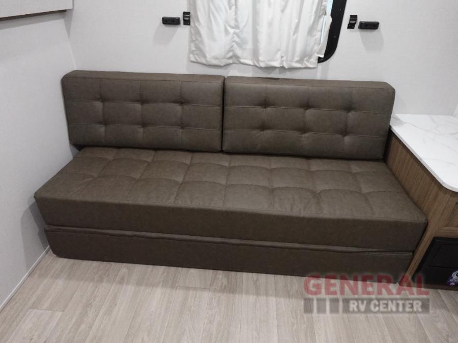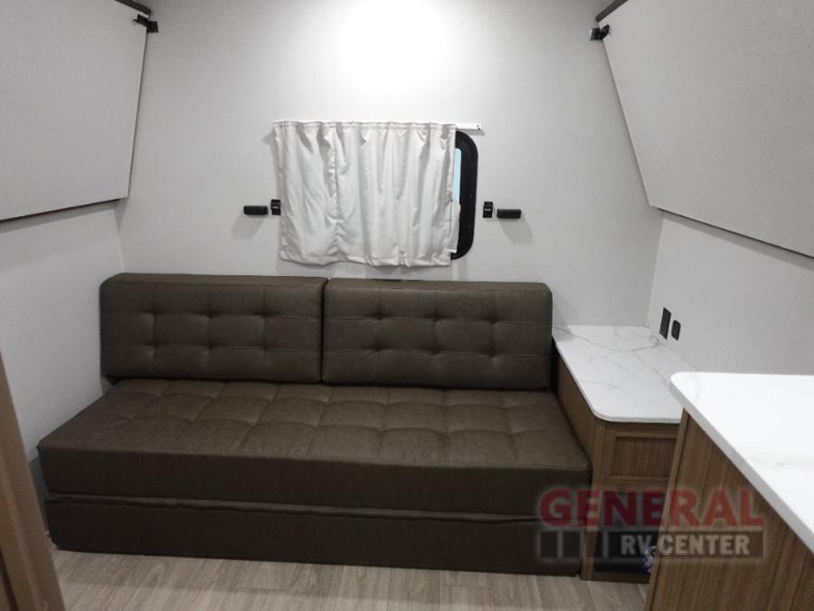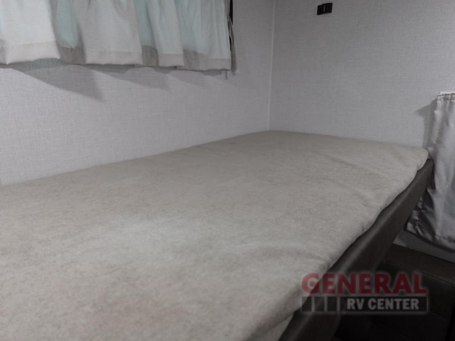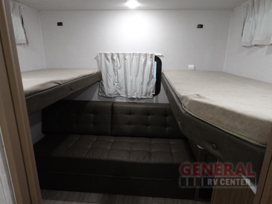 This travel trailer is new to the lineup and offers a large amount of versatility! The rear private bunkhouse has two 30" x 74" Versa-bunks and a Versa-queen bed so that more can join in on the camping fun. Start each morning feeling clean and fresh after showering in the walk-in shower with fiberglass surround then head to the front private bedroom to change. The kitchen has an oversized refrigerator to keep your perishables fresh, a cooktop for meals, and a U-shaped dinette for dining, game time, or just hanging out.