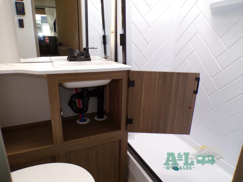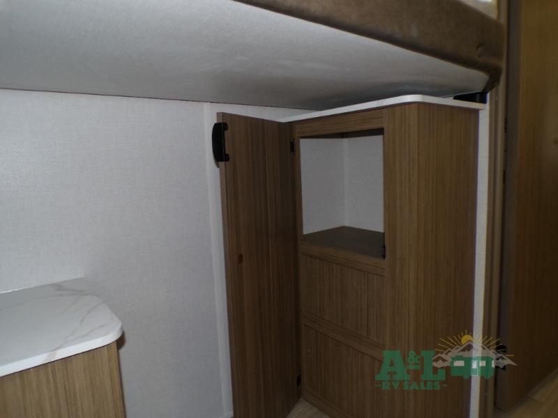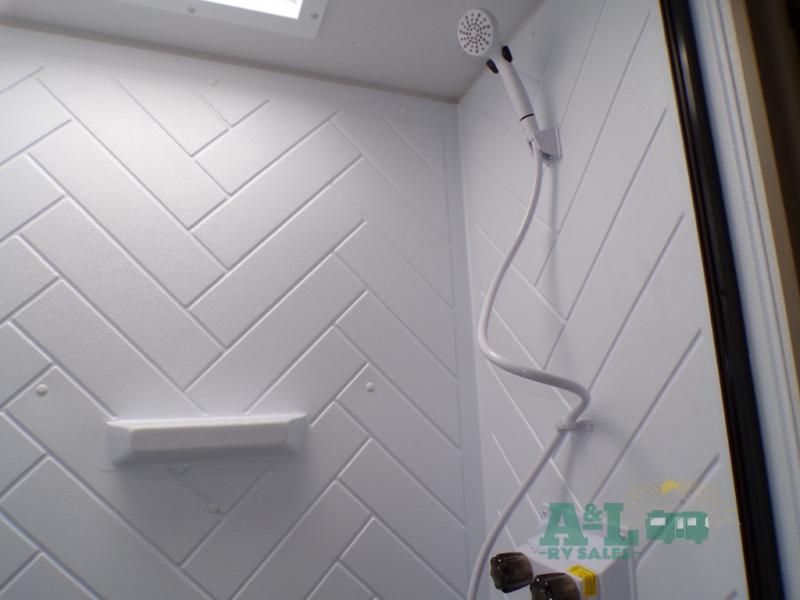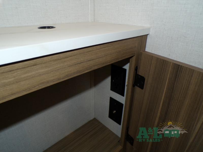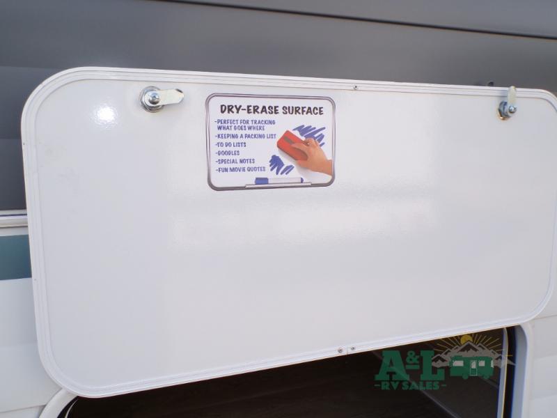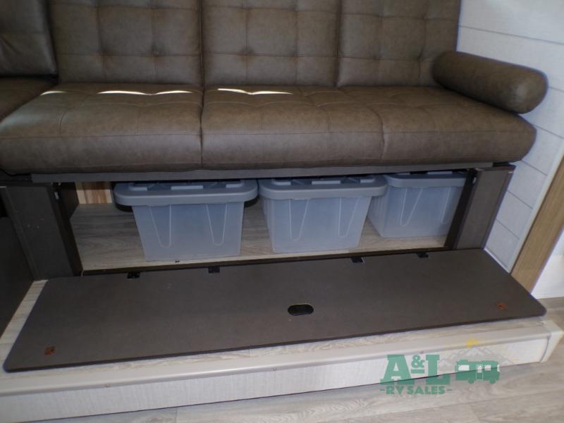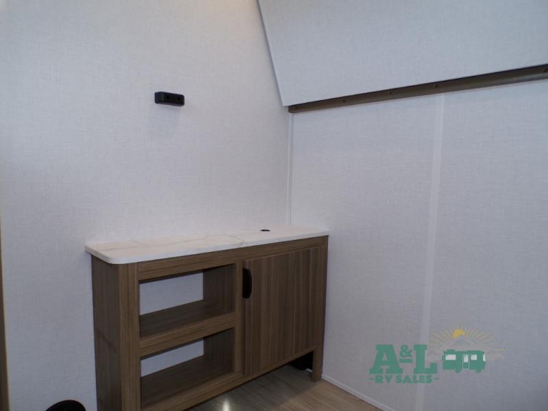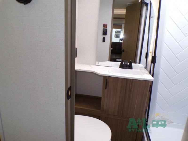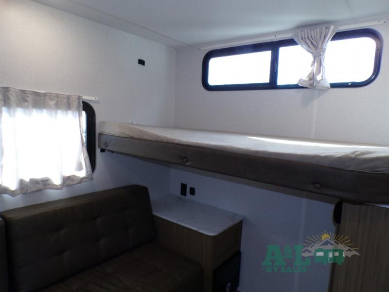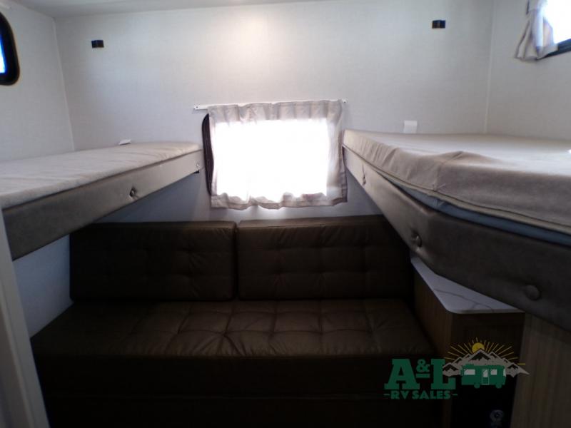 This travel trailer offers a large amount of versatility! The rear private bunkhouse has two 30" x 74" bunks and a sofa bed below that can transform into a bed so more can join in on the camping fun. Start each morning feeling clean and fresh after showering in the full bathroom then head to the front private bedroom to change. The kitchen has a 12V refrigerator to keep your eggs fresh, a cooktop to fry them up, and a U-shaped dinette to enjoy them at. What better way to wind down your nights than by relaxing on the Versa Lounge or playing a game around the U-shaped dinette!