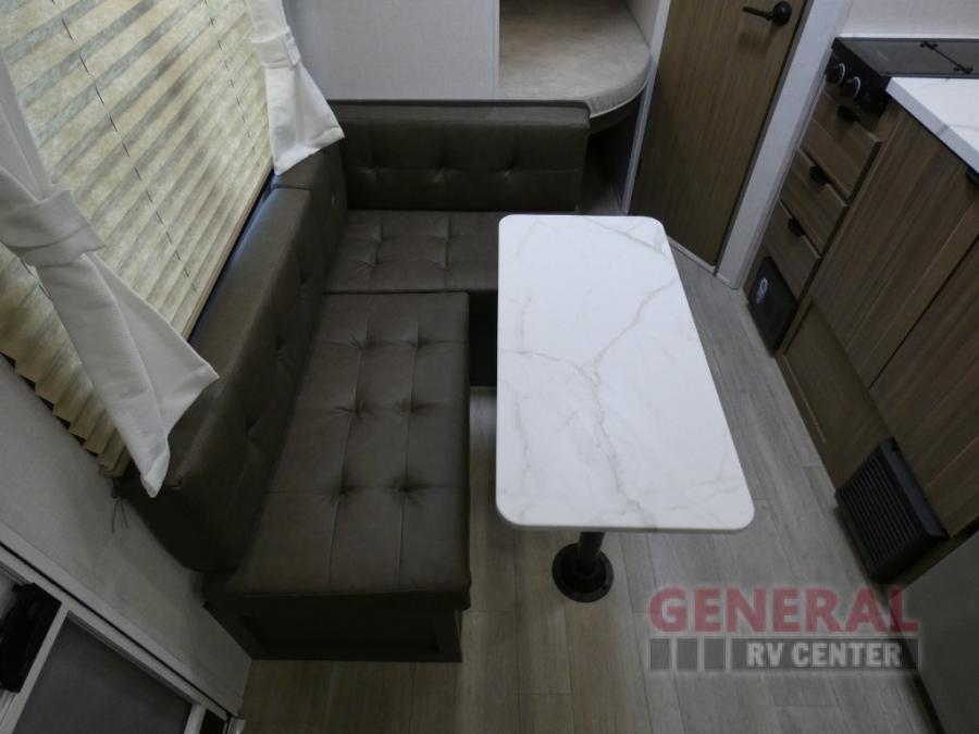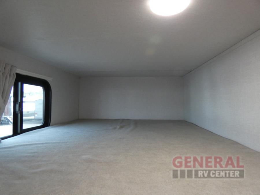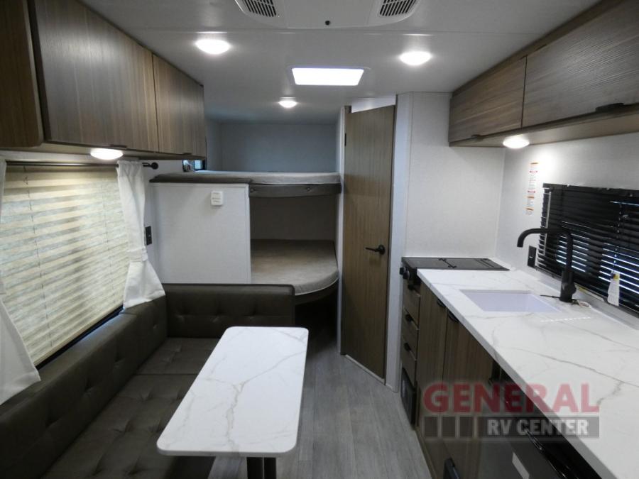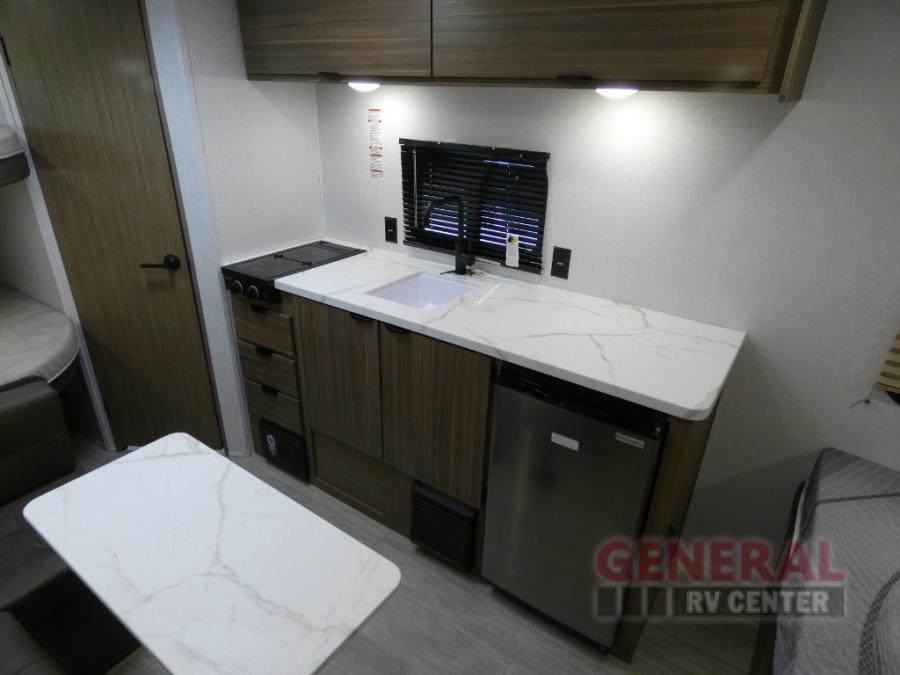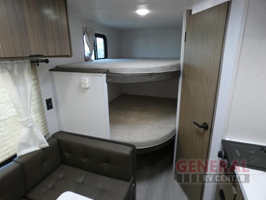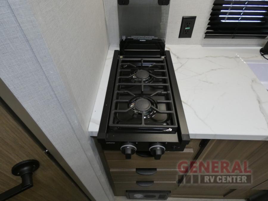 The double-size bunks with storage will be a big selling point in this travel trailer! While your guests take the bunks, you can have the front queen bed all to yourselves, and there is a wardrobe to keep your things organized. A two burner cooktop and microwave will let you make meals each day, and you can dine at the open lounge with a table.
