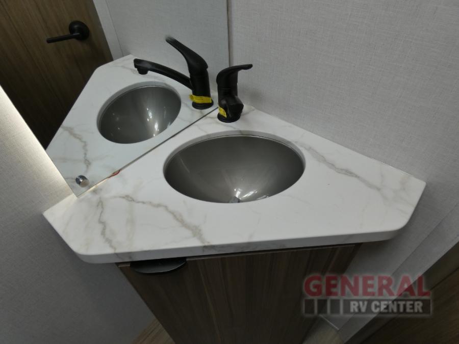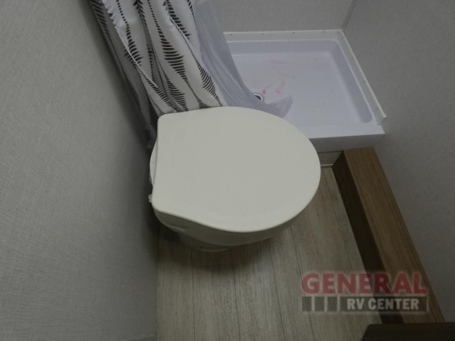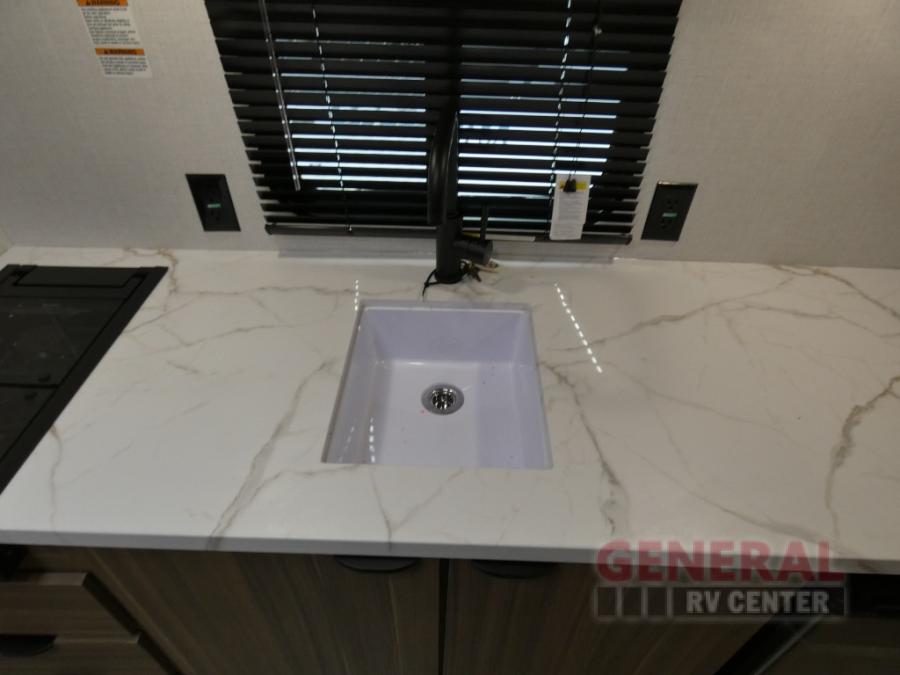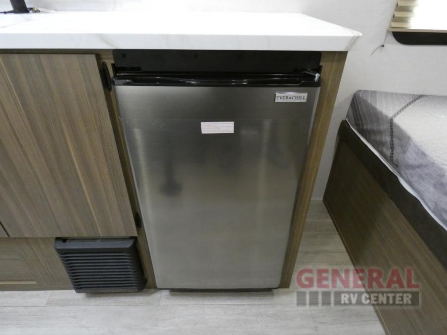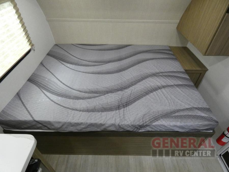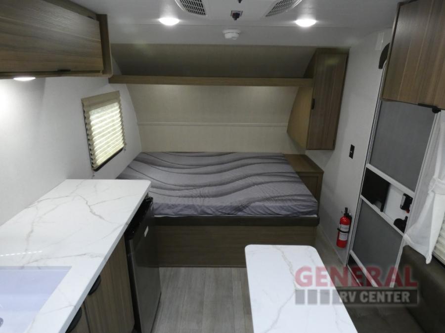 The double-size bunks with storage will be a big selling point in this travel trailer! While your guests take the bunks, you can have the front queen bed all to yourselves, and there is a wardrobe to keep your things organized. A two burner cooktop and microwave will let you make meals each day, and you can dine at the open lounge with a table.