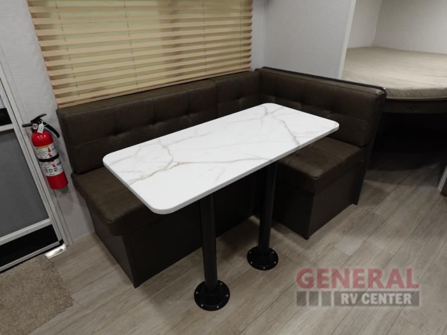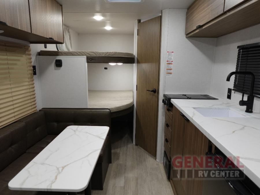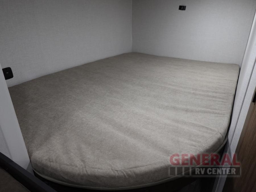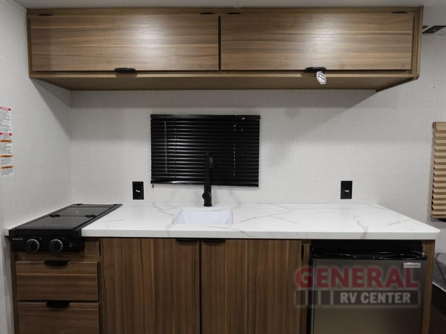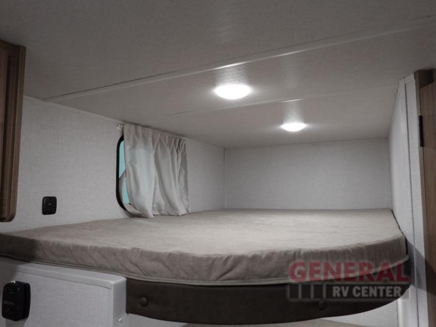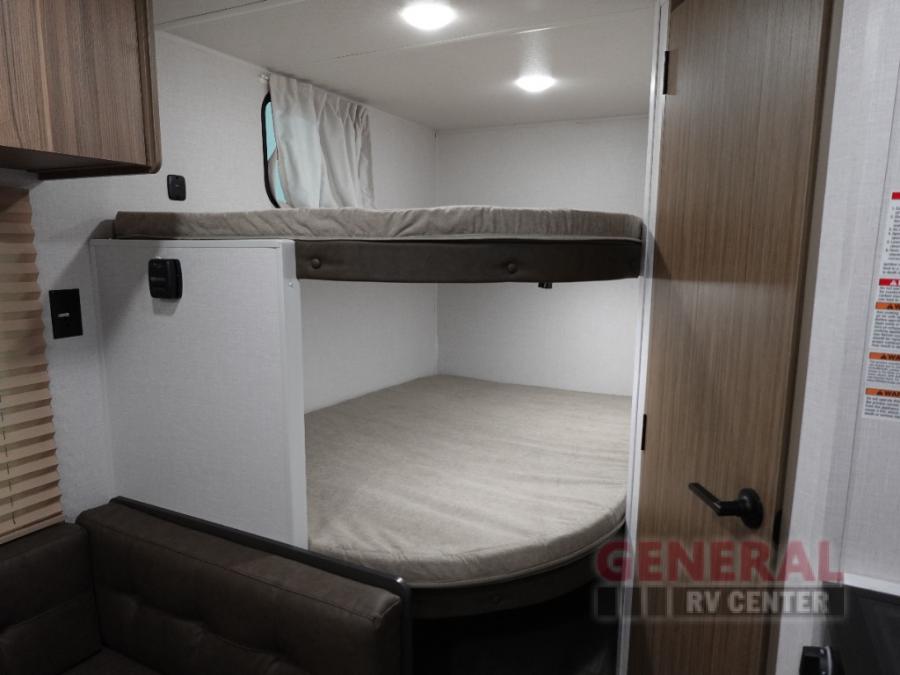 The double-size bunks with storage will be a big selling point in this travel trailer! While your guests take the bunks, you can have the front queen bed all to yourselves, and there is a wardrobe to keep your things organized. A two burner cooktop and microwave will let you make meals each day, and you can dine at the open lounge with a table