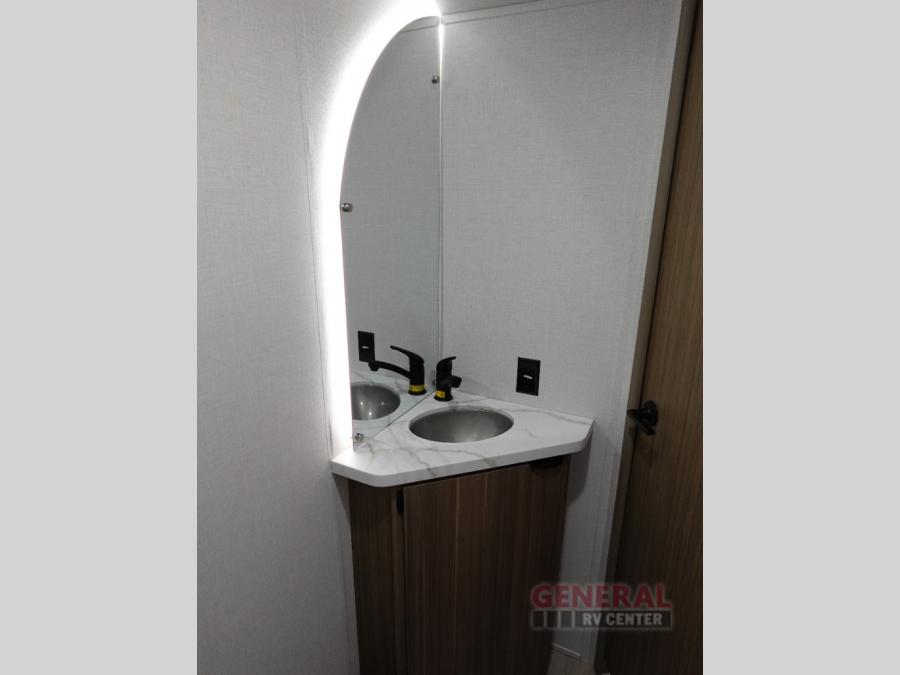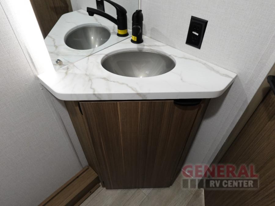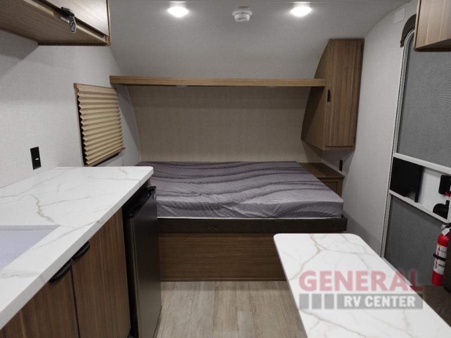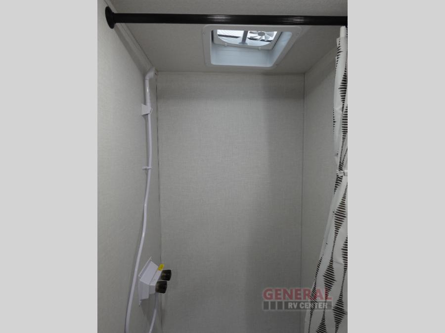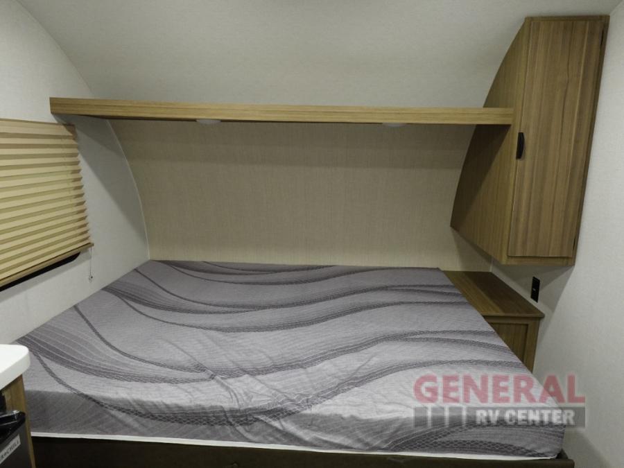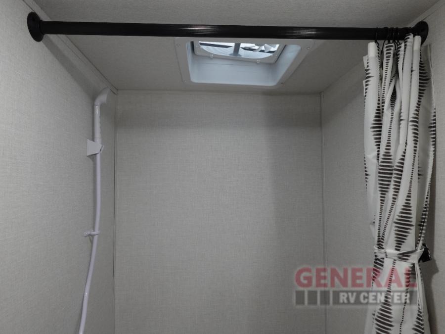 The double-size bunks with storage will be a big selling point in this travel trailer! While your guests take the bunks, you can have the front queen bed all to yourselves, and there is a wardrobe to keep your things organized. A two burner cooktop and microwave will let you make meals each day, and you can dine at the open lounge with a table