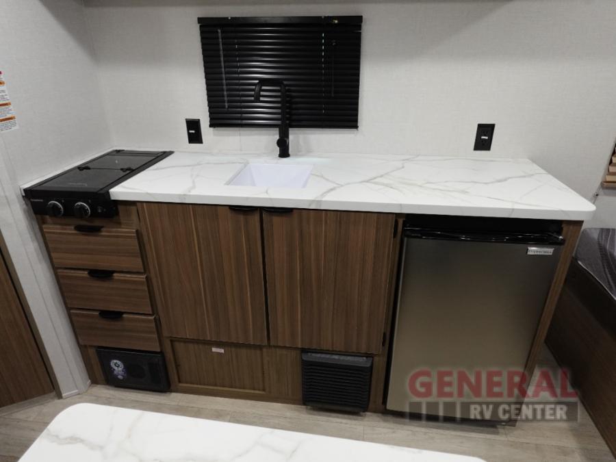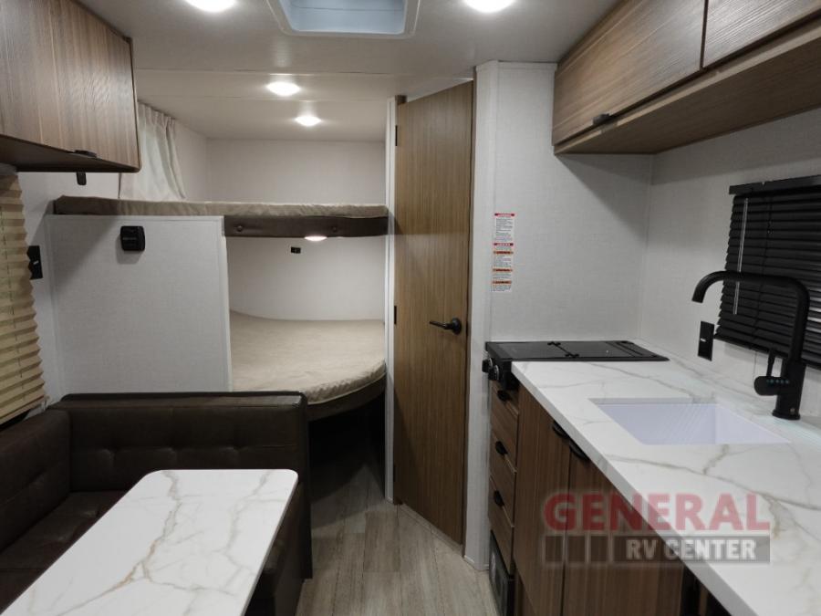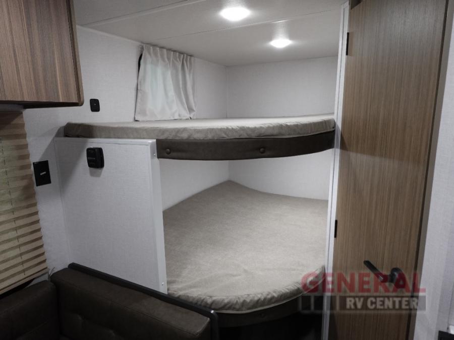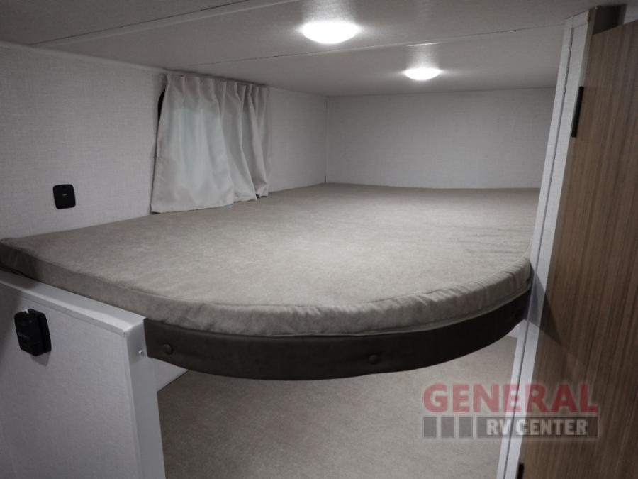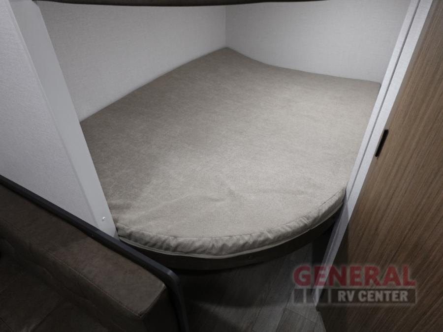 The double-size bunks with storage will be a big selling point in this travel trailer! While your guests take the bunks, you can have the front queen bed all to yourselves, and there is a wardrobe to keep your things organized. A two burner cooktop and microwave will let you make meals each day, and you can dine at the open lounge with a table