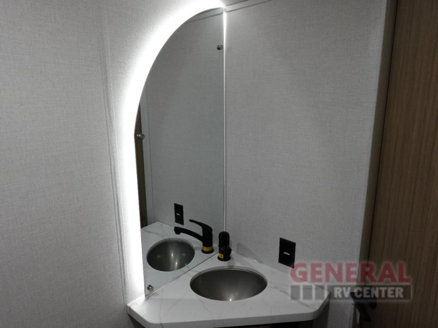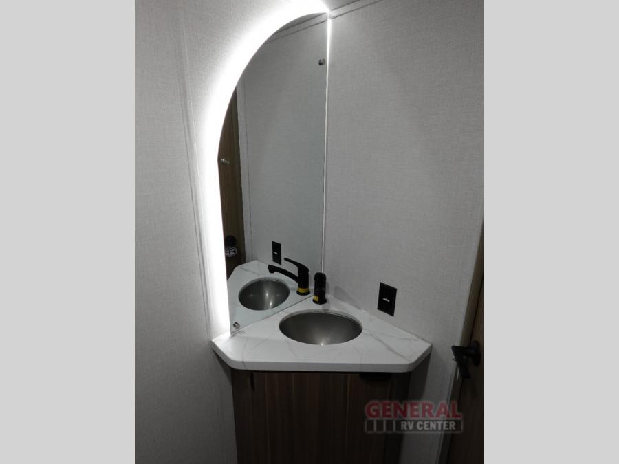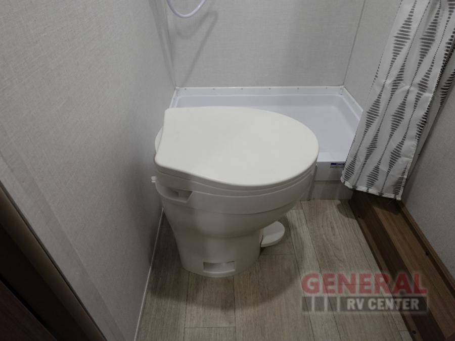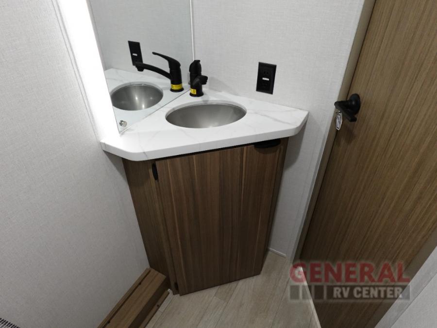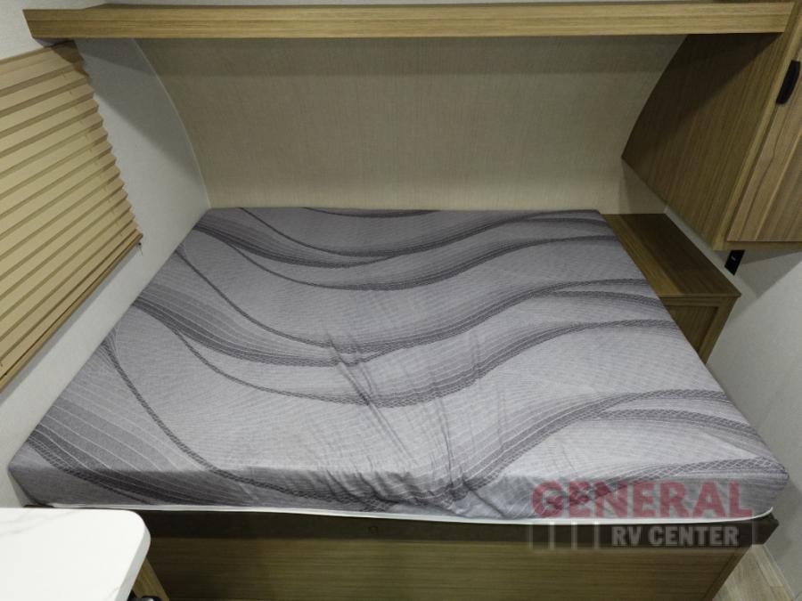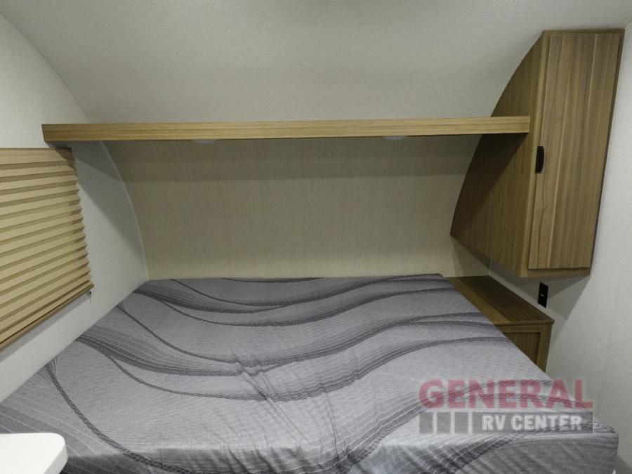 The double-size bunks with storage will be a big selling point in this travel trailer! While your guests take the bunks, you can have the front queen bed all to yourselves, and there is a wardrobe to keep your things organized. A two burner cooktop and microwave will let you make meals each day, and you can dine at the open lounge with a table