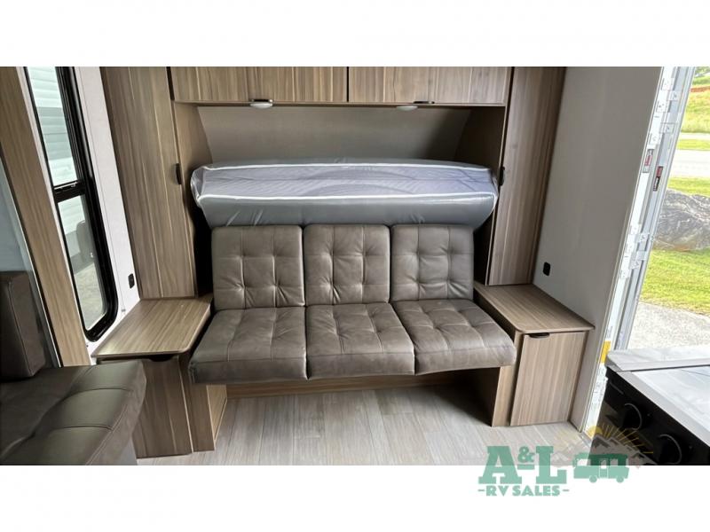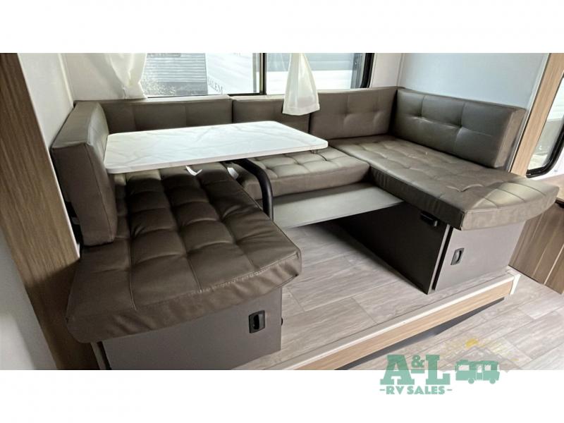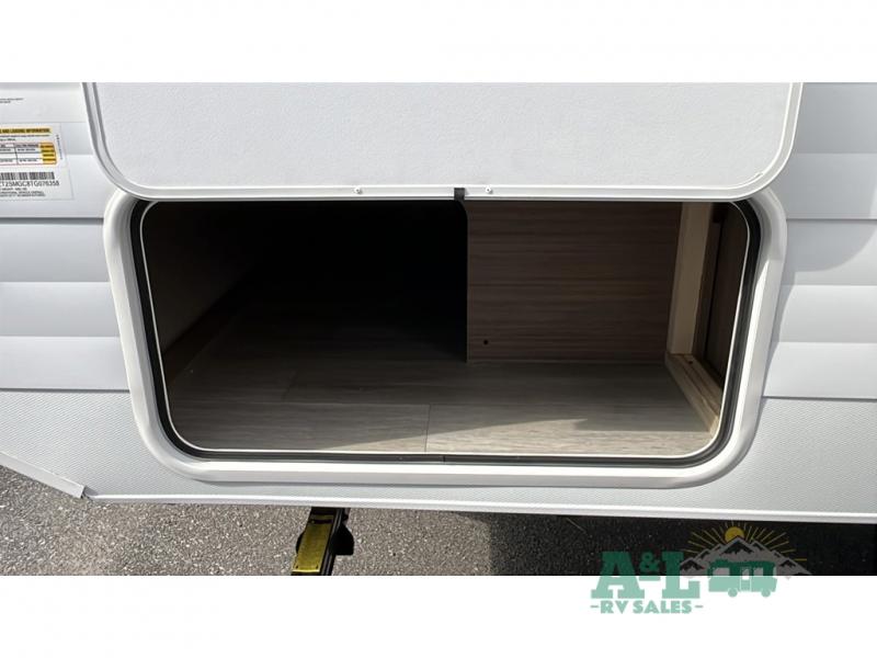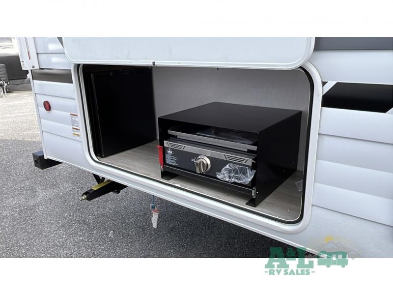 Start camping the right way in this travel trailer! It features a front Murphy bed that will double as your seating and sleeping space each day. The corner set of double-size bunk beds come with storage to keep things out of the way and are conveniently next to the rear corner bathroom with a shower with a skylight to freshen up in each morning. You can prepare your best home cooked meals indoors with the two burner cooktop or head to the outside kitchen to fry up some burgers while breathing in some fresh air. Enjoy your meals, play card games, and even sleep at the U-shaped dinette slide. You will also appreciate the outside shower and the exterior full pass-through storage for camp gear!