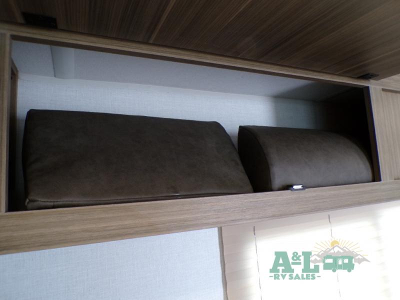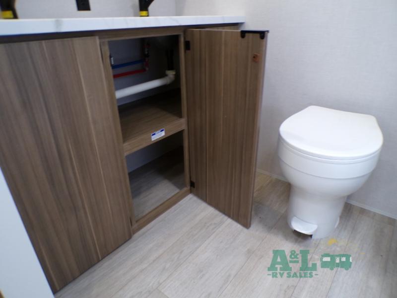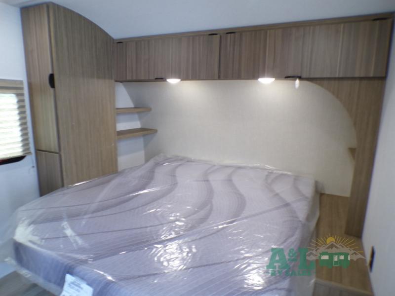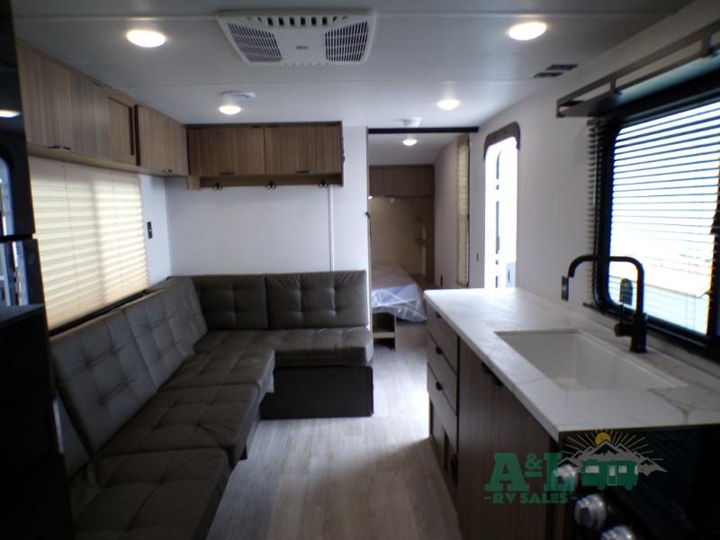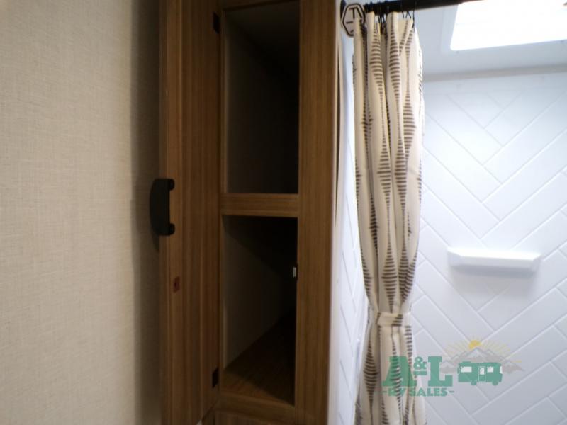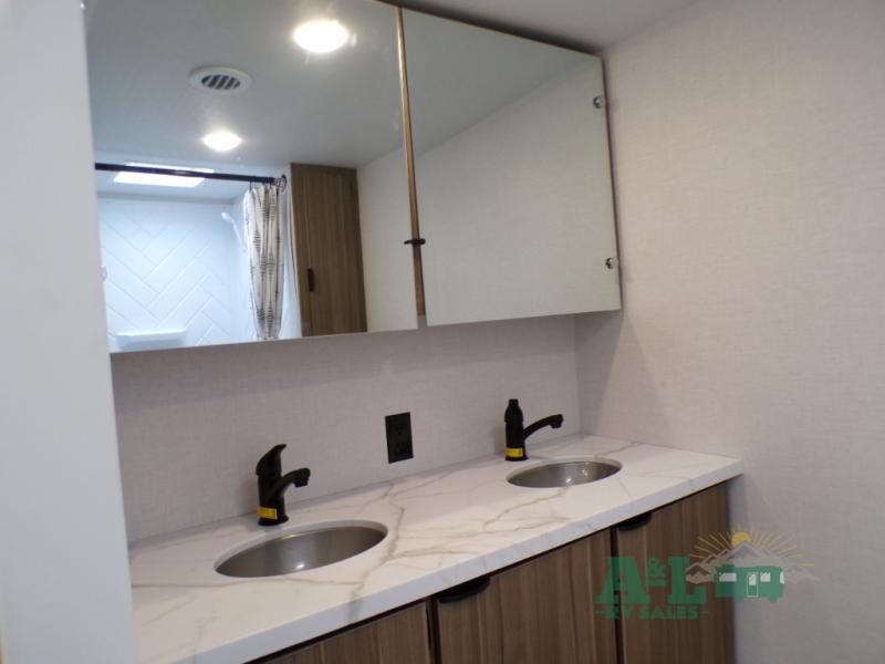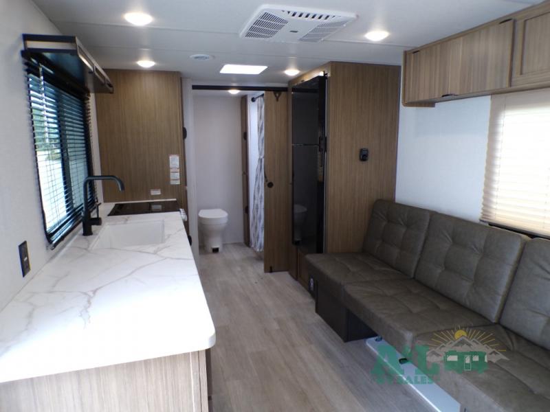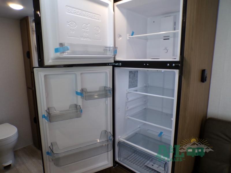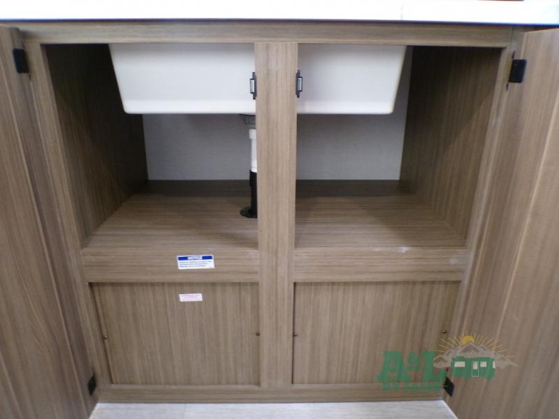 Camping is made easy in this travel trailer with at-home comforts! You'll have the front private bedroom with a king bed all to yourselves, and there are dual bedroom wardrobes to keep your space neat and clean. Any additional guests can sleep on the super lounge with a removable table. You will appreciate the full rear bath complete with a linen closet and dual bath sinks so you both can get ready for bed at once. And a full kitchen lets you whip up your best meals!