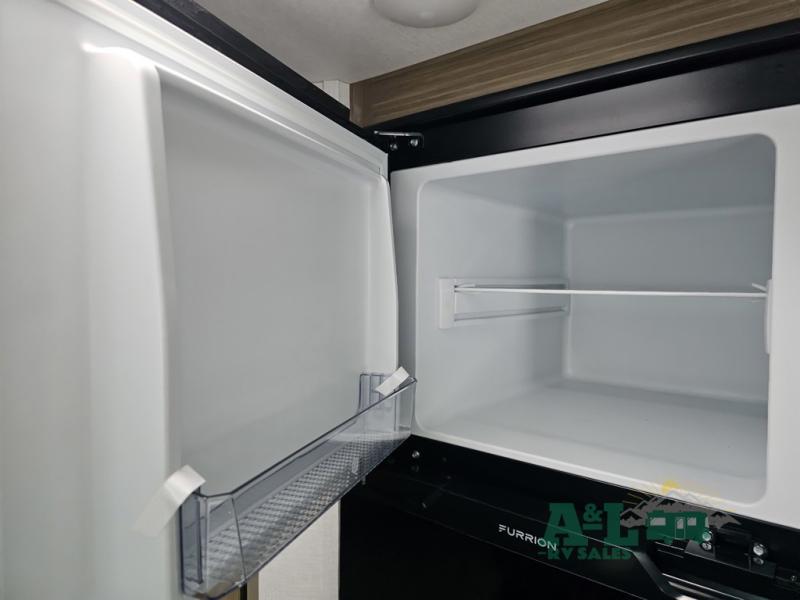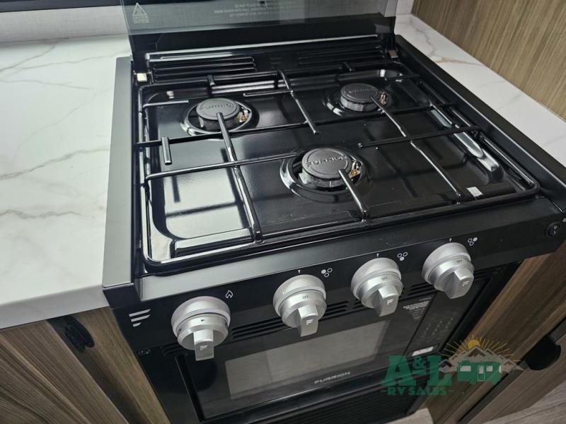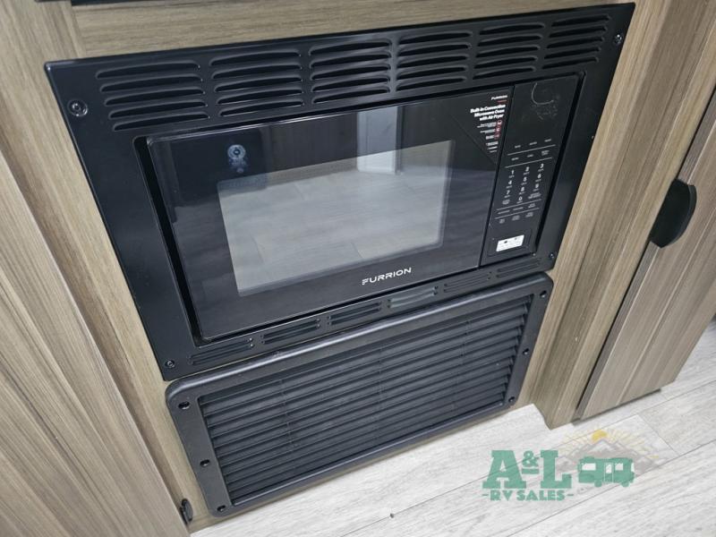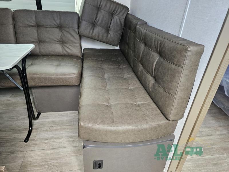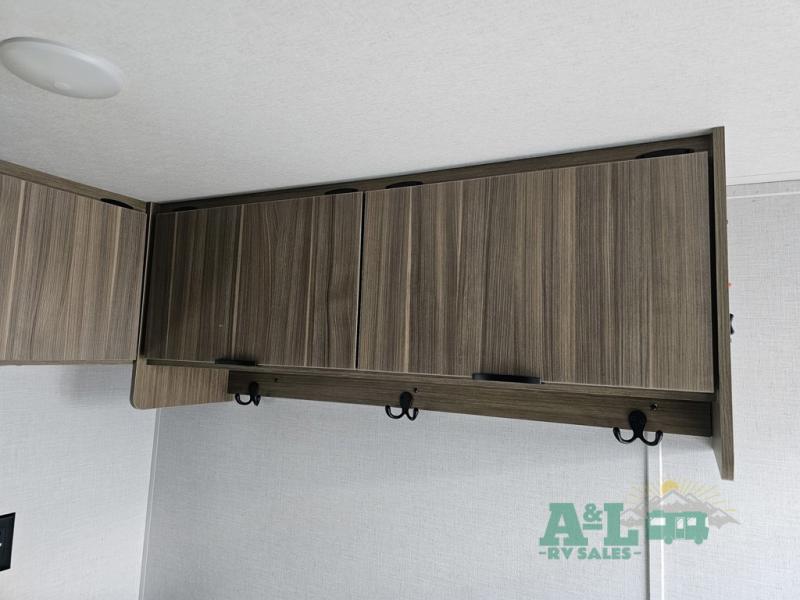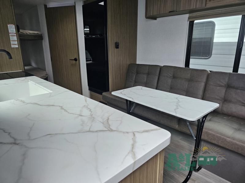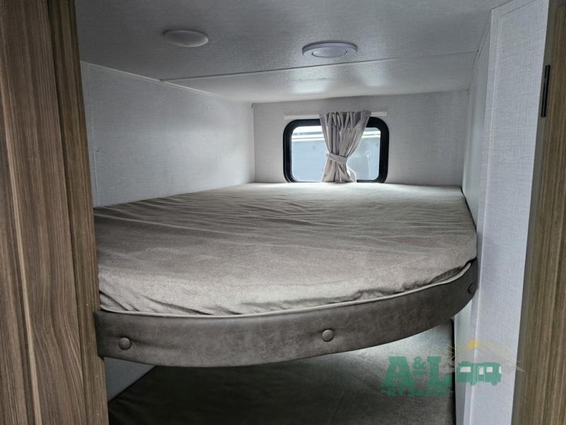 Camping is made easy in this travel trailer with more sleeping space and lots of comforts! The kids or your guests will enjoy the double-size bunks in the back, along with the full bath close by for easy nighttime use. You'll have the front private bedroom with a king bed all to yourselves, and there are dual bedroom wardrobes to keep your space neat and clean. Everyone can meet in the combined kitchen and living room to relax on the super U-lounge with a removable table while the chef of your group makes breakfast on the two burner cooktop. There is also a microwave oven for quick meals, plus a pantry and refrigerator for food storage!