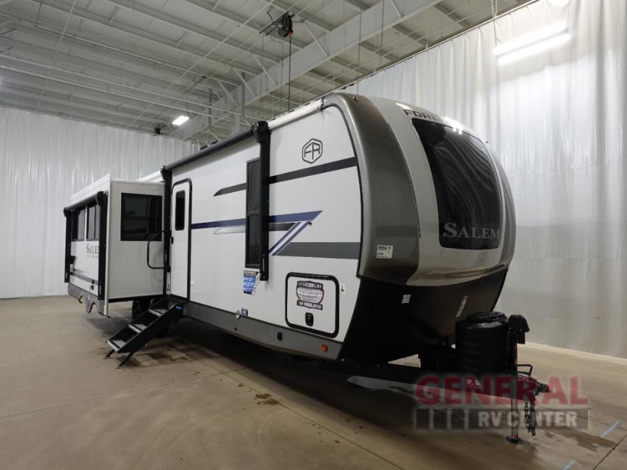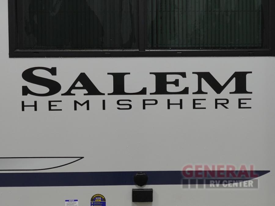 The Salem Hemisphere fifth wheels and travel trailers by Forest River are packed with features, while still being value-minded! Each model is constructed with laminated "Aluma Frame" sidewalls and floor with block foam insulation plus full length barreled ceilings for added head space. There are LED awning, marker and tail lights outside, along with an extra large pass-thru storage with slam latch baggage doors, plus solar prep and Lippert On-The-Go ladder prep. The 60K on-demand tankless water heater will provide endless hot showers, and the JBL sound system includes a head unit plus interior and exterior speakers to keep the party going. There are also many interior comforts found throughout that will make you feel right at home!