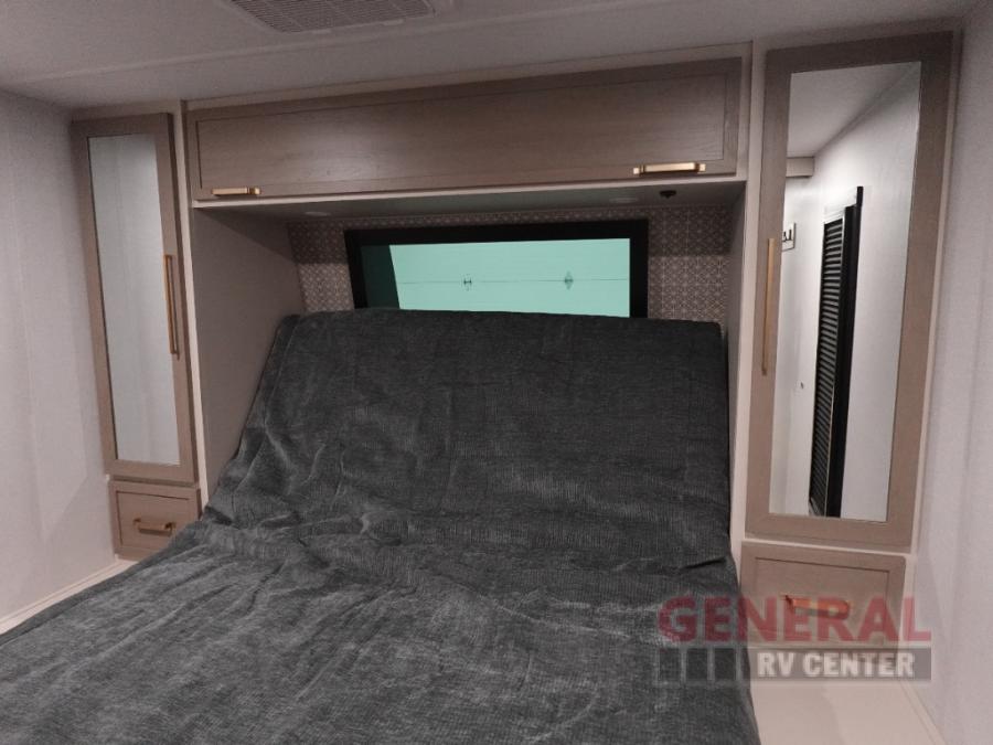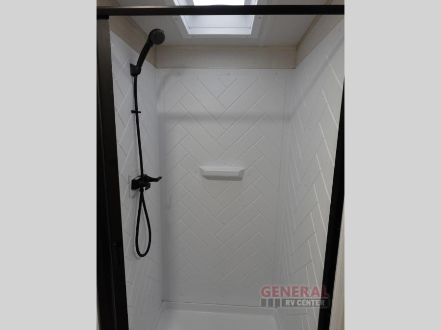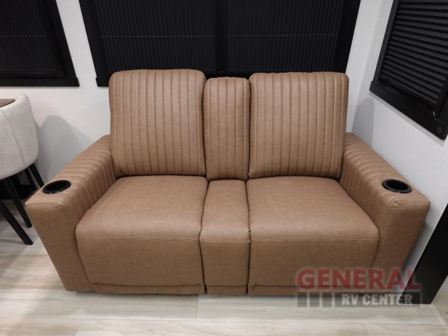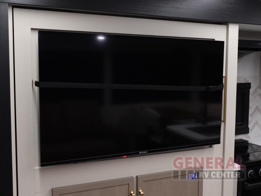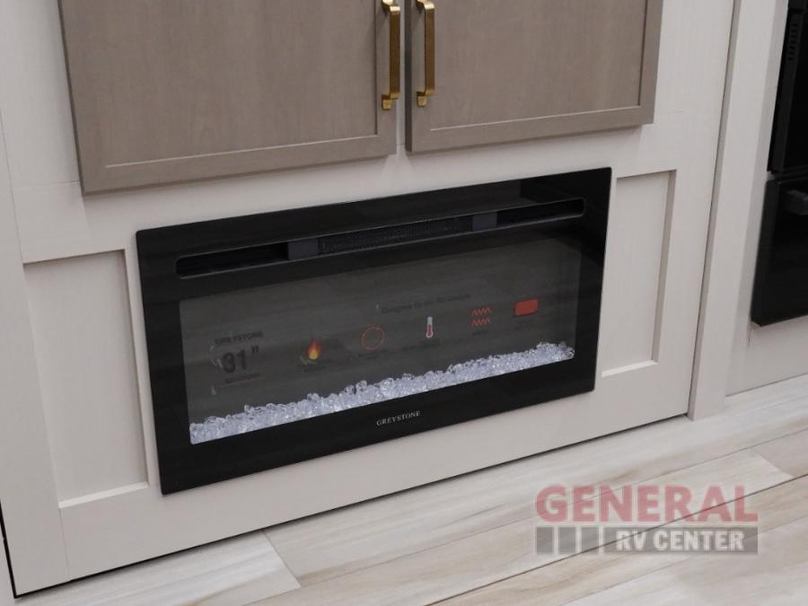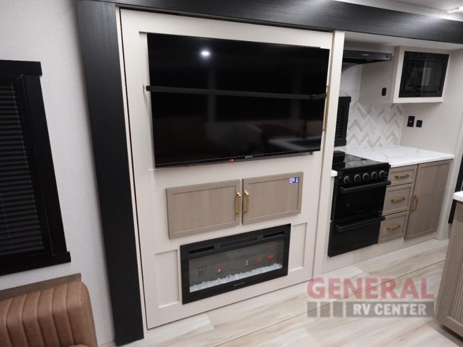 Step inside this luxurious travel trailer and see all that it has to offer! You will enjoy a good night's rest each night on the queen bed with Versa Tilt with wardrobes on either side to keep your clothes wrinkle free, and if you have a couple of guests then you can convert the rear tri-fold sofa into a sleeping space. The 30" x 36" walk-in shower with a skylight above invites you to take a hot, steamy shower after a fun-filled day outdoors. Once you're cleaned up, you can grab some leftovers from the 10 cu. ft. 12V black refrigerator and warm it up in the microwave. There is also theatre seating across from the 50" LED TV with a fireplace below!
