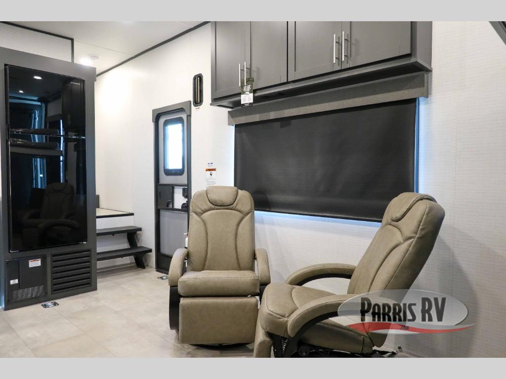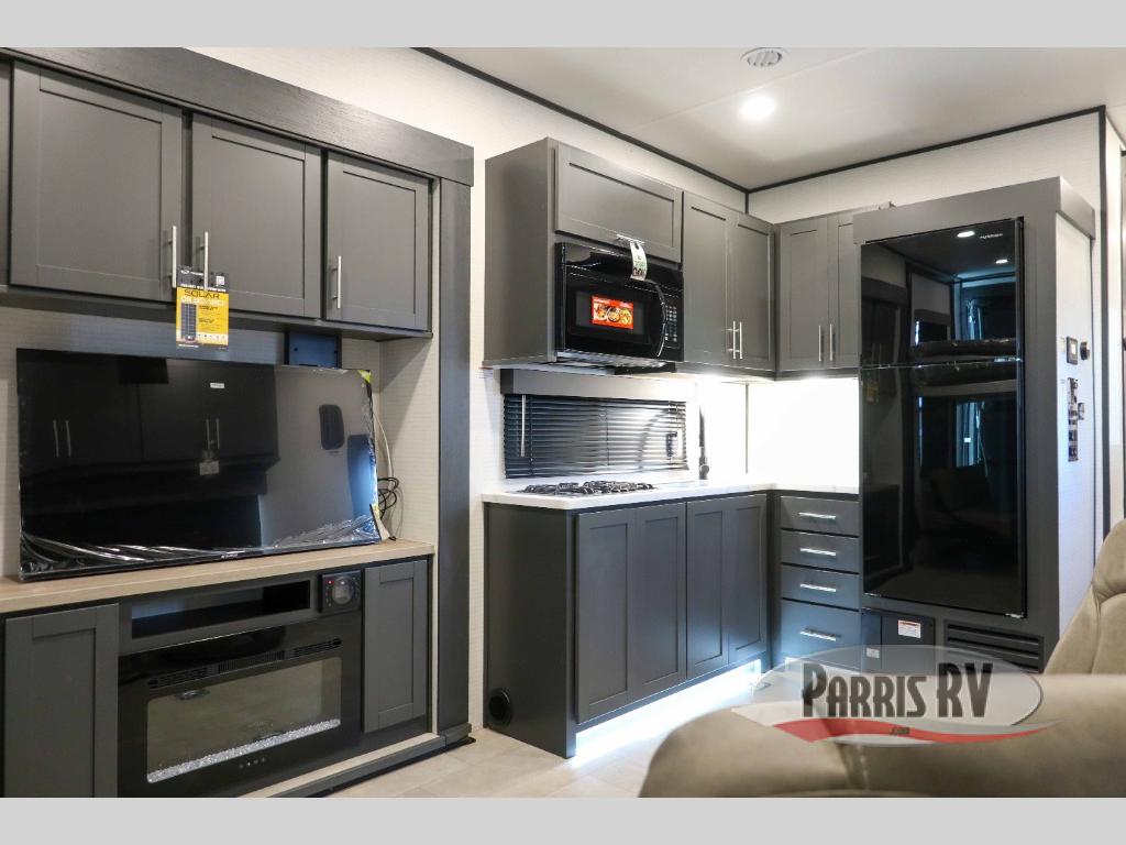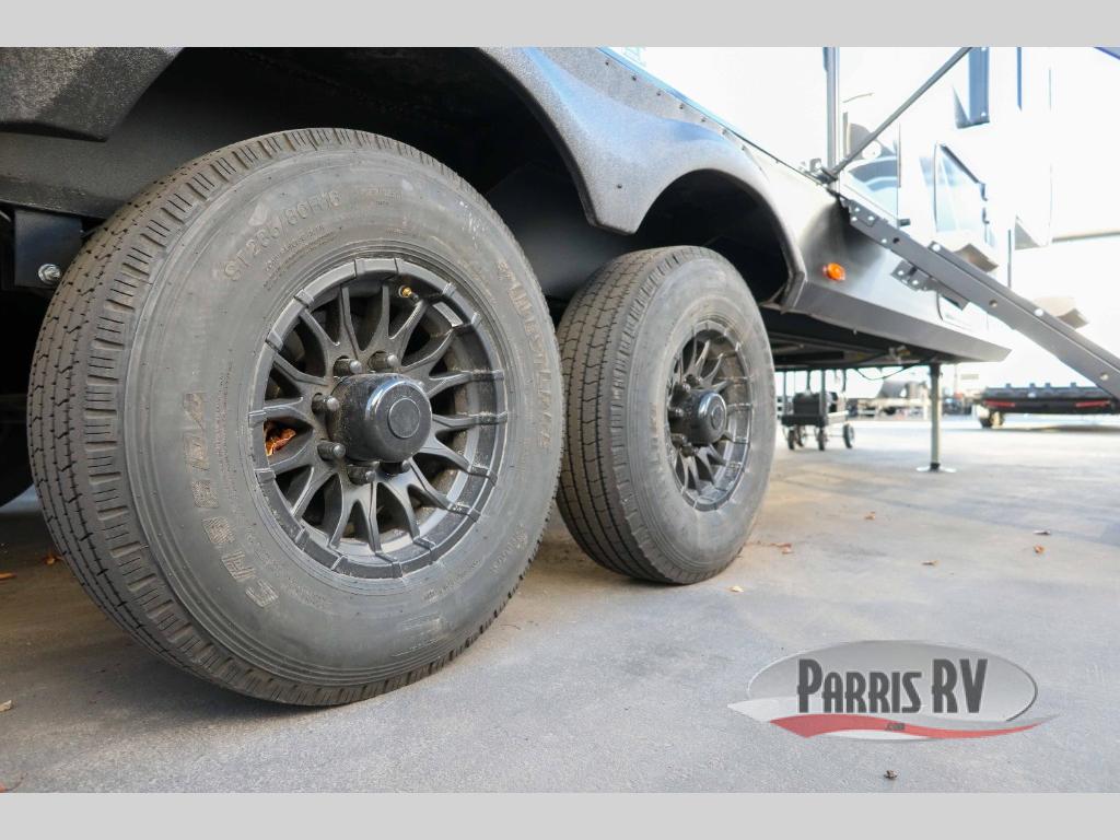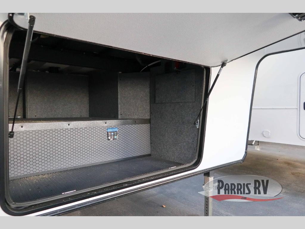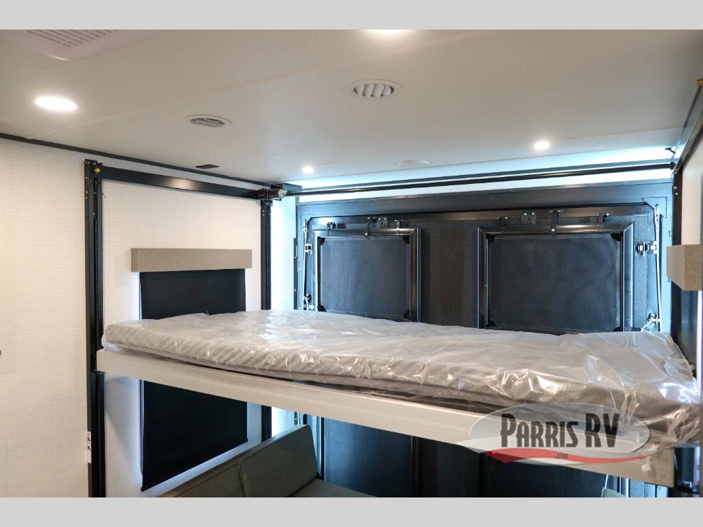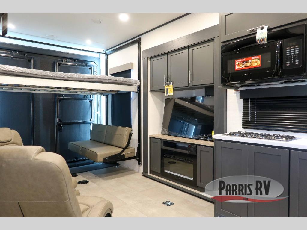 This toy hauler features 15' 7" of total garage space so you can easily fit your toys in! Once they're unloaded, you can relax on the electric pass-thru dinette or dual lounge chairs. There is also an entertainment center slide here. You'll find a cooktop and convection microwave in the kitchen to make meals each day. The full bath will let you clean up after trail riding, and the front private bedroom with a king bed is sure to bring a great night's rest. There is also a dresser slide out in the bedroom for added storage and space!