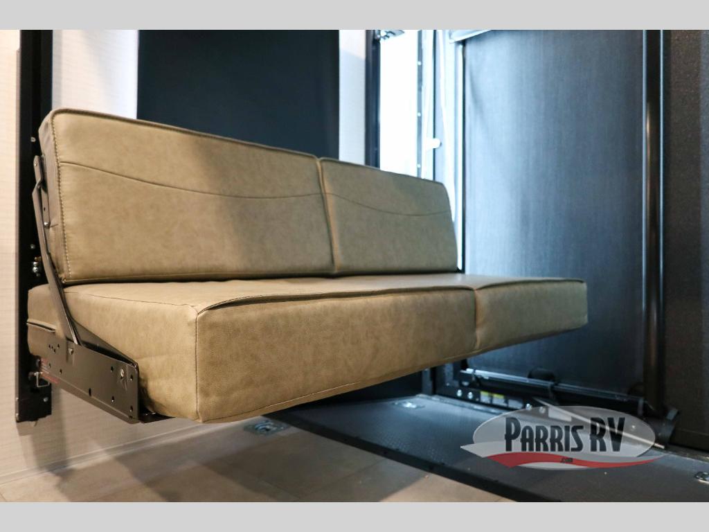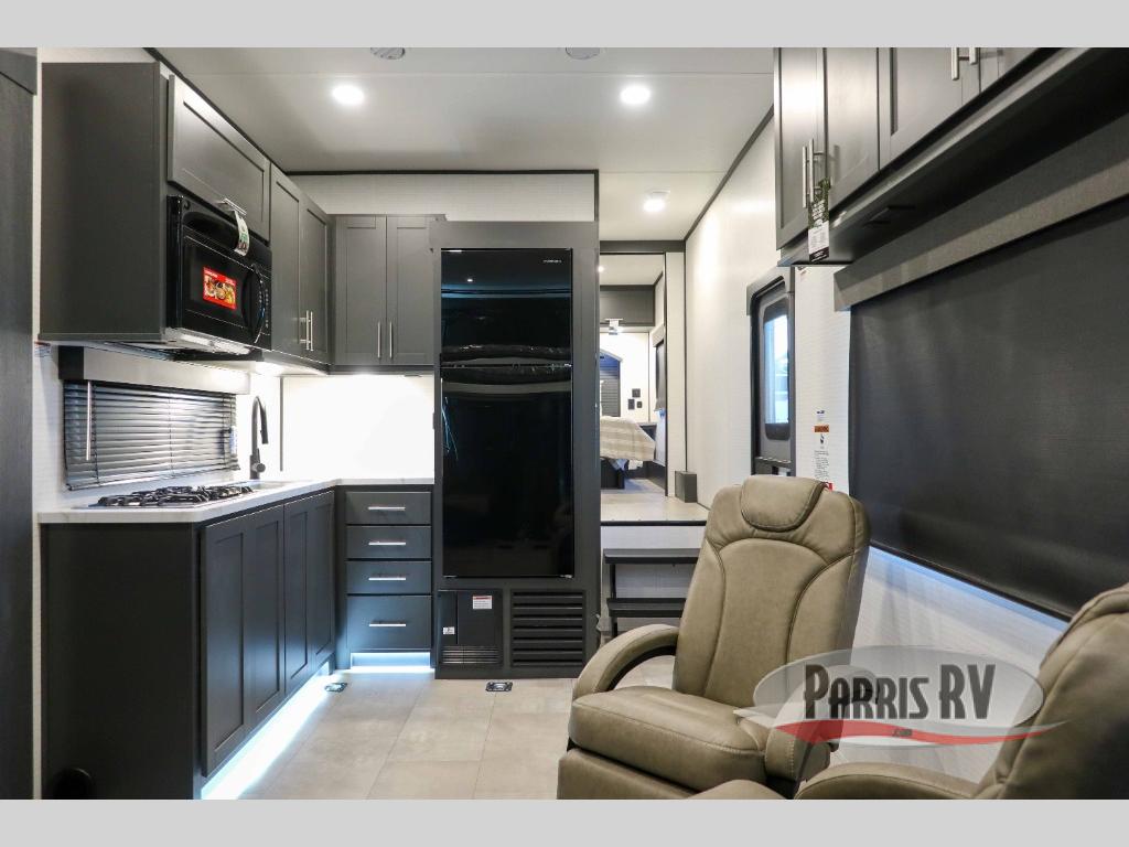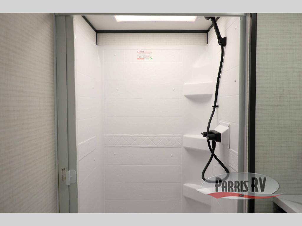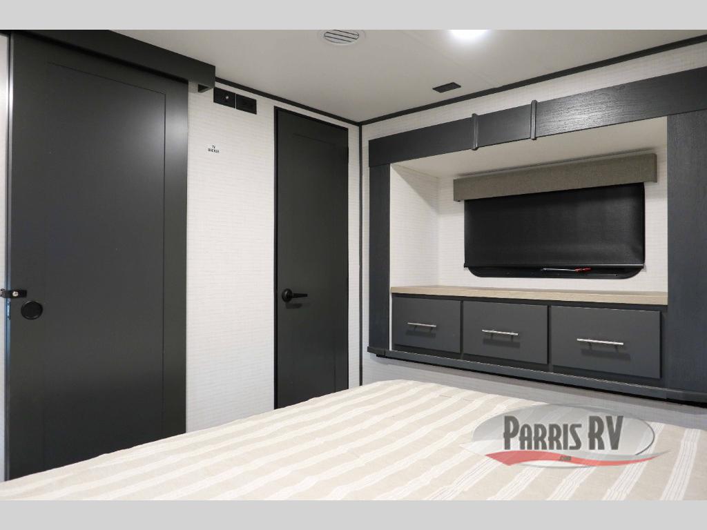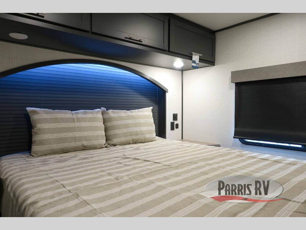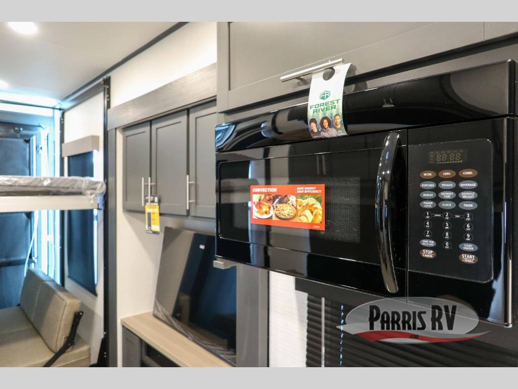 This toy hauler features 15' 7" of total garage space so you can easily fit your toys in! Once they're unloaded, you can relax on the electric pass-thru dinette or dual lounge chairs. There is also an entertainment center slide here. You'll find a cooktop and convection microwave in the kitchen to make meals each day. The full bath will let you clean up after trail riding, and the front private bedroom with a king bed is sure to bring a great night's rest. There is also a dresser slide out in the bedroom for added storage and space!