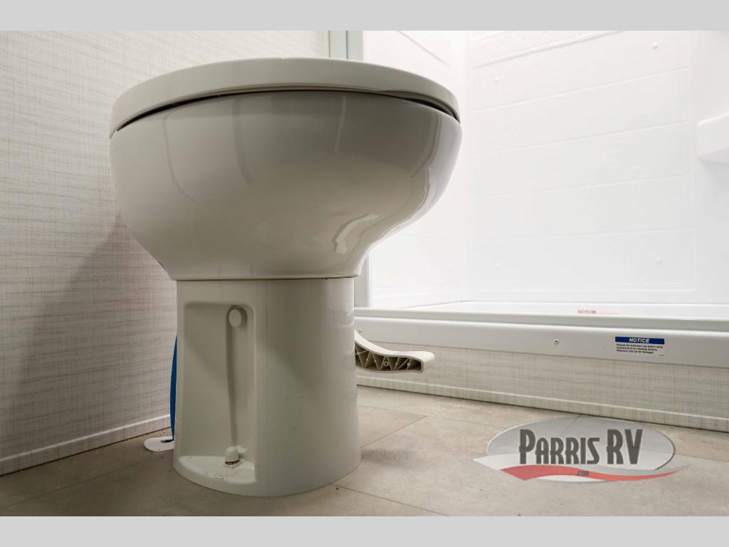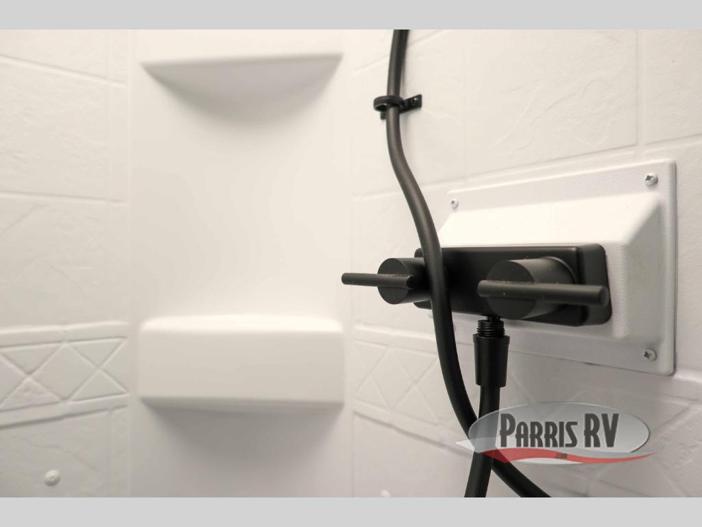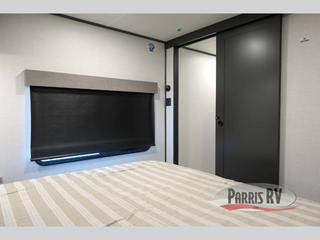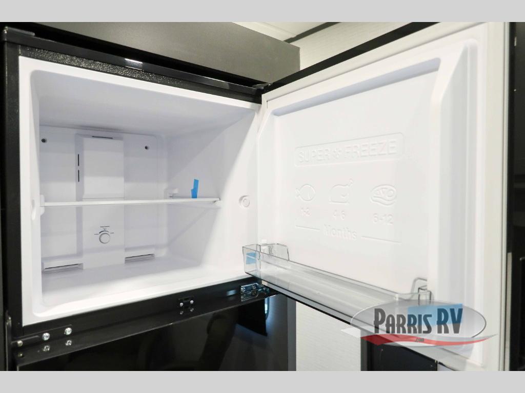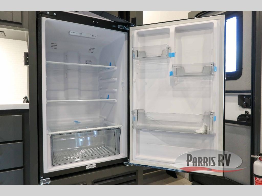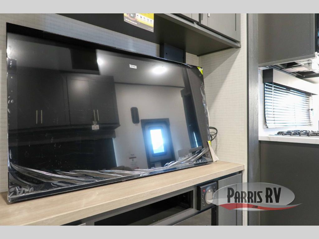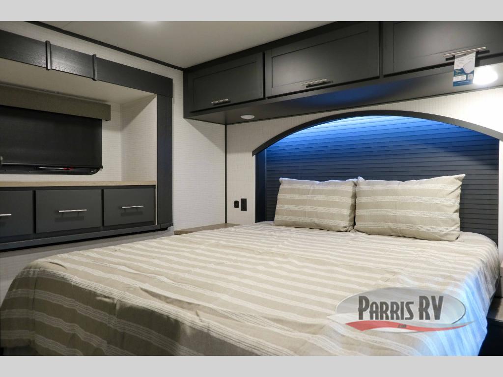 This toy hauler features 15' 7" of total garage space so you can easily fit your toys in! Once they're unloaded, you can relax on the electric pass-thru dinette or dual lounge chairs. There is also an entertainment center slide here. You'll find a cooktop and convection microwave in the kitchen to make meals each day. The full bath will let you clean up after trail riding, and the front private bedroom with a king bed is sure to bring a great night's rest. There is also a dresser slide out in the bedroom for added storage and space!