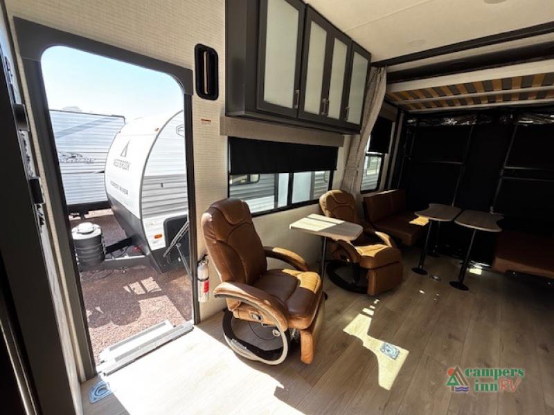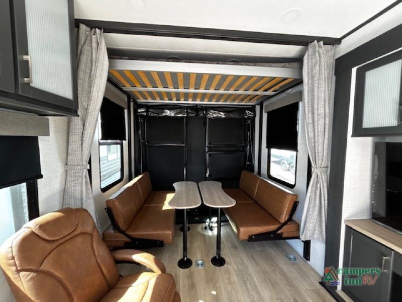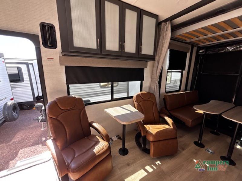 Dual Lounge Chairs & Electric Pass-Thru Dinette – Perfect for relaxing, dining, or turning into extra sleeping space.