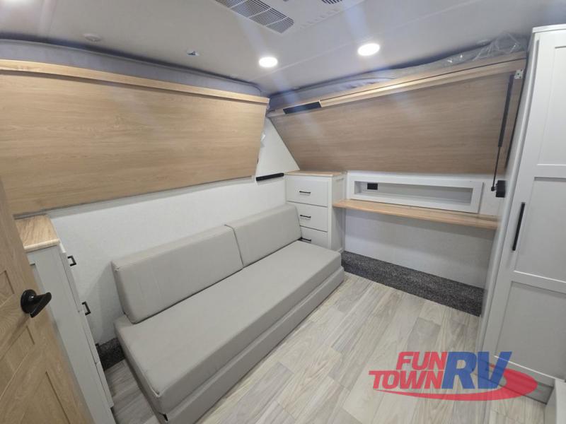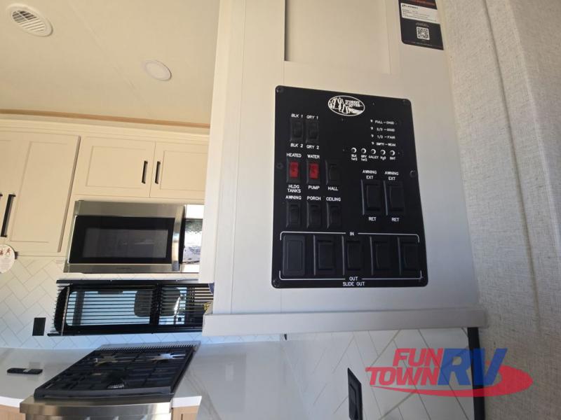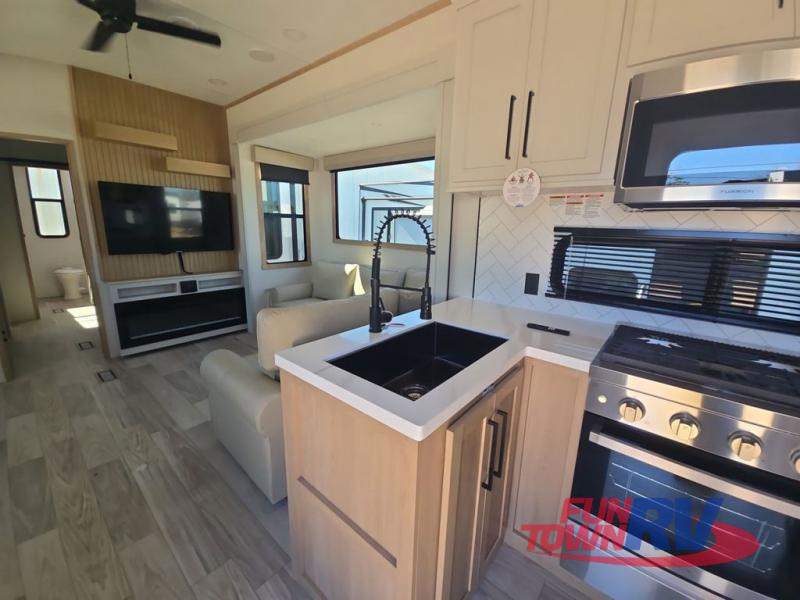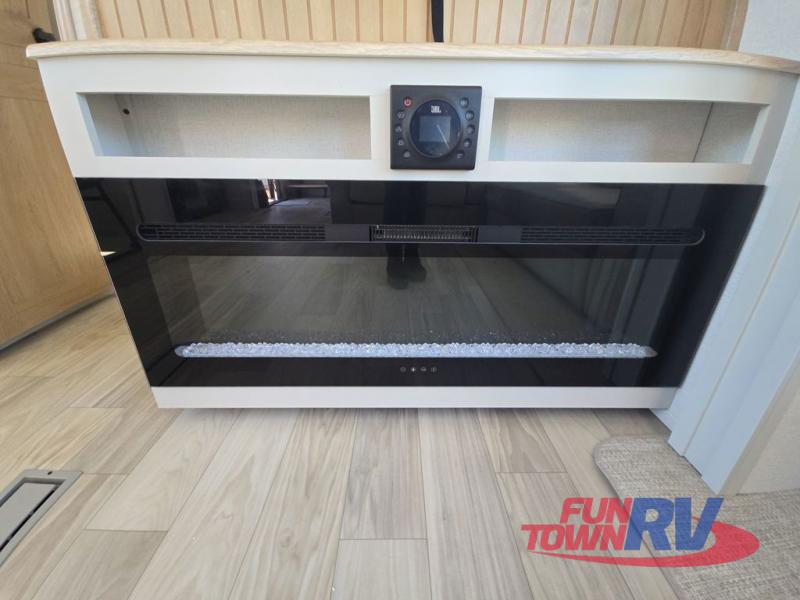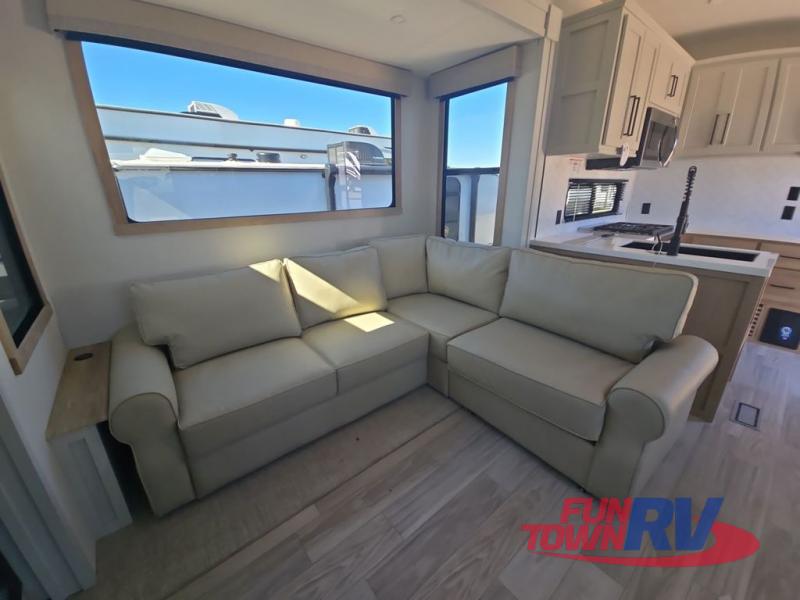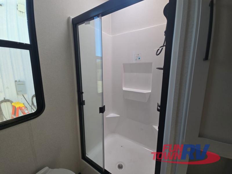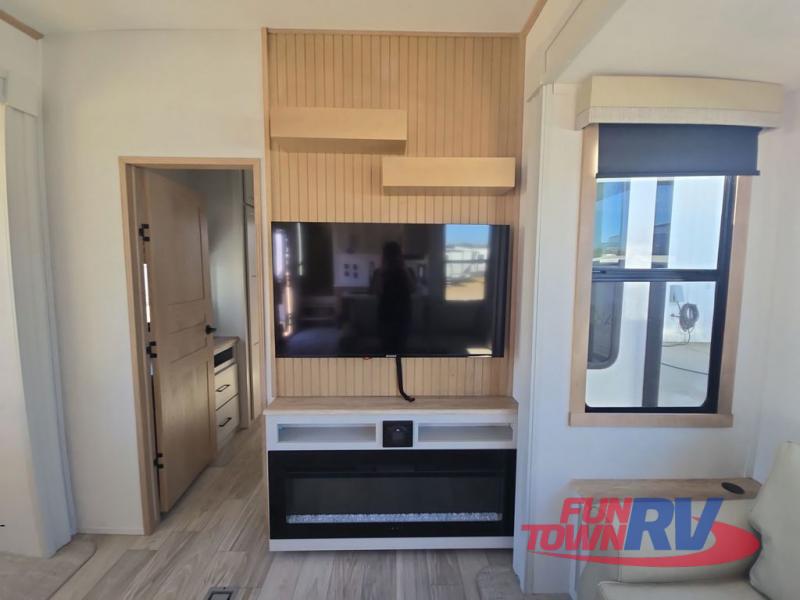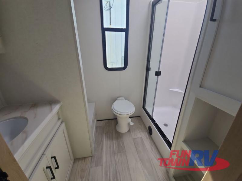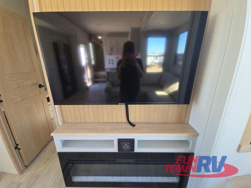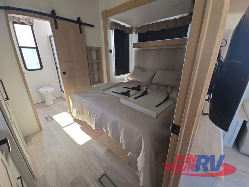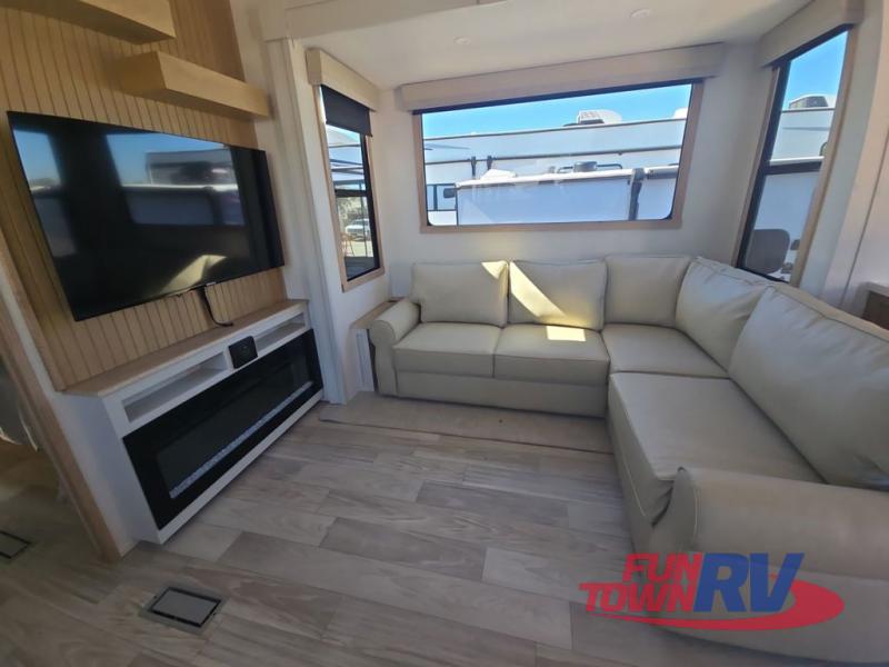 This Sierra fifth wheel is thoughtfully designed for comfort and convenience, starting with a spacious front bunkhouse perfect for accommodating guests. It features two flip-up bunks, 28" x 74" and 32" x 74" and a 60" x 74" fold-out lounge, along with a wardrobe, dresser, and additional storage to keep essentials organized. A nearby half bath adds easy access and extra convenience. At the center of the unit, the kitchen offers everything you need to prepare meals, including a stainless-steel sink, three-burner cooktop, and a generous 16 cu. ft. refrigerator. Meals can be enjoyed at the free-standing dinette, or you can unwind on the sectional sofa while enjoying the fireplace or entertainment center. At the rear, you'll find the private main bedroom with a roomy 66" x 80" RV king bed, plus its own wardrobe and dresser. Just steps away is the full bathroom featuring a one-piece fiberglass shower, sink with medicine cabinet, linen storage, and even washer/dryer prep for extended stays.