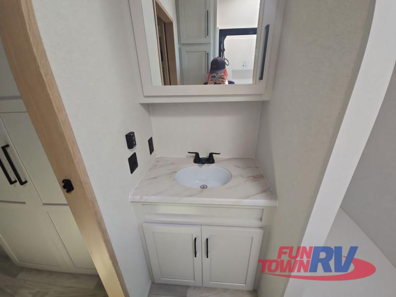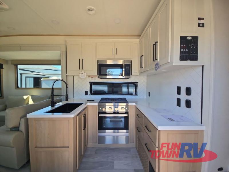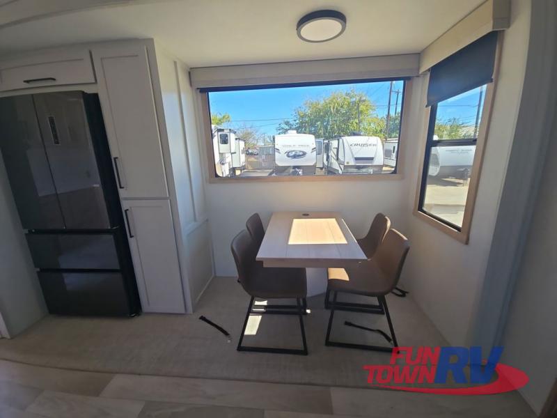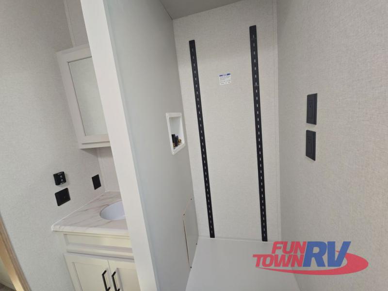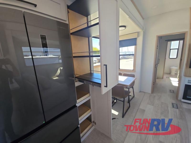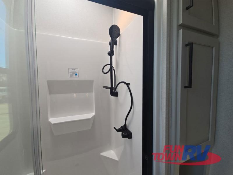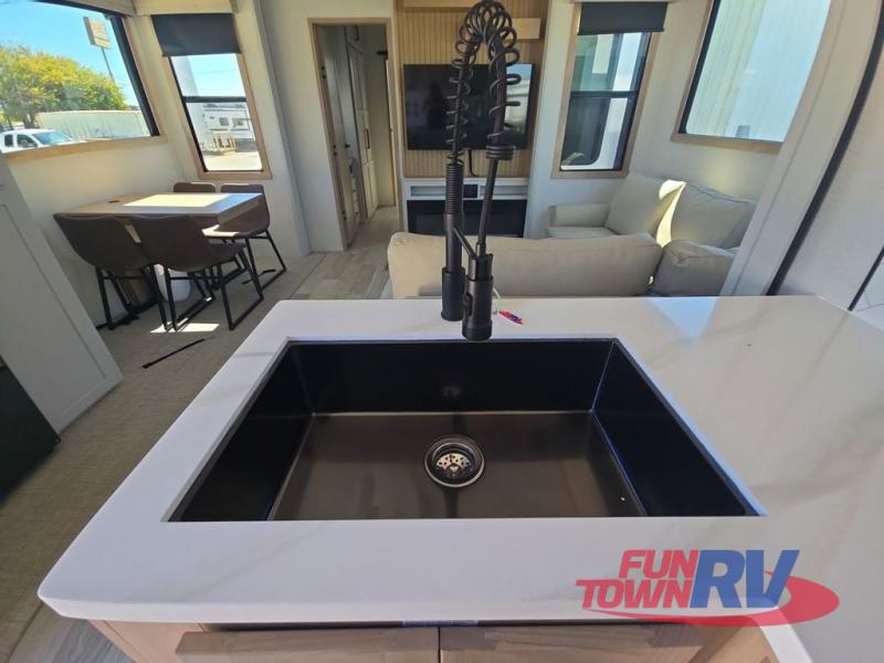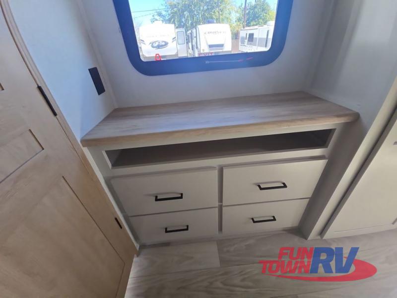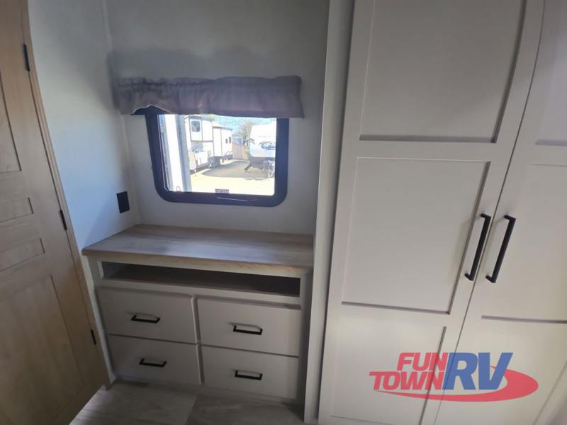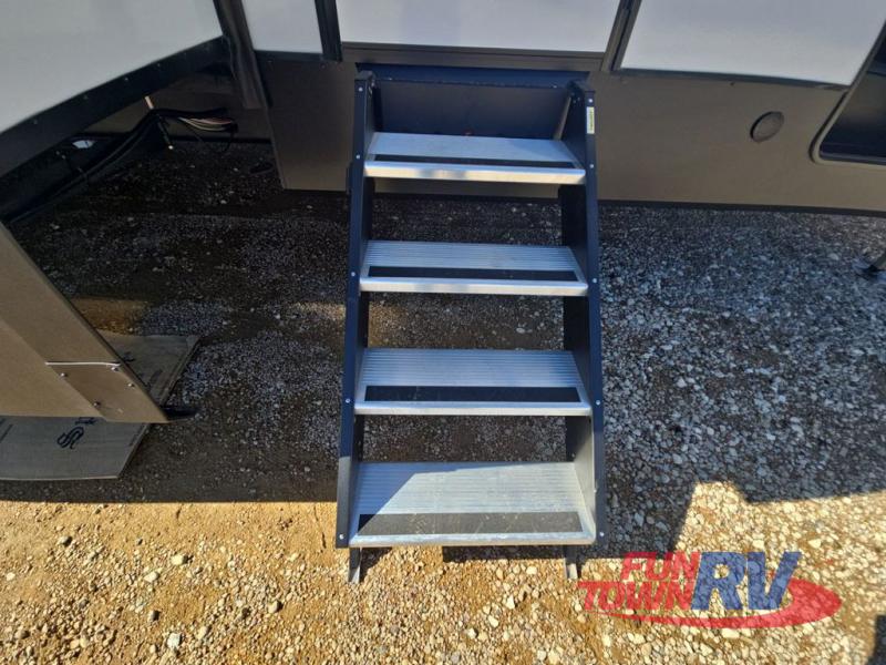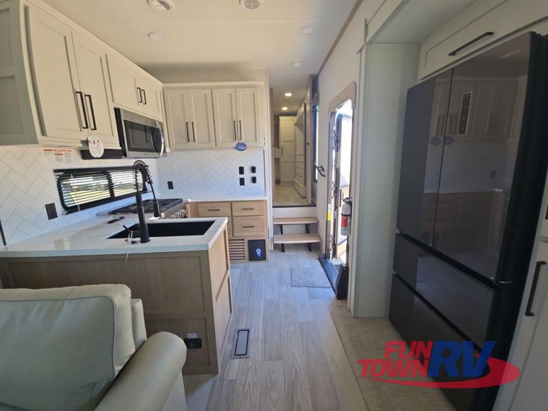 This Sierra fifth wheel is thoughtfully designed for comfort and convenience, starting with a spacious front bunkhouse perfect for accommodating guests. It features two flip-up bunks, 28" x 74" and 32" x 74" and a 60" x 74" fold-out lounge, along with a wardrobe, dresser, and additional storage to keep essentials organized. A nearby half bath adds easy access and extra convenience. At the center of the unit, the kitchen offers everything you need to prepare meals, including a stainless-steel sink, three-burner cooktop, and a generous 16 cu. ft. refrigerator. Meals can be enjoyed at the free-standing dinette, or you can unwind on the sectional sofa while enjoying the fireplace or entertainment center. At the rear, you'll find the private main bedroom with a roomy 66" x 80" RV king bed, plus its own wardrobe and dresser. Just steps away is the full bathroom featuring a one-piece fiberglass shower, sink with medicine cabinet, linen storage, and even washer/dryer prep for extended stays.