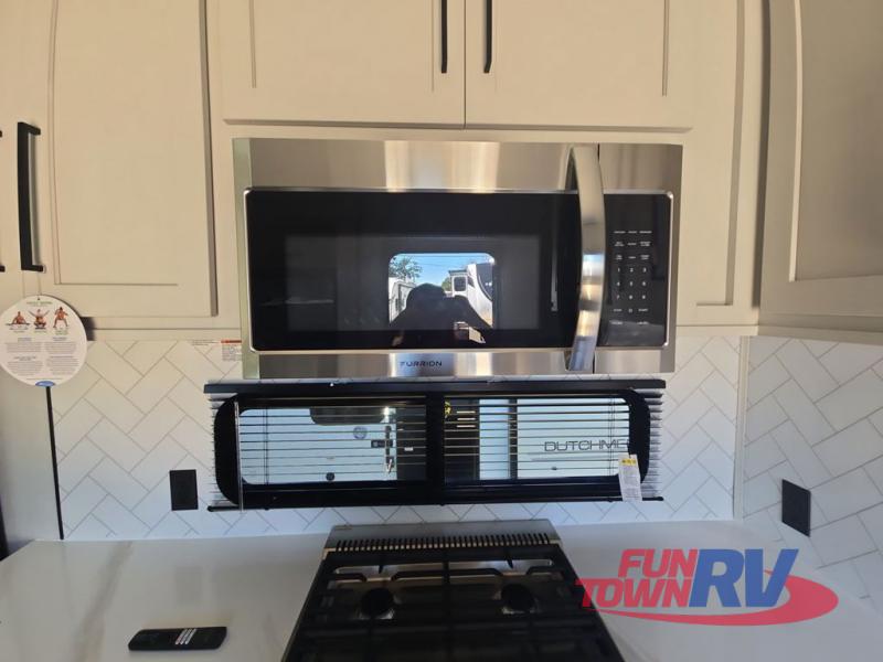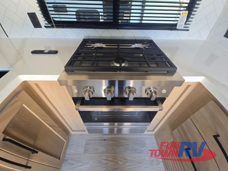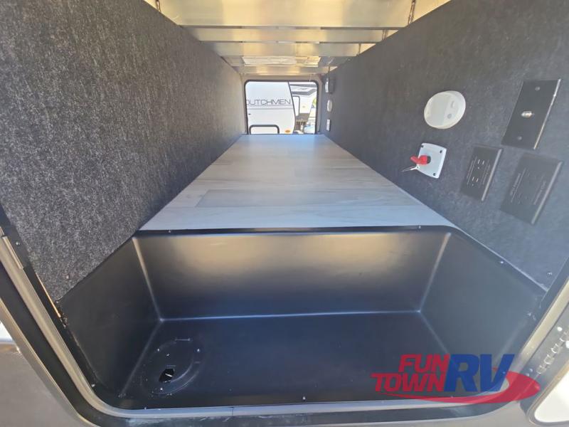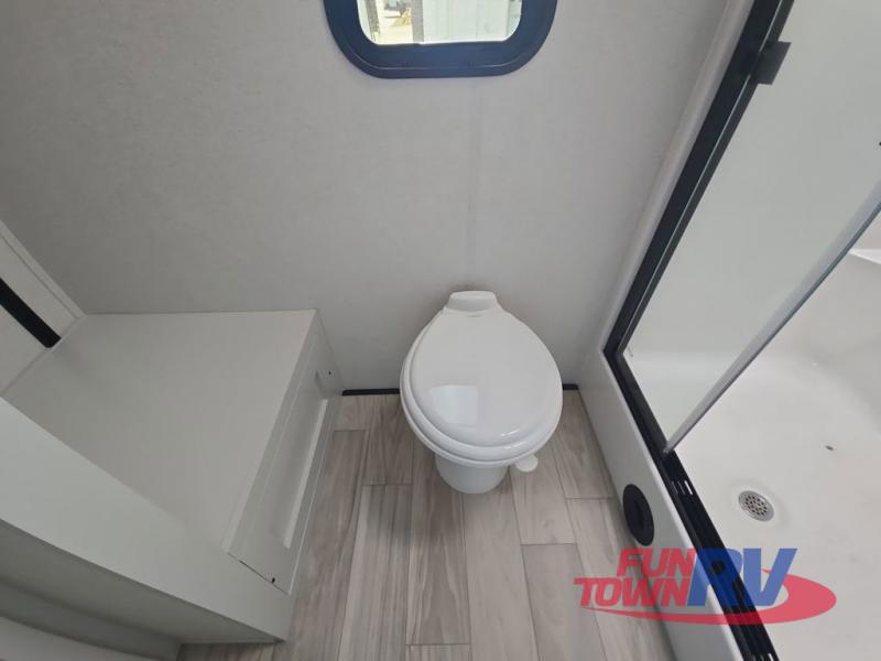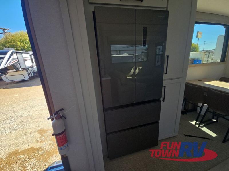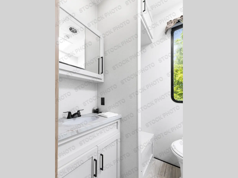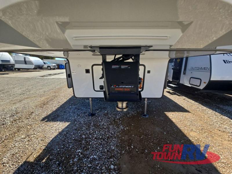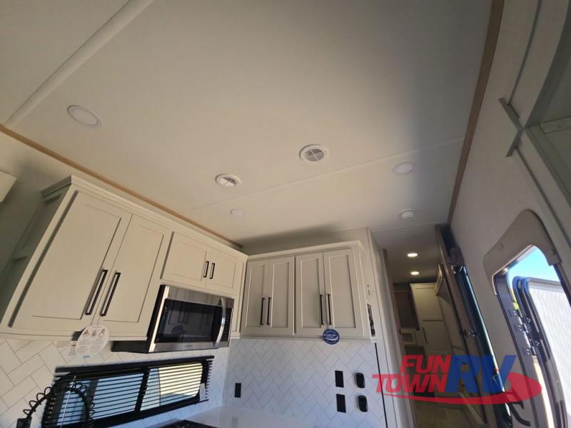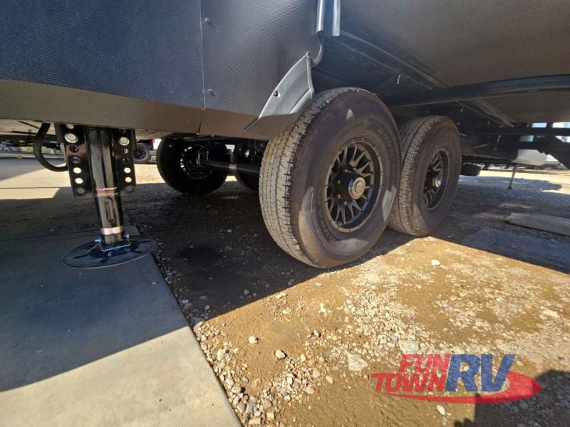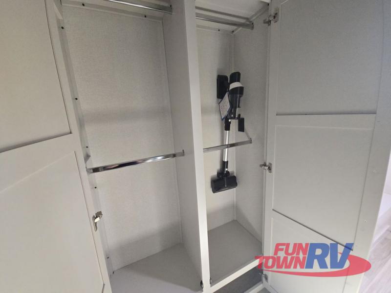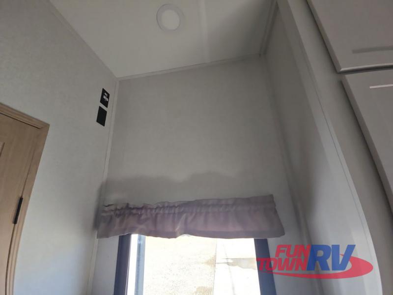 This Sierra fifth wheel is thoughtfully designed for comfort and convenience, starting with a spacious front bunkhouse perfect for accommodating guests. It features two flip-up bunks, 28" x 74" and 32" x 74" and a 60" x 74" fold-out lounge, along with a wardrobe, dresser, and additional storage to keep essentials organized. A nearby half bath adds easy access and extra convenience. At the center of the unit, the kitchen offers everything you need to prepare meals, including a stainless-steel sink, three-burner cooktop, and a generous 16 cu. ft. refrigerator. Meals can be enjoyed at the free-standing dinette, or you can unwind on the sectional sofa while enjoying the fireplace or entertainment center. At the rear, you'll find the private main bedroom with a roomy 66" x 80" RV king bed, plus its own wardrobe and dresser. Just steps away is the full bathroom featuring a one-piece fiberglass shower, sink with medicine cabinet, linen storage, and even washer/dryer prep for extended stays.