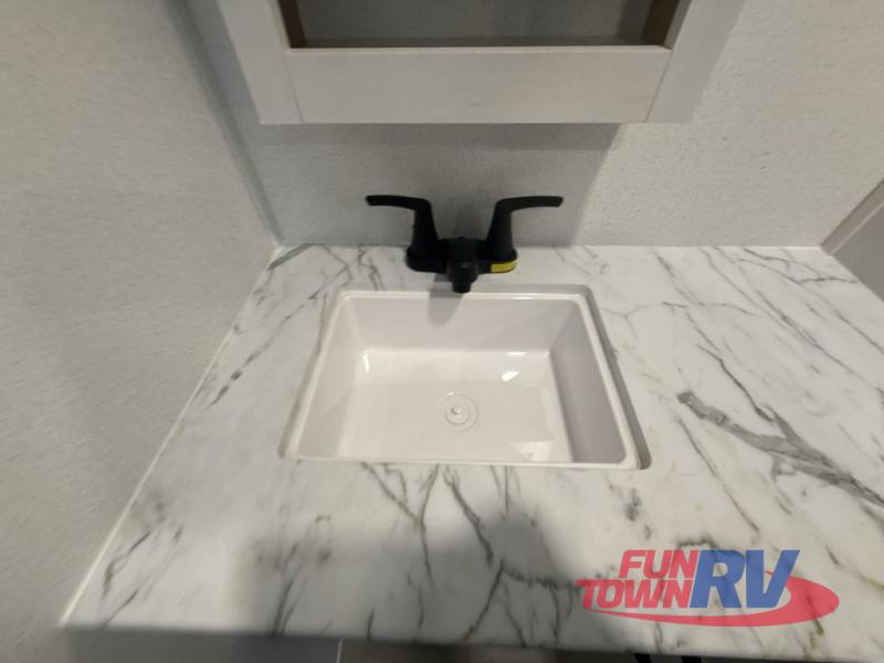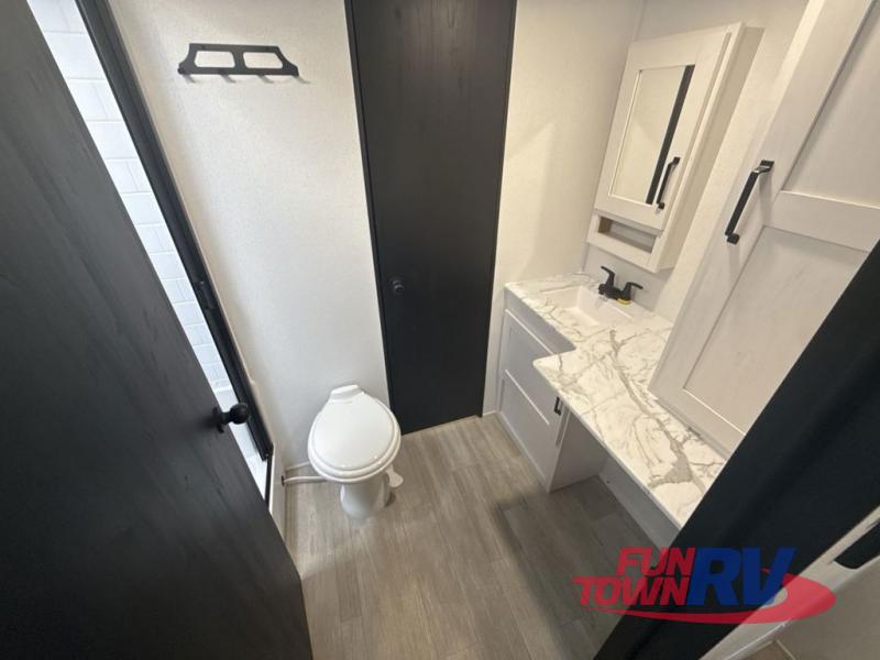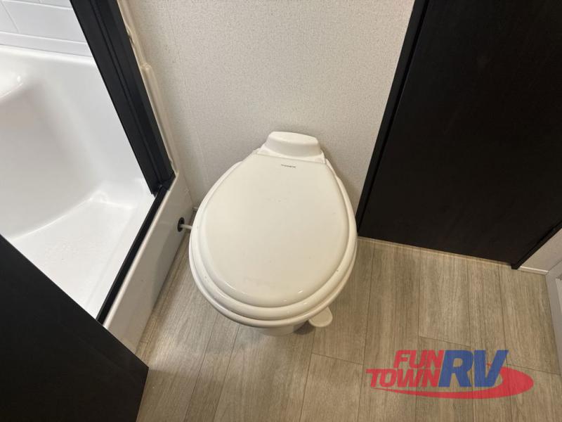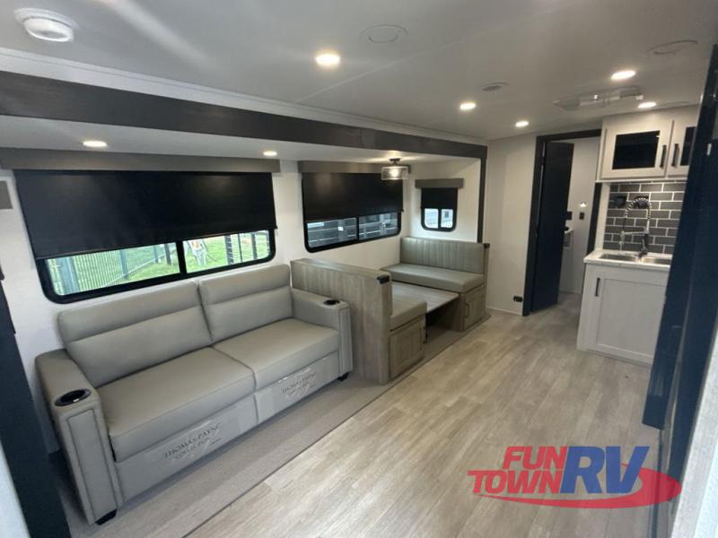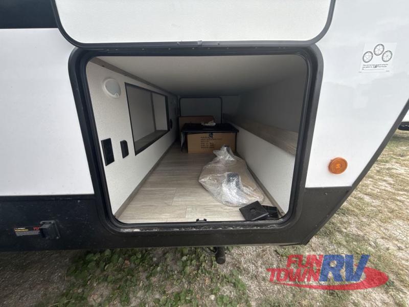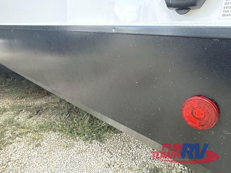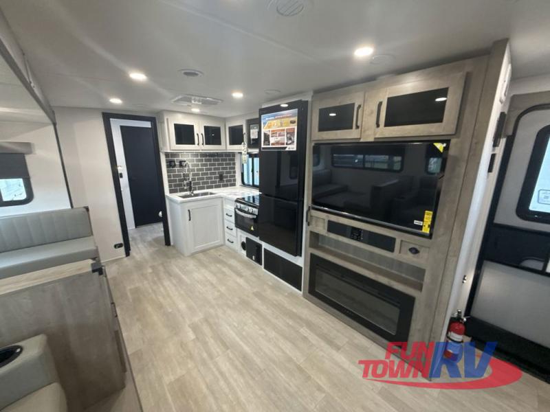 Whether you are looking for a bunkhouse, a private bedroom, or dual entry doors in your next RV, this one might just be the perfect fit with all those features! There are 45" x 72" bunk beds, each with their own wardrobe and their own private entry door, making it perfect for camping with older kids. The galley kitchen offers amenities such as a microwave, cooktop, an 11 cu. ft. refrigerator, and an L-shaped counter for preparing and serving meals. You will also find more storage, an entertainment center and a slide out sofa sleeper and booth dinette that offer more sleeping space when needed.