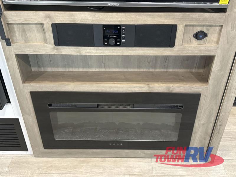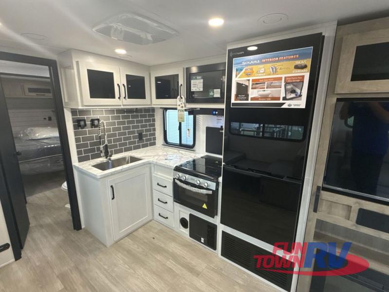 Each SolAire travel trailer by Palomino features a white gel coat exterior and an aluminum superstructure frame for lightweight towing. You will love having a power tongue jack for easy set up, plus slam latch baggage doors with magnets to make unloading easier than ever. There is also a power awning with LED lights and aluminum wheels included on the exterior. Each SolAire is constructed to last with Azdel composite, a fully laminated rear wall and roof, plus a fully enclosed and heated underbelly. The interior includes roller shades and kitchen backsplash, USB ports to keep your electronics charged, a Bluetooth stereo with speakers, and many more stand-out features!