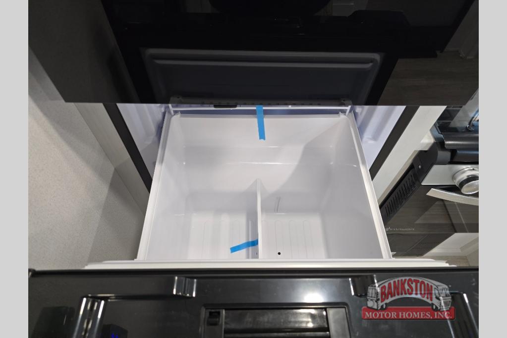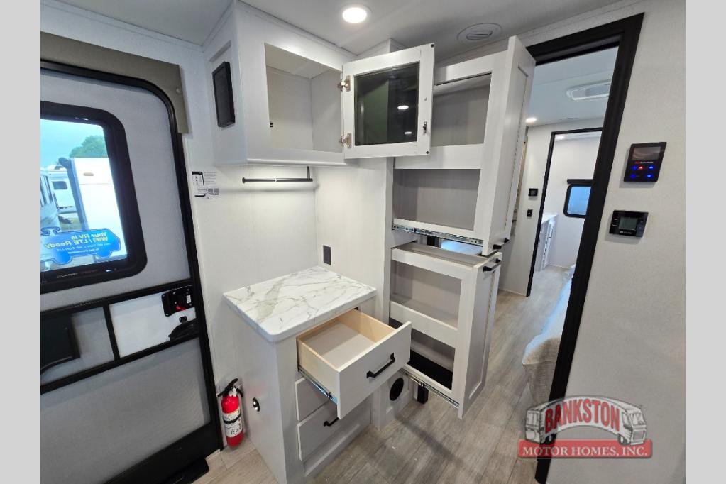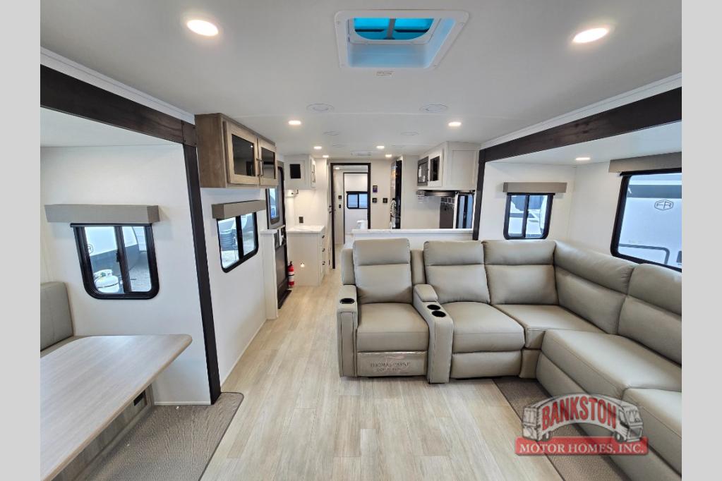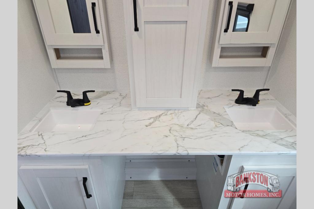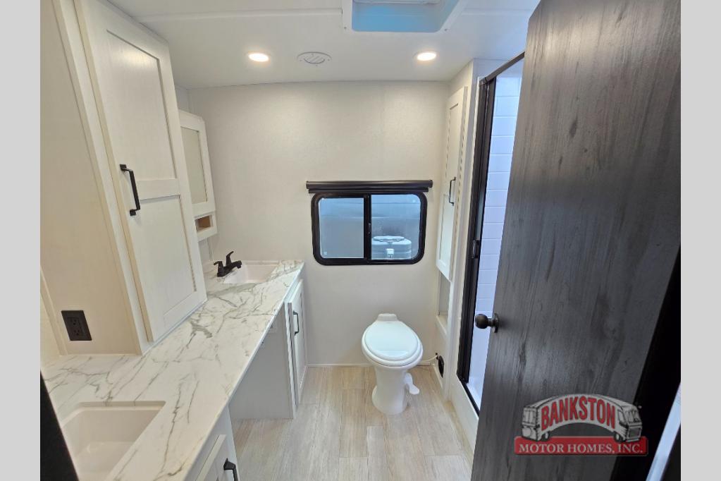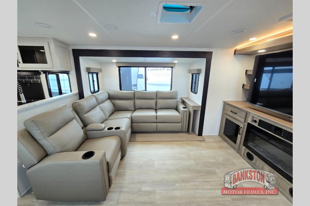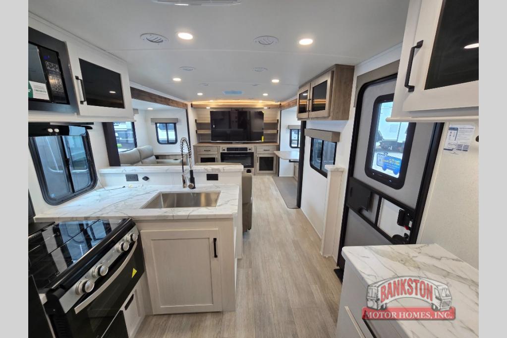 This travel trailer will feel just like home with its front living area, master bedroom, and triple slides for more space! You'll enjoy the sectional sofa and 63" dinette with two chairs on one side with a bench seat on the other. There is a front entertainment center where you can add an optional TV, and the fireplace will make it more cozy. A middle kitchen includes all the appliances to make meals each day, plus an electric refrigerator and pantry for food storage. Head towards the back to find the master bedroom with a king bed slide out, dual wardrobes, and a desk with drawers if you need to get some work done. And the full rear bath is super accommodating with its dual bath sinks plus washer and dryer prep!