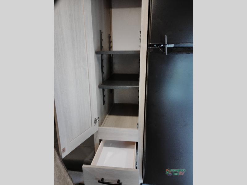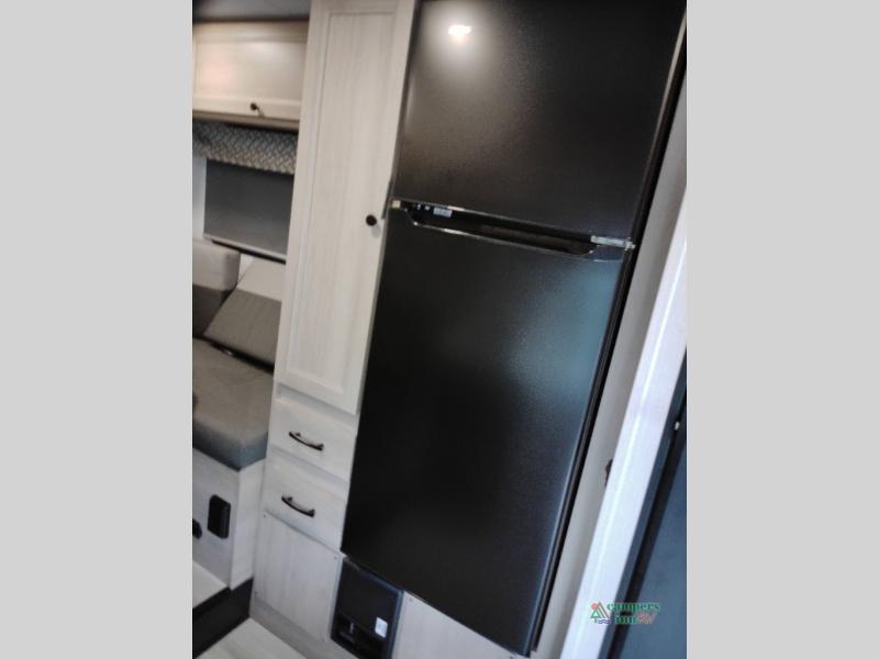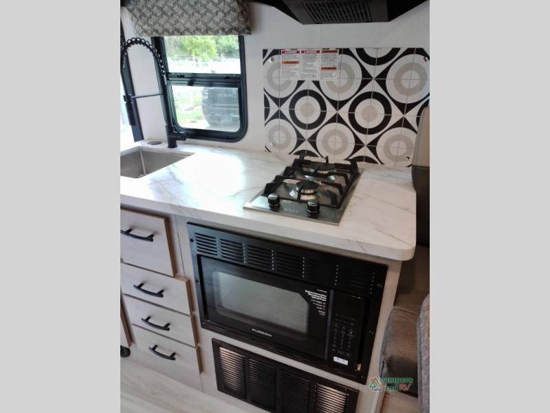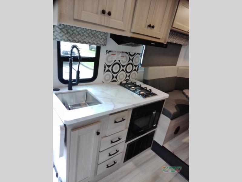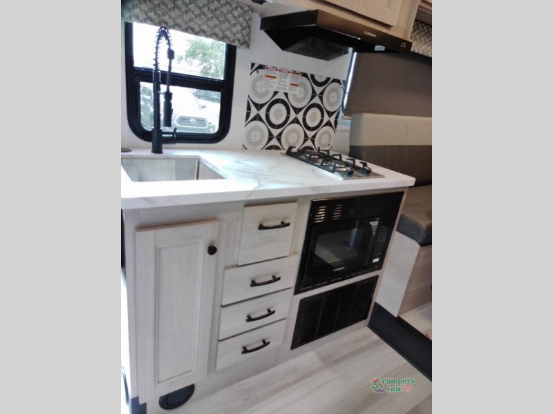Fully equipped kitchen with convection microwave air fryer and 10 cu. ft. 12V refrigerator