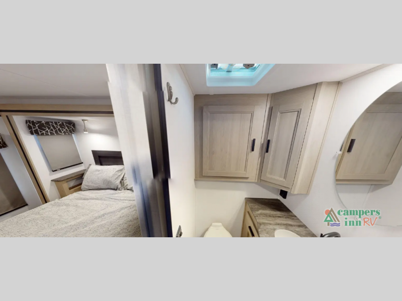 After a day full of adventure, unwind in your own private retreat featuring an RV queen bed slide for extra room, dual nightstands, and ample overhead storage. The split bathroom design gives you a residential feel with a 24" x 36" shower on one side and a private lavatory and vanity on the other, so two people can get ready without waiting in line.