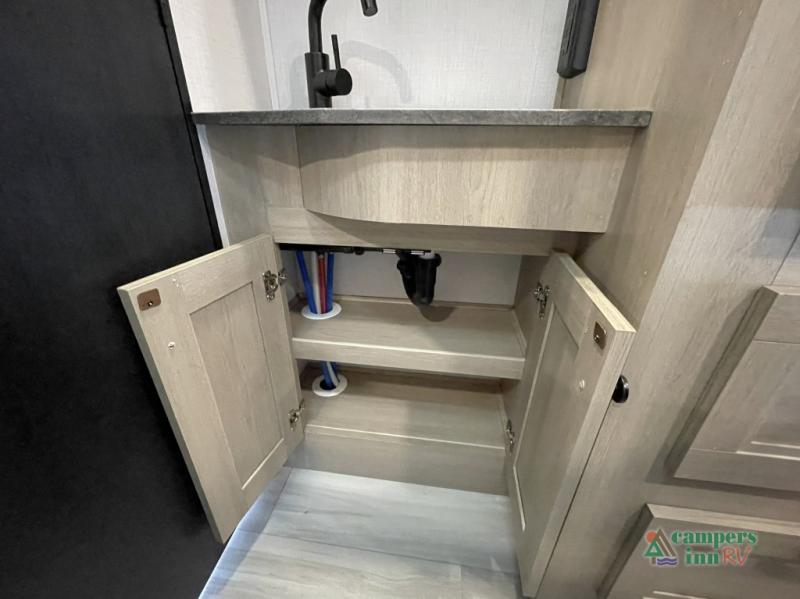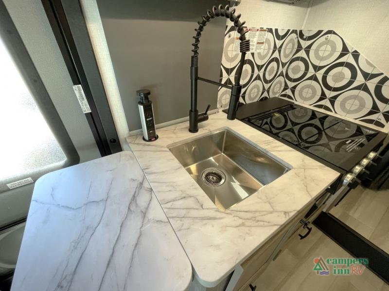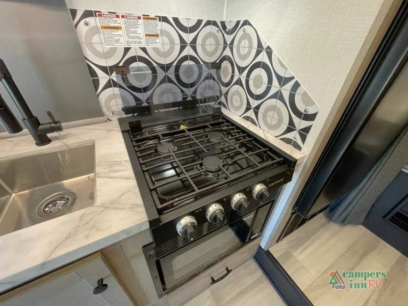A recessed three-burner range, convection microwave, and flip-up countertop extension let you cook like you're at home, even off-grid.