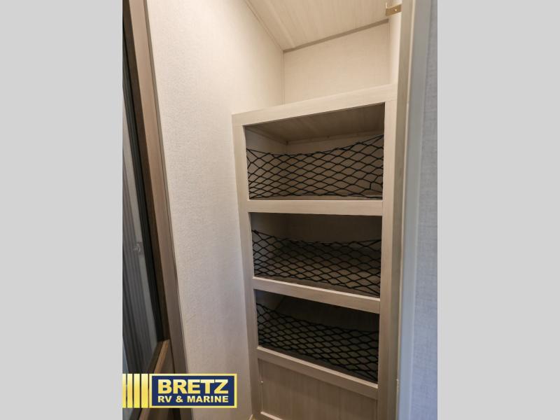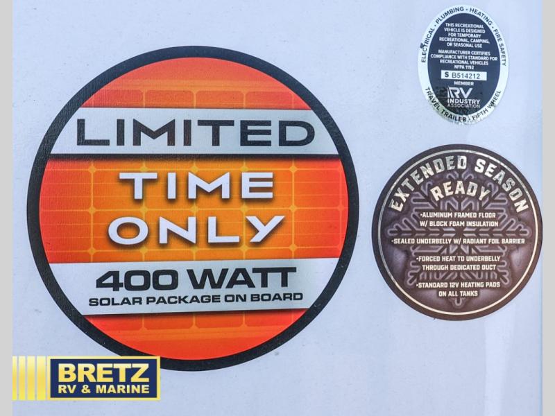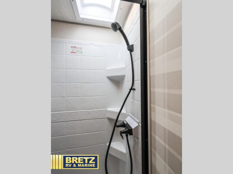 Whether you're camping with friends or family, you'll love the space and comfort found in this travel trailer. The outside kitchen is packed with features, such as a gas griddle, sink, refrigerator, and a shelf, plus there is a 21' electric awning for shade. Head inside to relax on the EZ- out sofa, or play a game at the booth dinette. You will also love the HD TV for your favorite shows at night. This model includes a full rear bath with a linen closet for clean towels and an upgraded slow-close shower door.