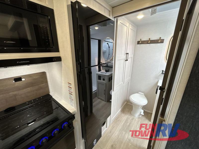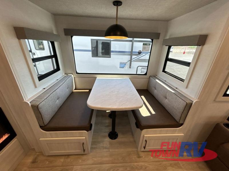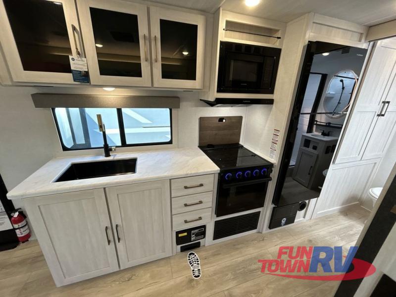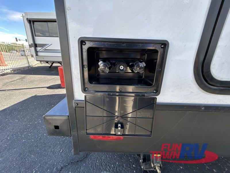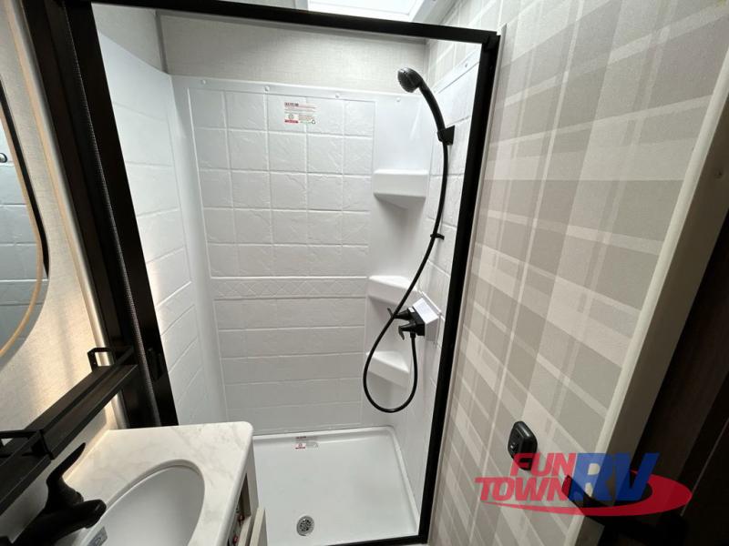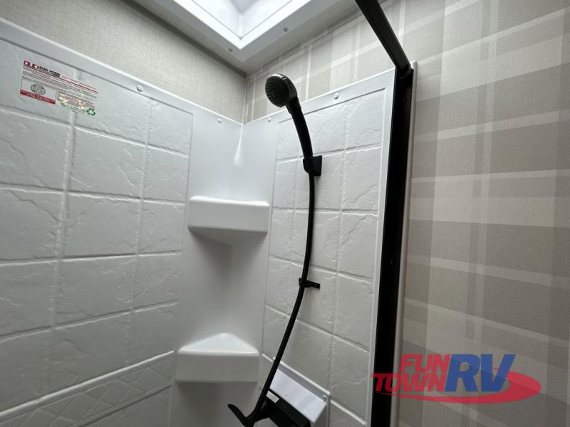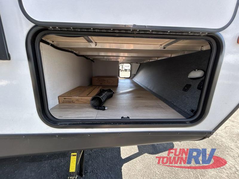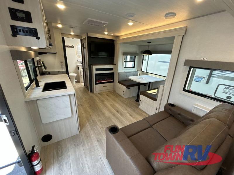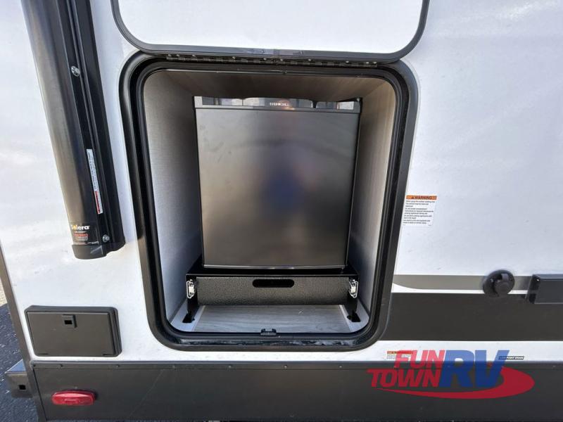 Whether you're camping with friends or family, you'll love the space and comfort found in this travel trailer. The outside kitchen is packed with features, such as a gas griddle, sink, refrigerator, and a shelf, plus there is a 21' electric awning for shade. Head inside to relax on the EZ- out sofa, or play a game at the booth dinette. You will also love the HD TV for your favorite shows at night. This model includes a full rear bath with a linen closet for clean towels and an upgraded slow-close shower door.