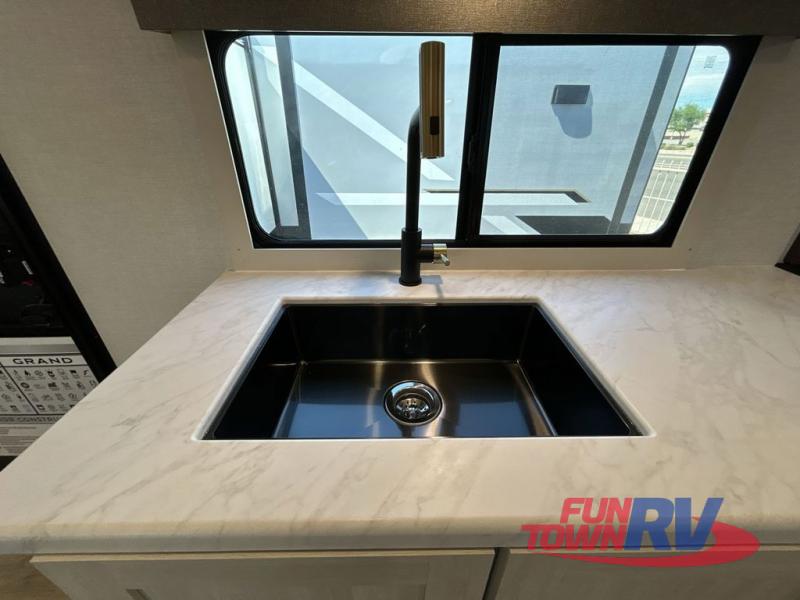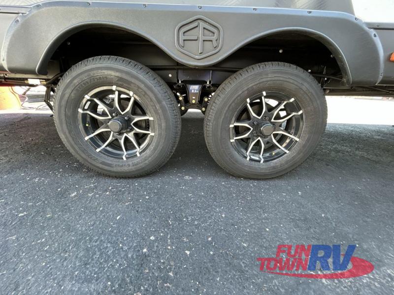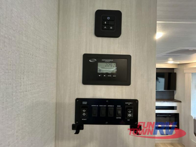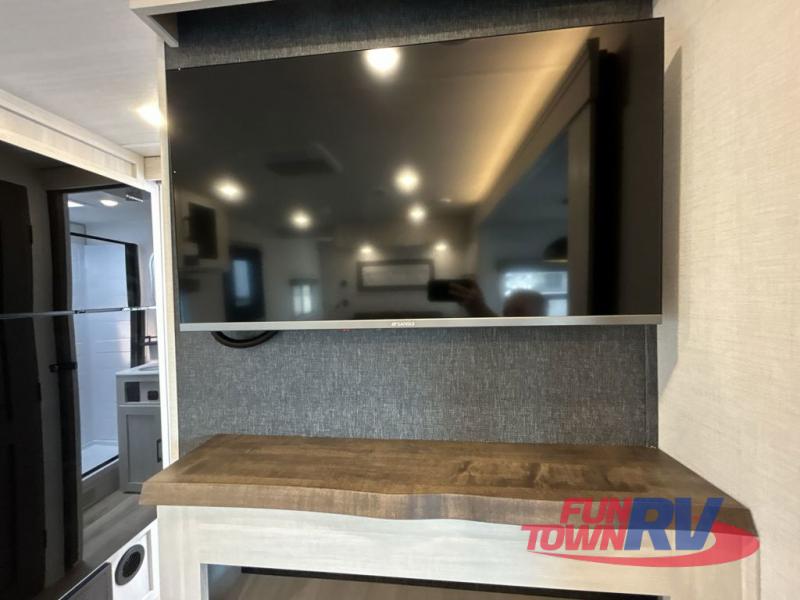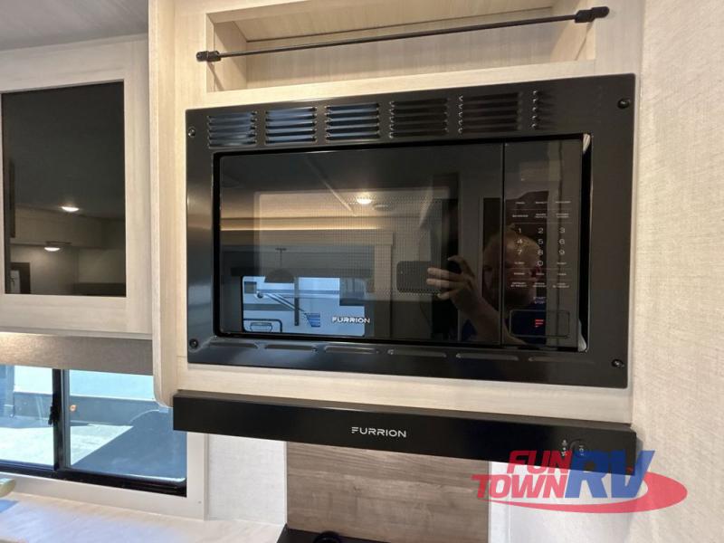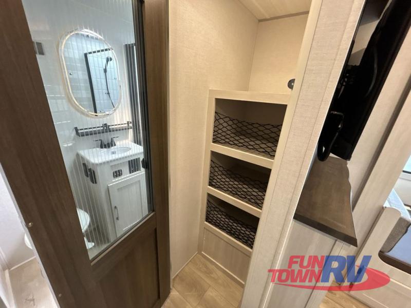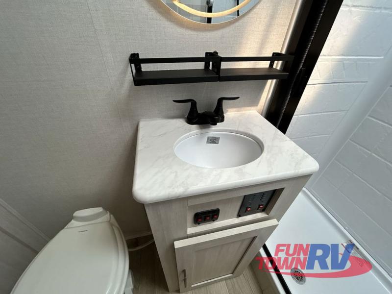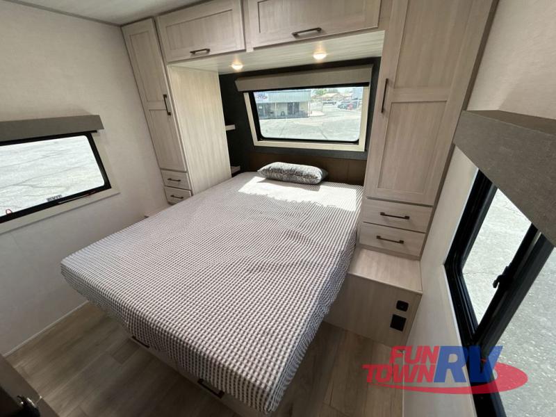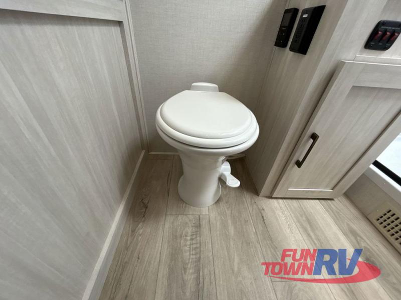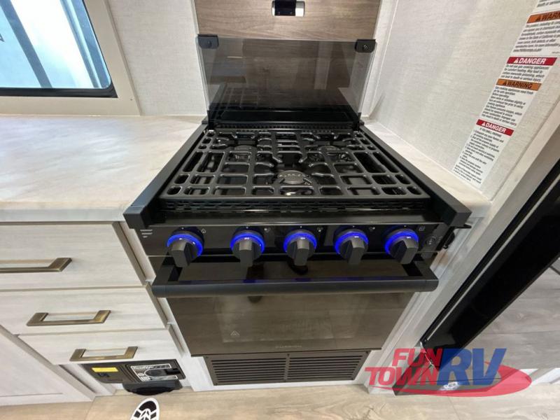 Whether you're camping with friends or family, you'll love the space and comfort found in this travel trailer. The outside kitchen is packed with features, such as a gas griddle, sink, refrigerator, and a shelf, plus there is a 21' electric awning for shade. Head inside to relax on the EZ- out sofa, or play a game at the booth dinette. You will also love the HD TV for your favorite shows at night. This model includes a full rear bath with a linen closet for clean towels and an upgraded slow-close shower door.