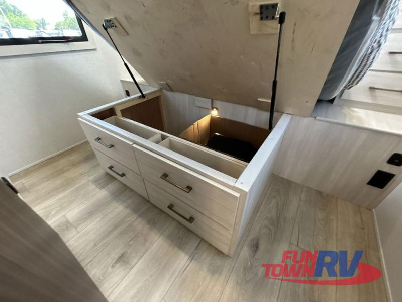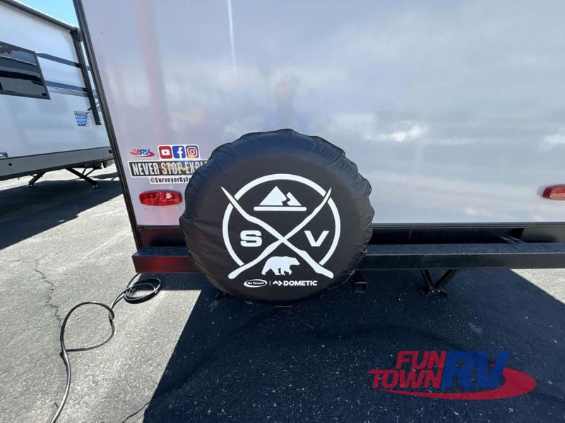 With any Surveyor Legend travel trailer by Forest River you will enjoy quality craftsmanship, convenient amenities, and at-home comforts. The Azdel composite walls provide a longer-lasting trailer, and the power tongue jack with a hitch light will get you back on the road in no-time. There are also Goodyear tires and a tire pressure monitoring system for hassle-free towing. Each model includes the Surveyor Legend Package that comes standard with oversized dinette storage access doors, front slam latch baggage doors, plus an automotive style tinted front windshield. You'll appreciate camping with a tankless water heater for endless hot showers, a 2" accessory hitch to bring bikes along, plus carpet-free interiors and a central vacuum system for easy clean up.