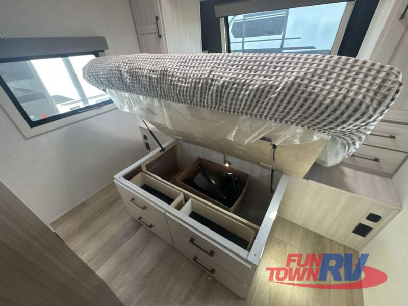 Whether you're camping with friends or family, you'll love the space and comfort found in this travel trailer. The outside kitchen is packed with features, such as a gas griddle, sink, refrigerator, and a shelf, plus there is a 21' electric awning for shade. Head inside to relax on the EZ- out sofa, or play a game at the booth dinette. You will also love the HD TV for your favorite shows at night. This model includes a full rear bath with a linen closet for clean towels and an upgraded slow-close shower door.