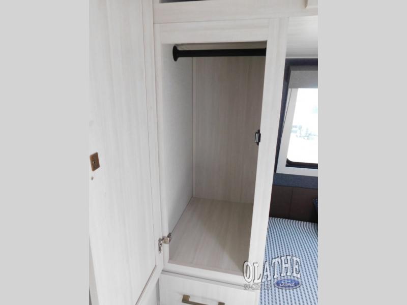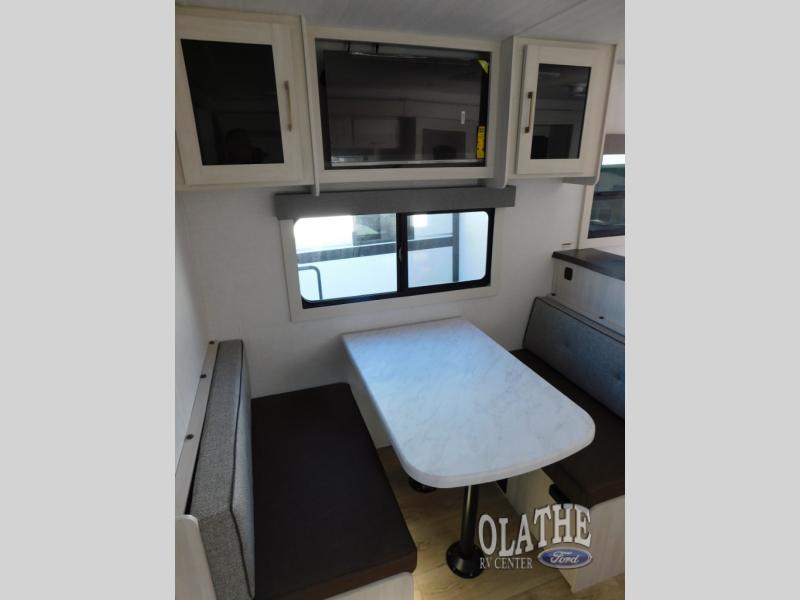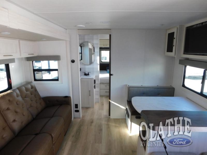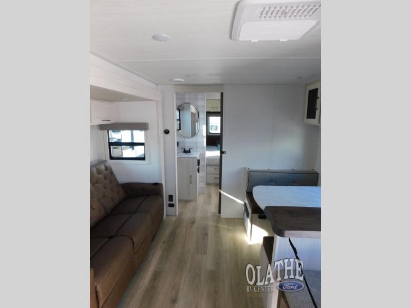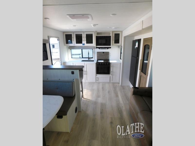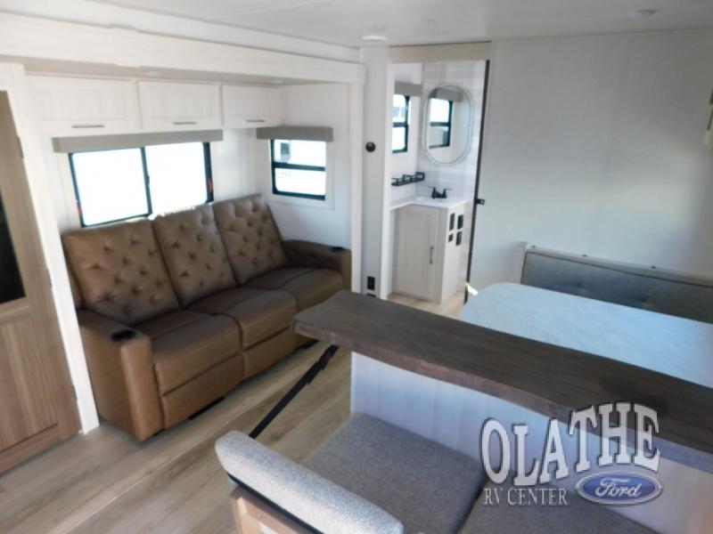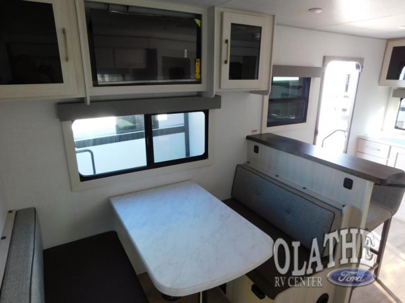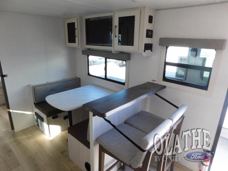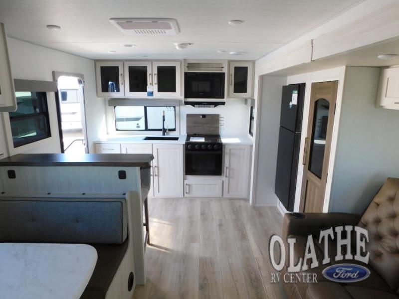 You'll love every minute spent in this cozy and convenient travel trailer. Since there are dual entry doors, you can enter in through the front master bedroom with a queen bed or the rear kitchen with ample counter space! A walk-thru bath will be easily accessible for everyone to use, and there is a night light here so you don't wake your crew up in the middle of the night. The EZ-out sofa slide in the main living area will provide a cozy seating space, as well as sleeping space for guests. And you can dine each day at the booth dinette or at the bartop with two seats that overlook the dinette!