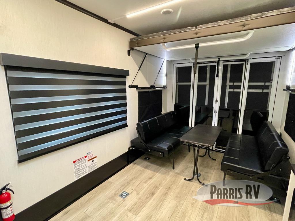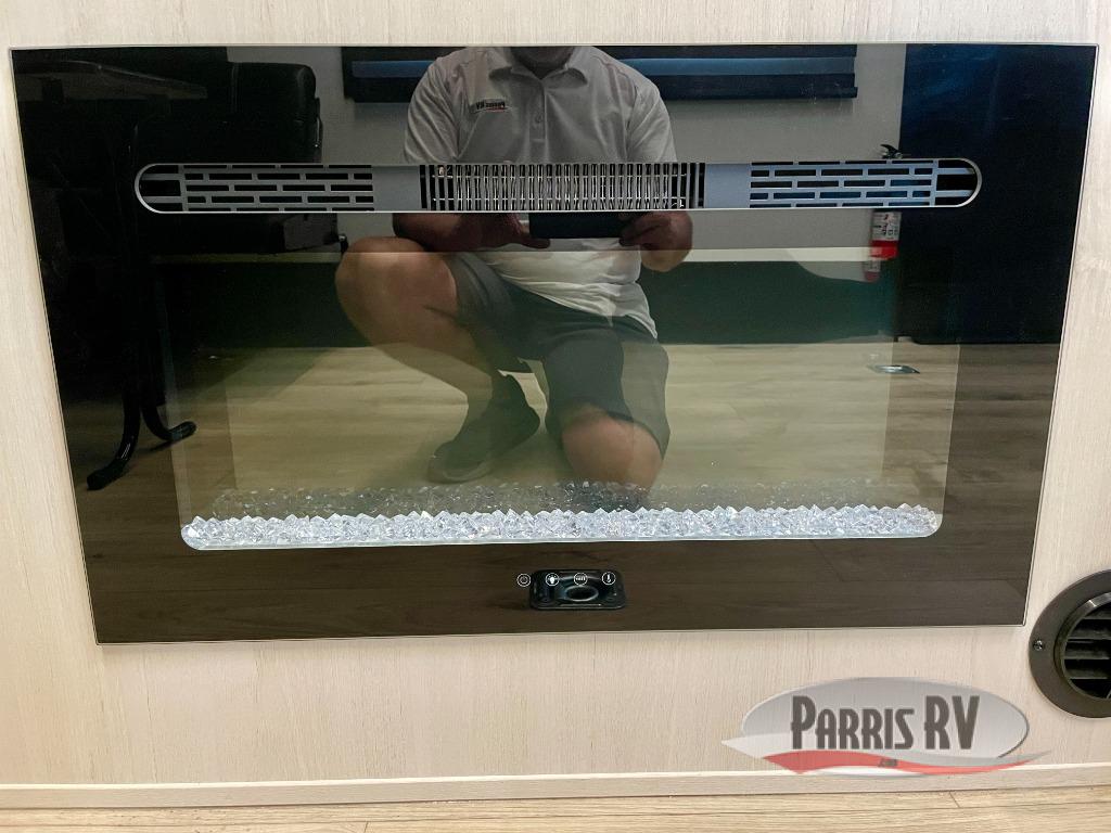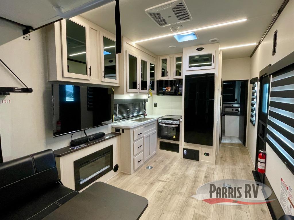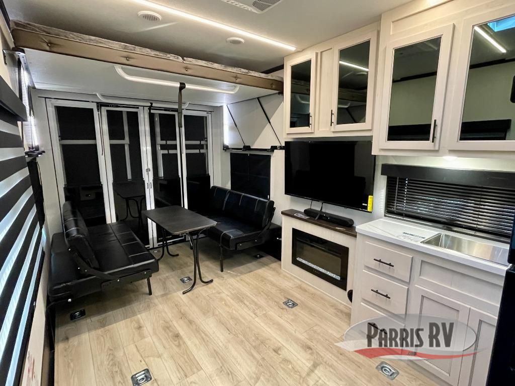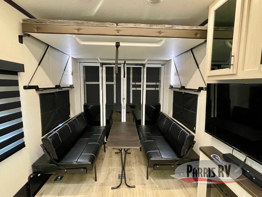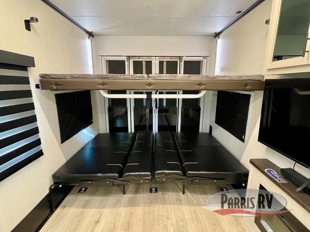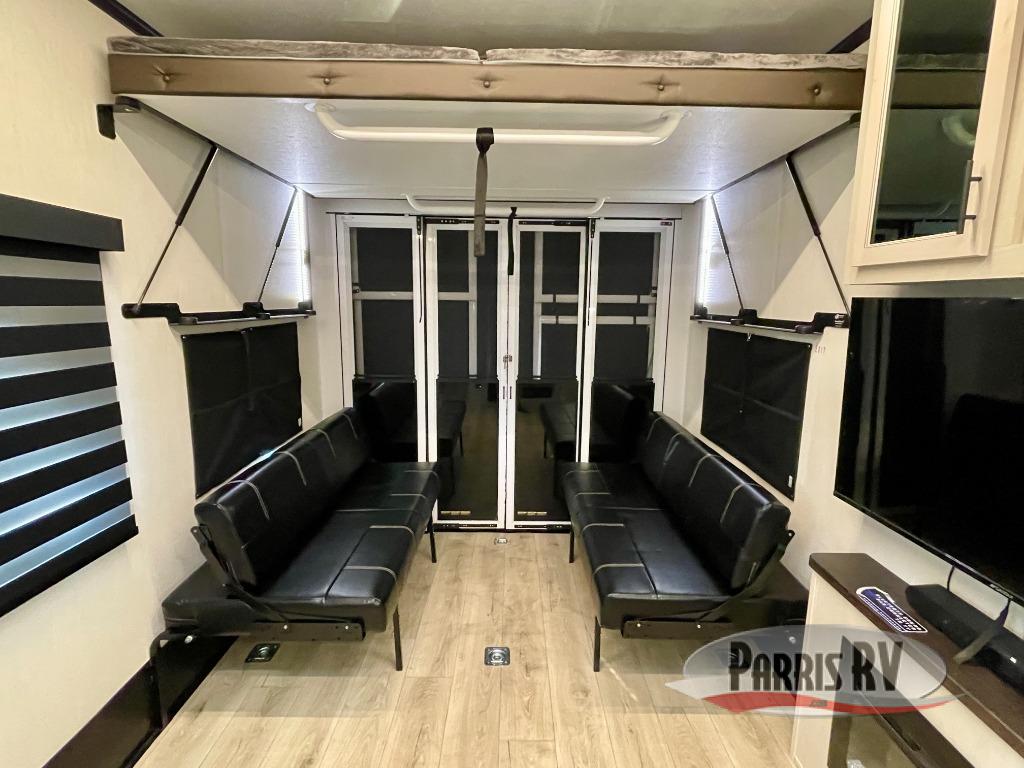 Head for the trails with this toy hauler in tow! Once your toys are unloaded from the 14' 1" garage, you can relax on the dual flip-up sofas with a queen bed above. There are also dual lounge chairs across from the entertainment center with a cozy fireplace and a hidden pantry behind for movies, games and more! The chef of your crew can make meals inside on the three burner cooktop, or head outdoors to utilize the outside kitchen. When you're ready to call it a night, retreat to the front private bedroom for a great night's rest on the trailer king bed slide out. There is also a large dresser here to keep your things organized.