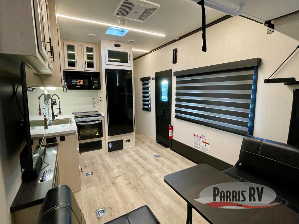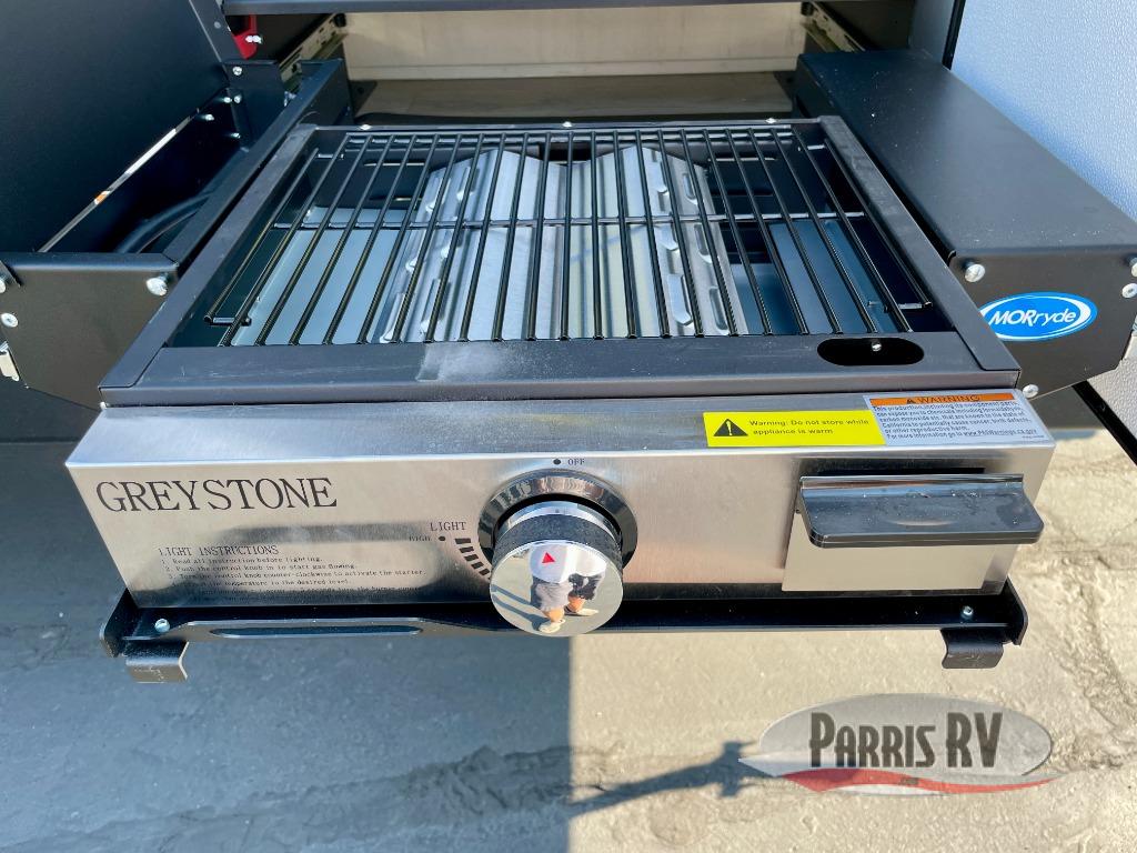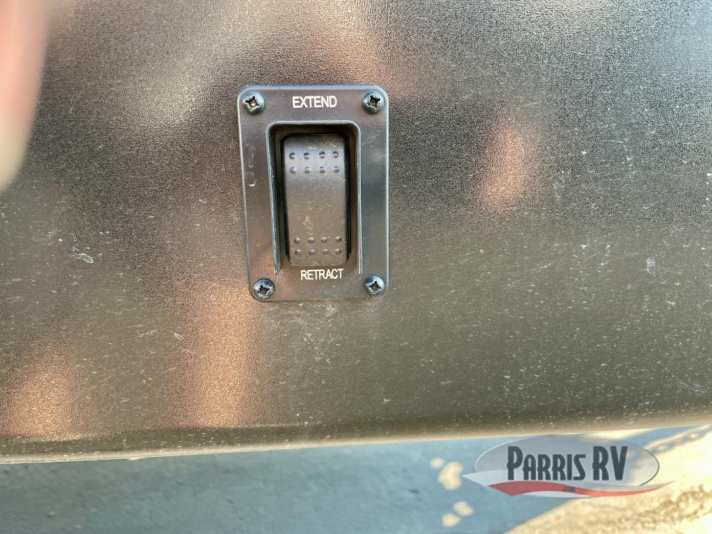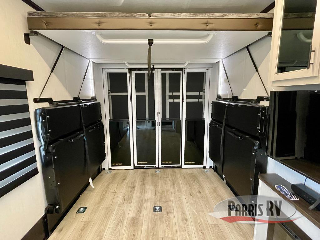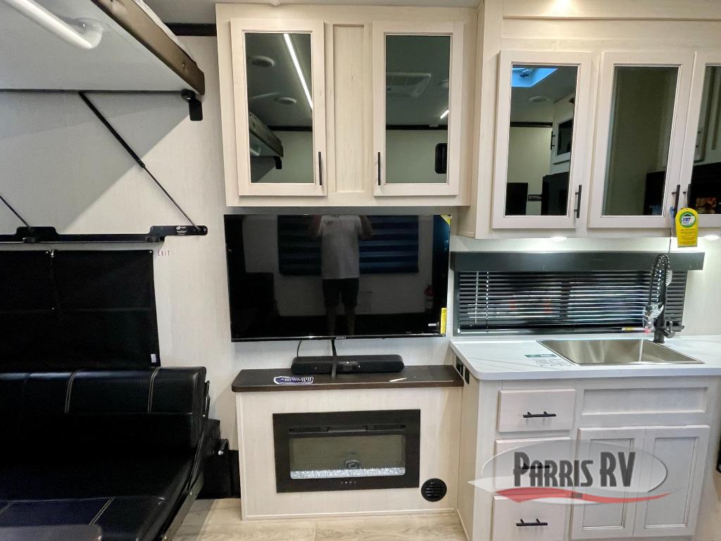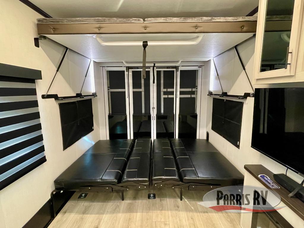 Head for the trails with this toy hauler in tow! Once your toys are unloaded from the 14' 1" garage, you can relax on the dual flip-up sofas with a queen bed above. There are also dual lounge chairs across from the entertainment center with a cozy fireplace and a hidden pantry behind for movies, games and more! The chef of your crew can make meals inside on the three burner cooktop, or head outdoors to utilize the outside kitchen. When you're ready to call it a night, retreat to the front private bedroom for a great night's rest on the trailer king bed slide out. There is also a large dresser here to keep your things organized.