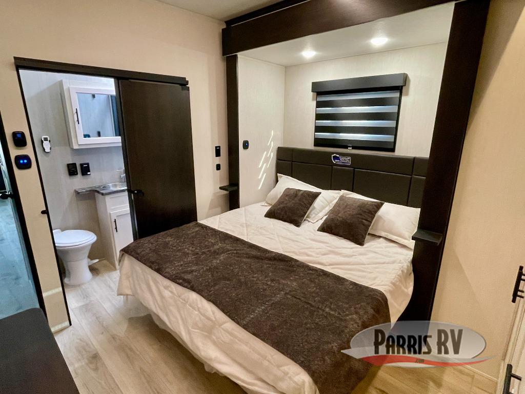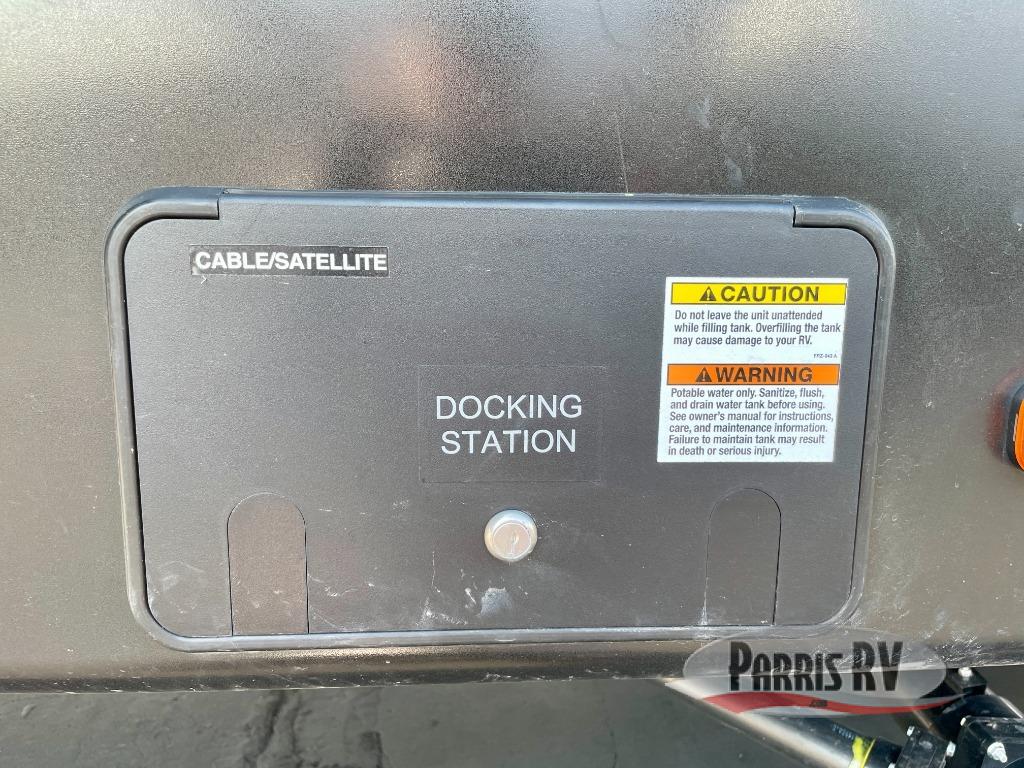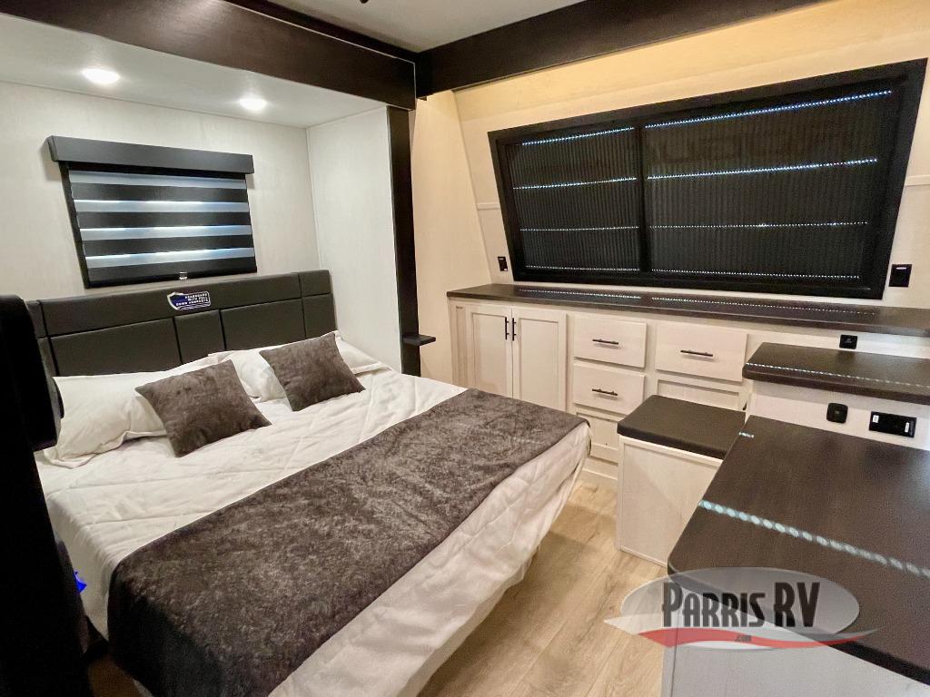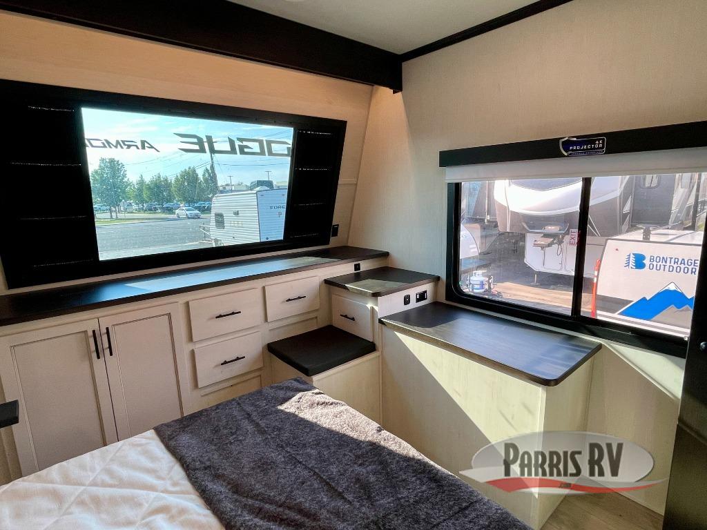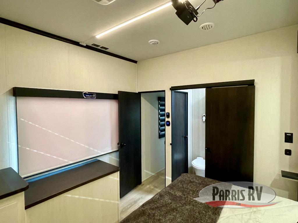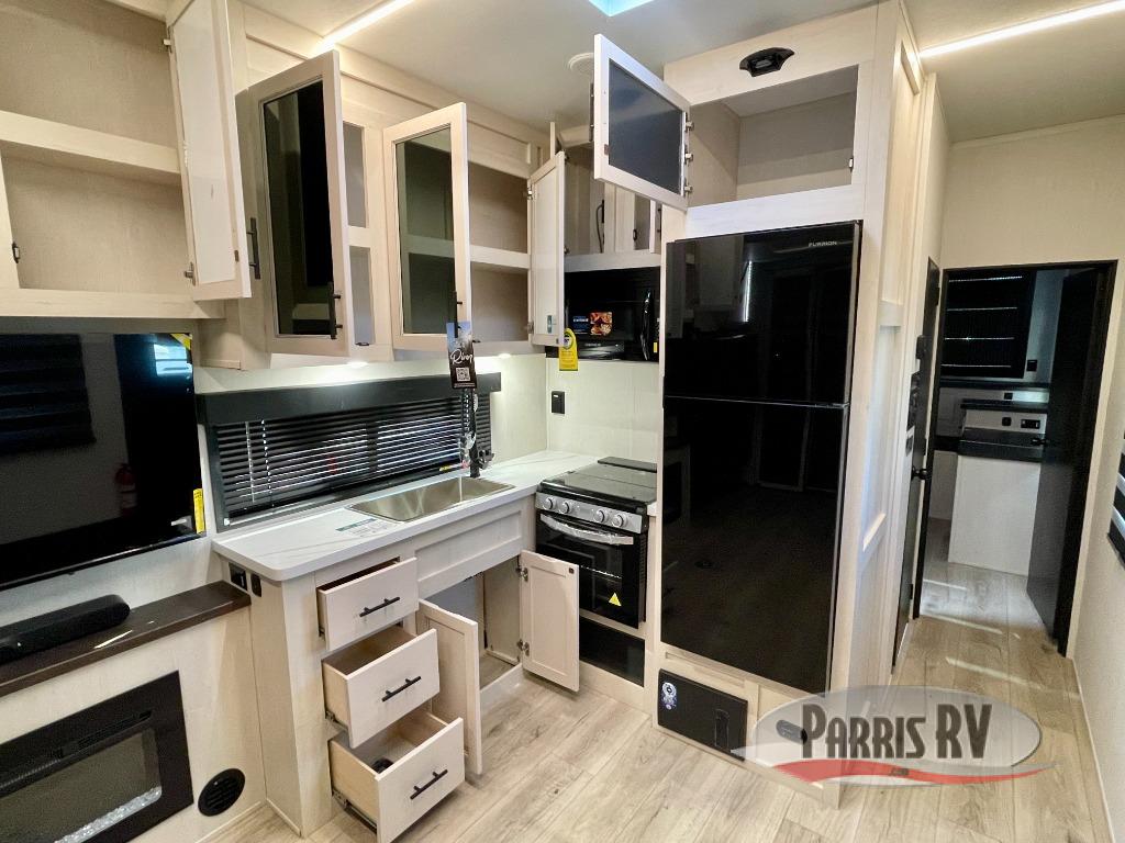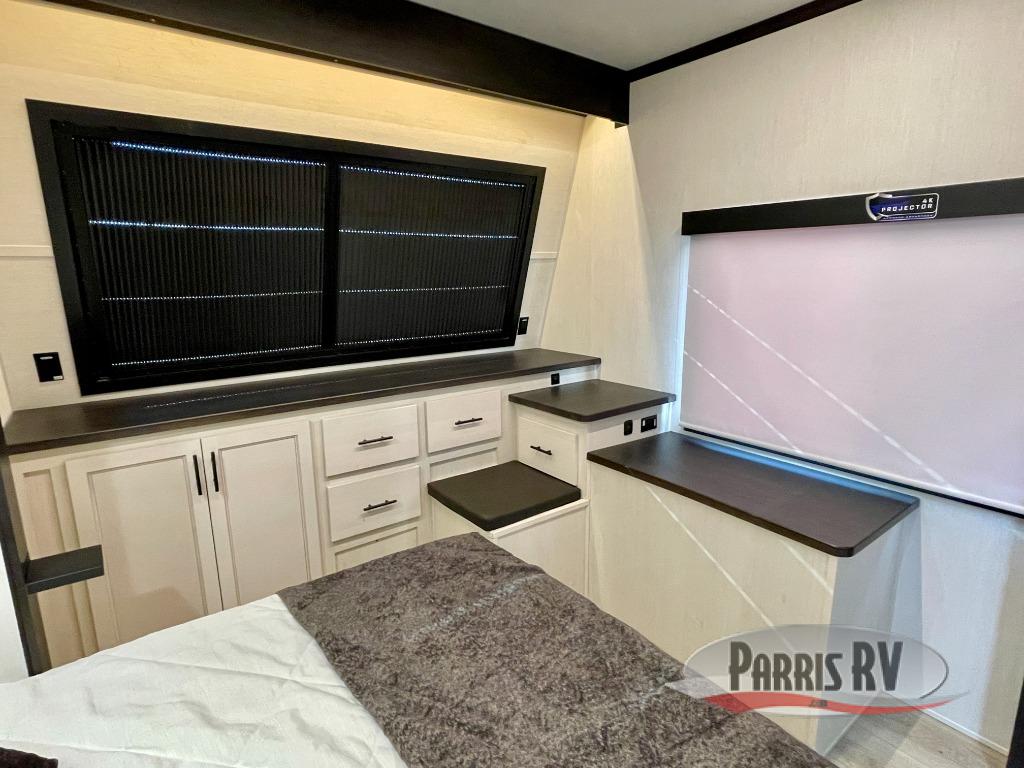 Head for the trails with this toy hauler in tow! Once your toys are unloaded from the 14' 1" garage, you can relax on the dual flip-up sofas with a queen bed above. There are also dual lounge chairs across from the entertainment center with a cozy fireplace and a hidden pantry behind for movies, games and more! The chef of your crew can make meals inside on the three burner cooktop, or head outdoors to utilize the outside kitchen. When you're ready to call it a night, retreat to the front private bedroom for a great night's rest on the trailer king bed slide out. There is also a large dresser here to keep your things organized.