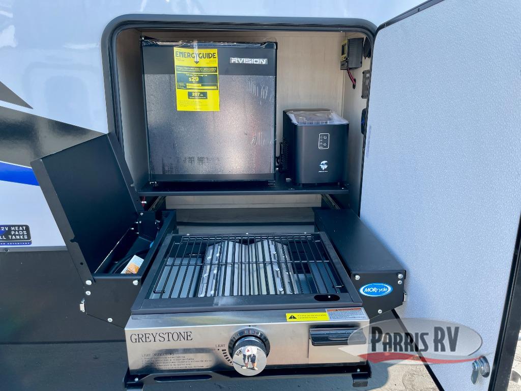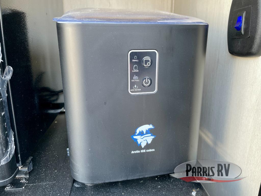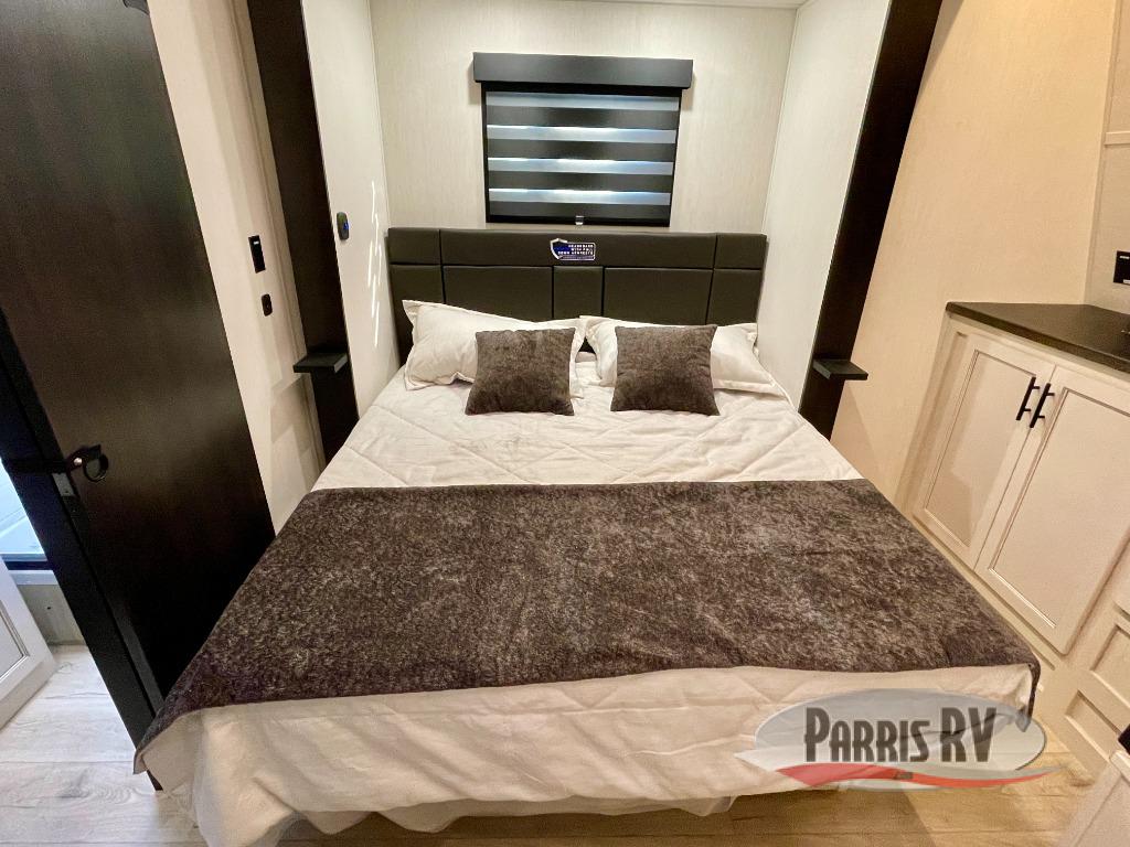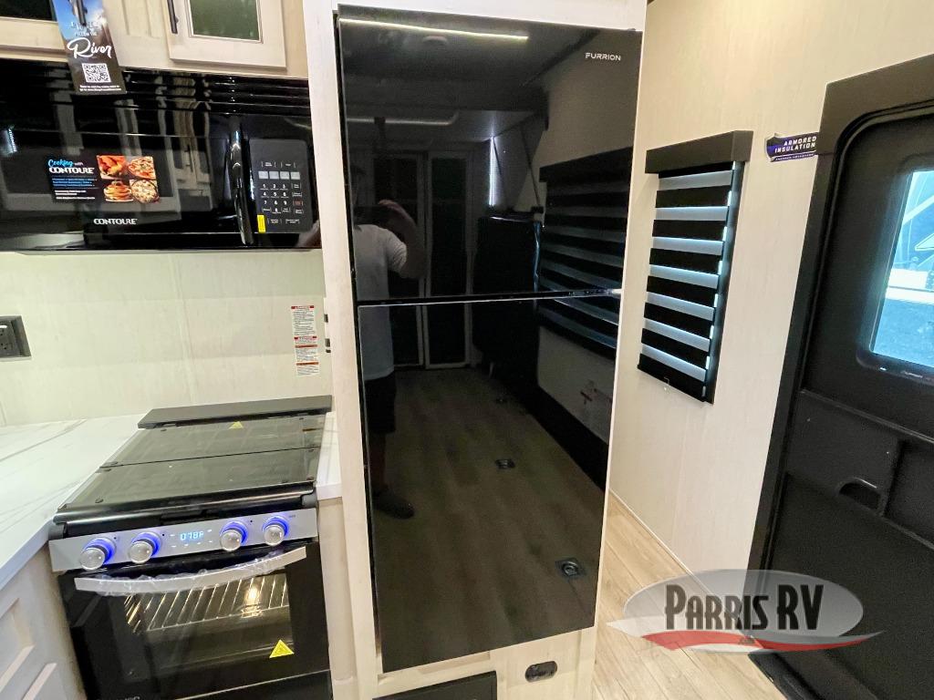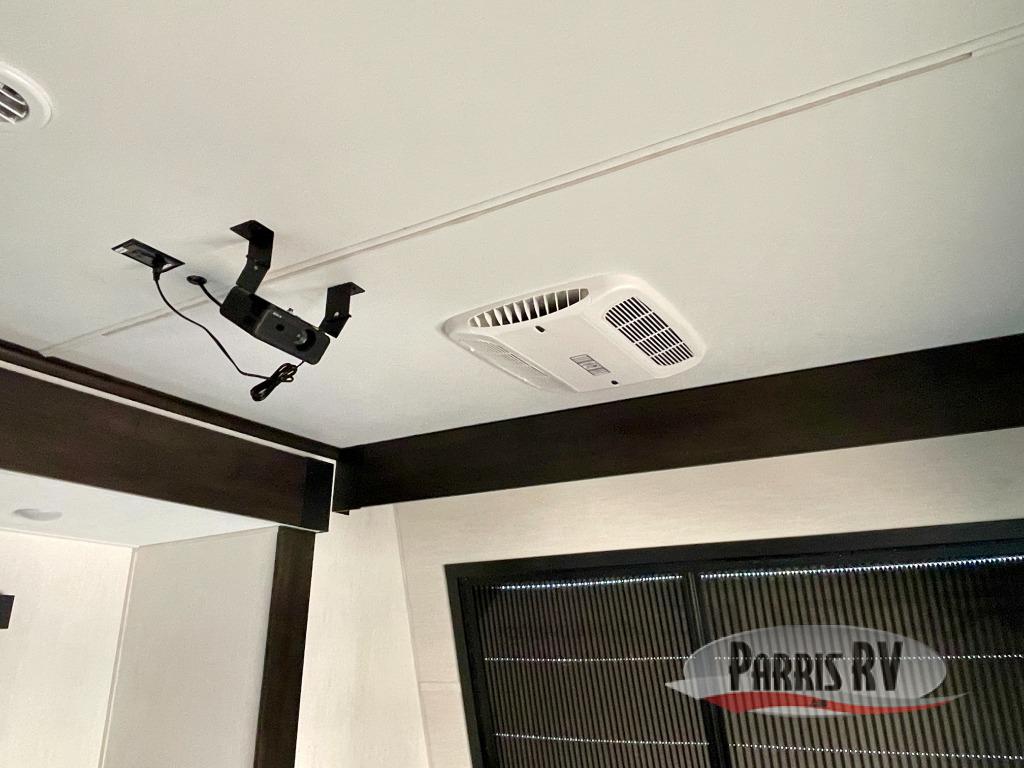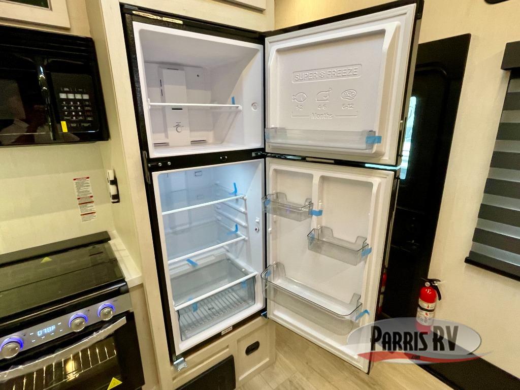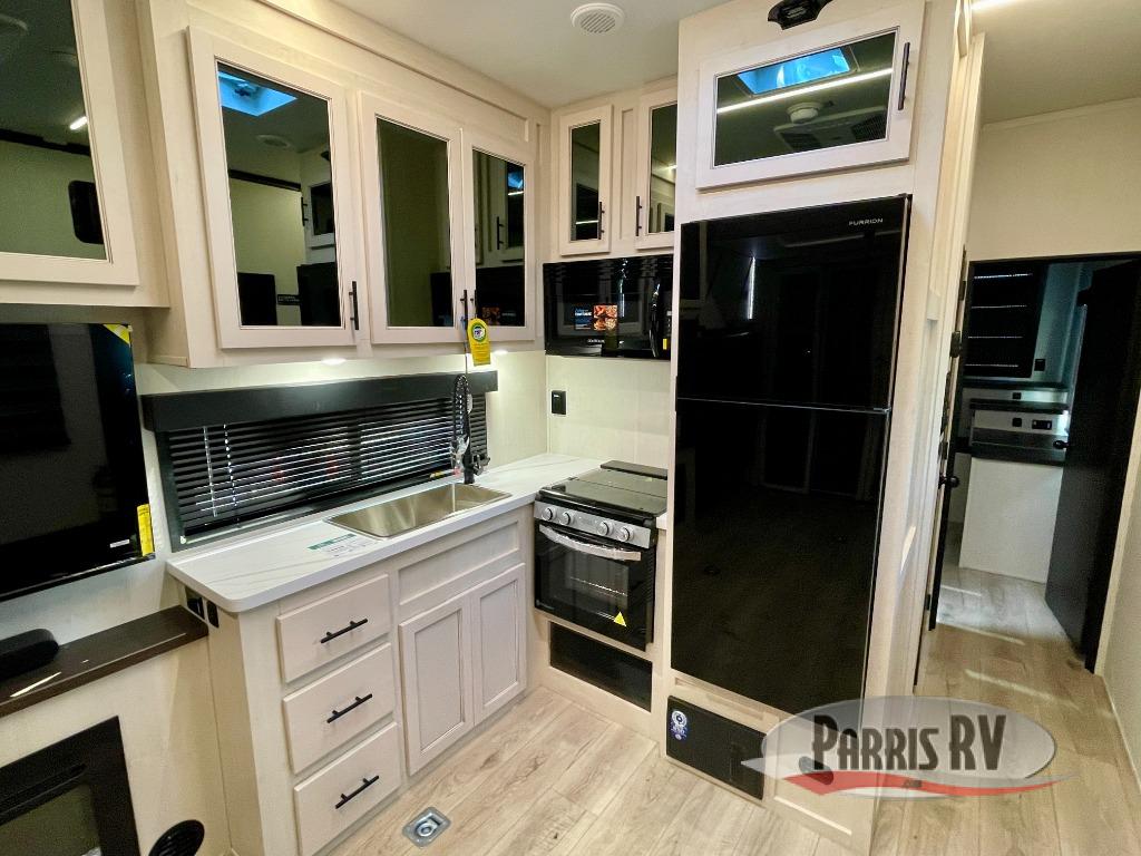Head for the trails with this toy hauler in tow! Once your toys are unloaded from the 14' 1" garage, you can relax on the dual flip-up sofas with a queen bed above. There are also dual lounge chairs across from the entertainment center with a cozy fireplace and a hidden pantry behind for movies, games and more! The chef of your crew can make meals inside on the three burner cooktop, or head outdoors to utilize the outside kitchen. When you're ready to call it a night, retreat to the front private bedroom for a great night's rest on the trailer king bed slide out. There is also a large dresser here to keep your things organized.