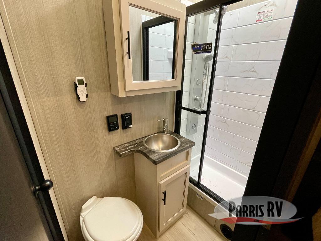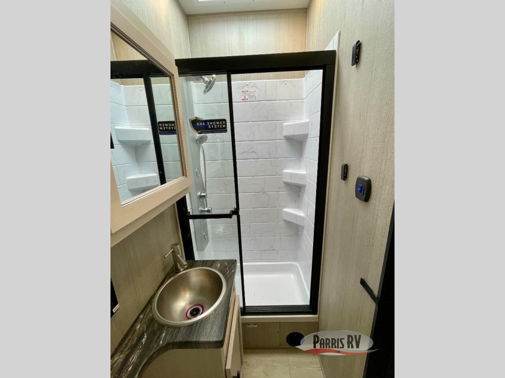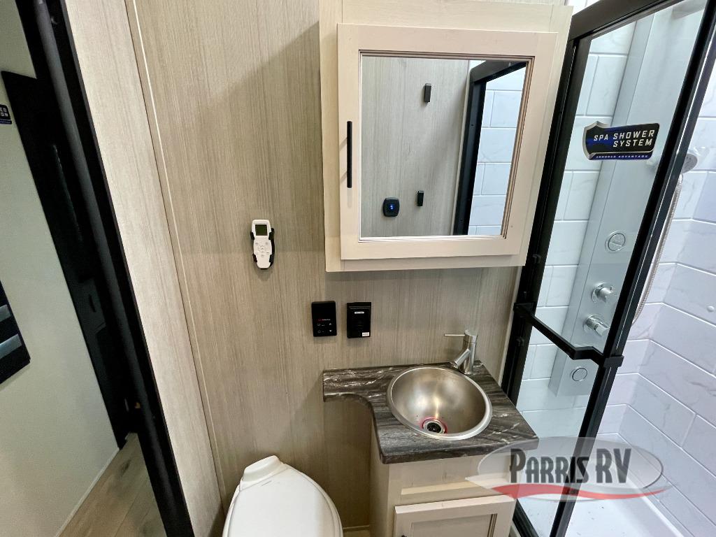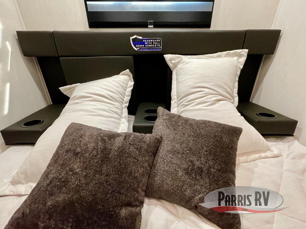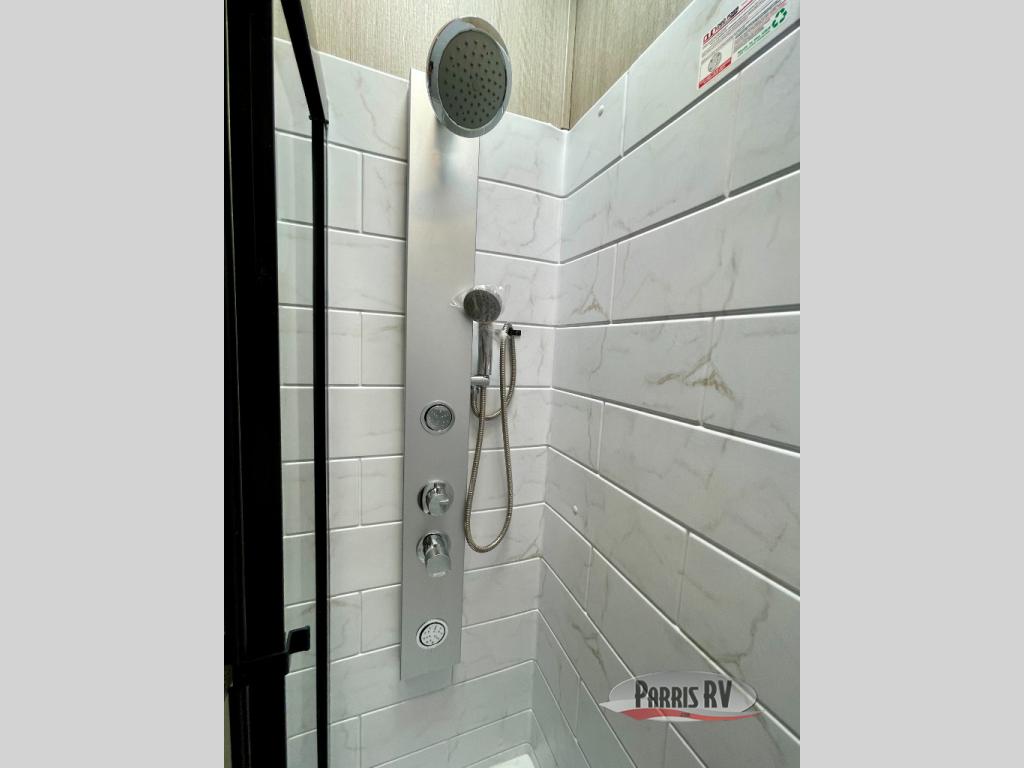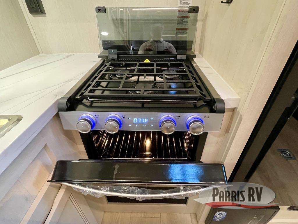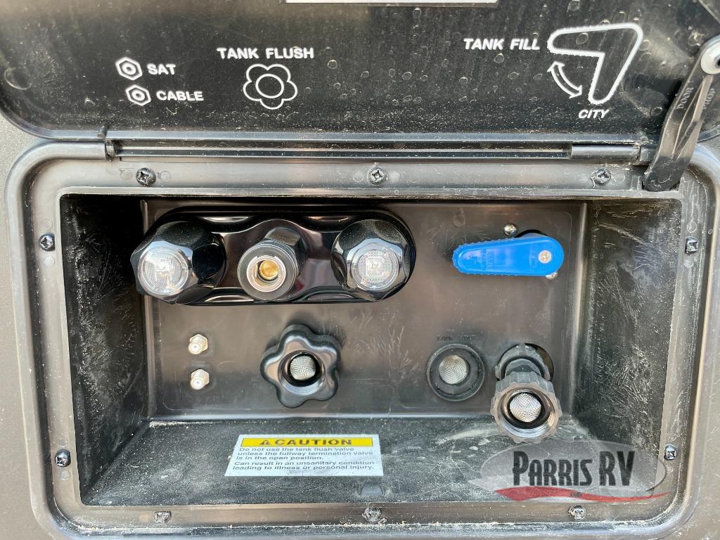 Head for the trails with this toy hauler in tow! Once your toys are unloaded from the 14' 1" garage, you can relax on the dual flip-up sofas with a queen bed above. There are also dual lounge chairs across from the entertainment center with a cozy fireplace and a hidden pantry behind for movies, games and more! The chef of your crew can make meals inside on the three burner cooktop, or head outdoors to utilize the outside kitchen. When you're ready to call it a night, retreat to the front private bedroom for a great night's rest on the trailer king bed slide out. There is also a large dresser here to keep your things organized.