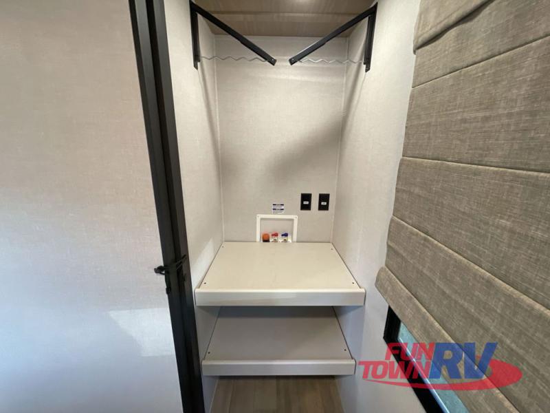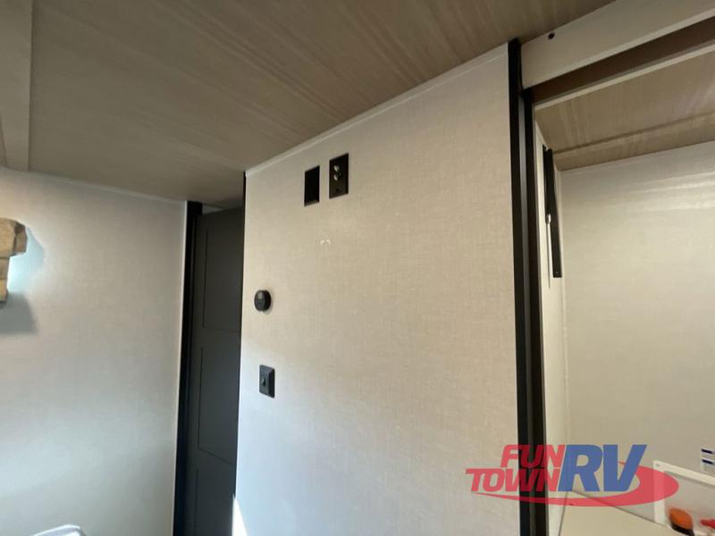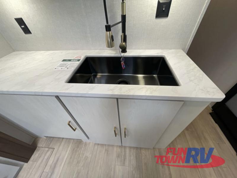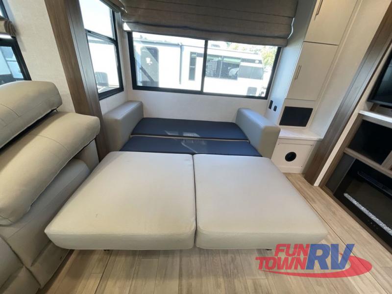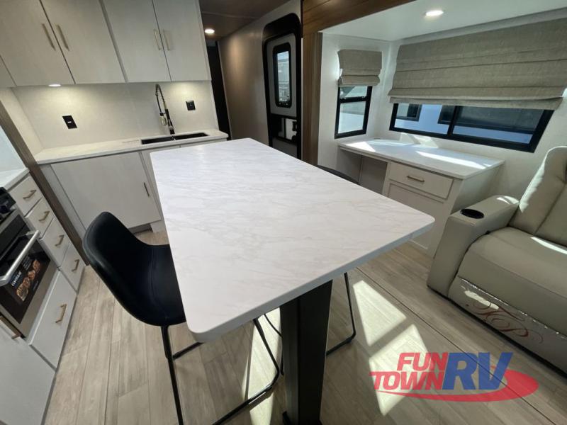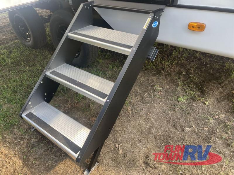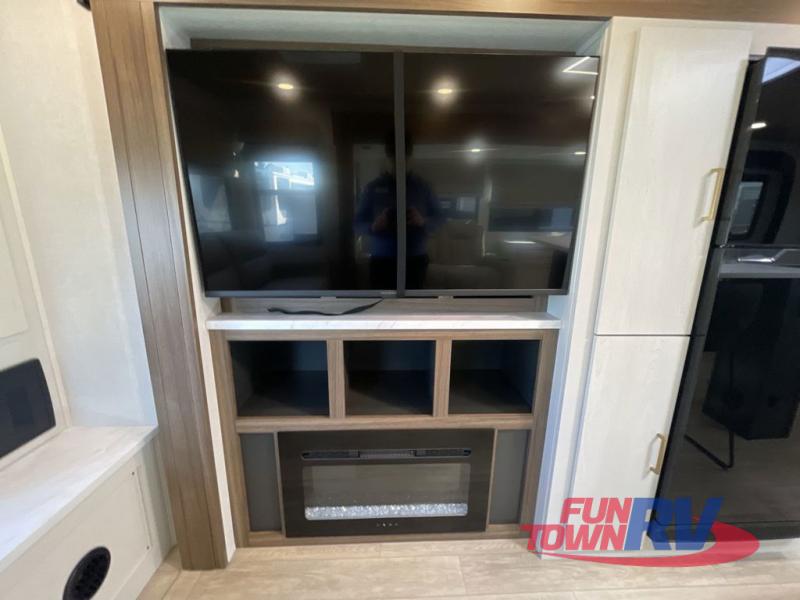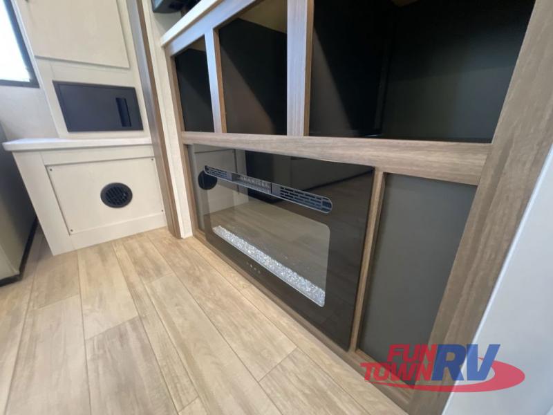 This travel trailer allows you to enjoy the great outdoors without having to give up your creature comforts. The dual opposing slides provide the chef space to work around the kitchen island, and there is plenty of seating space for your guests on the theater seatingĀ orĀ the sleeper sofa, plus there's a desk area with chair so you can work on the go. The fireplace with a TV above will be perfect for those rainy days, and there is even a large skylight to let natural light into the living room. This model also includes Sure-Step entry steps, pass-through storage, plus two power awnings with LED lights so you can spend more time outdoors with friends and family!